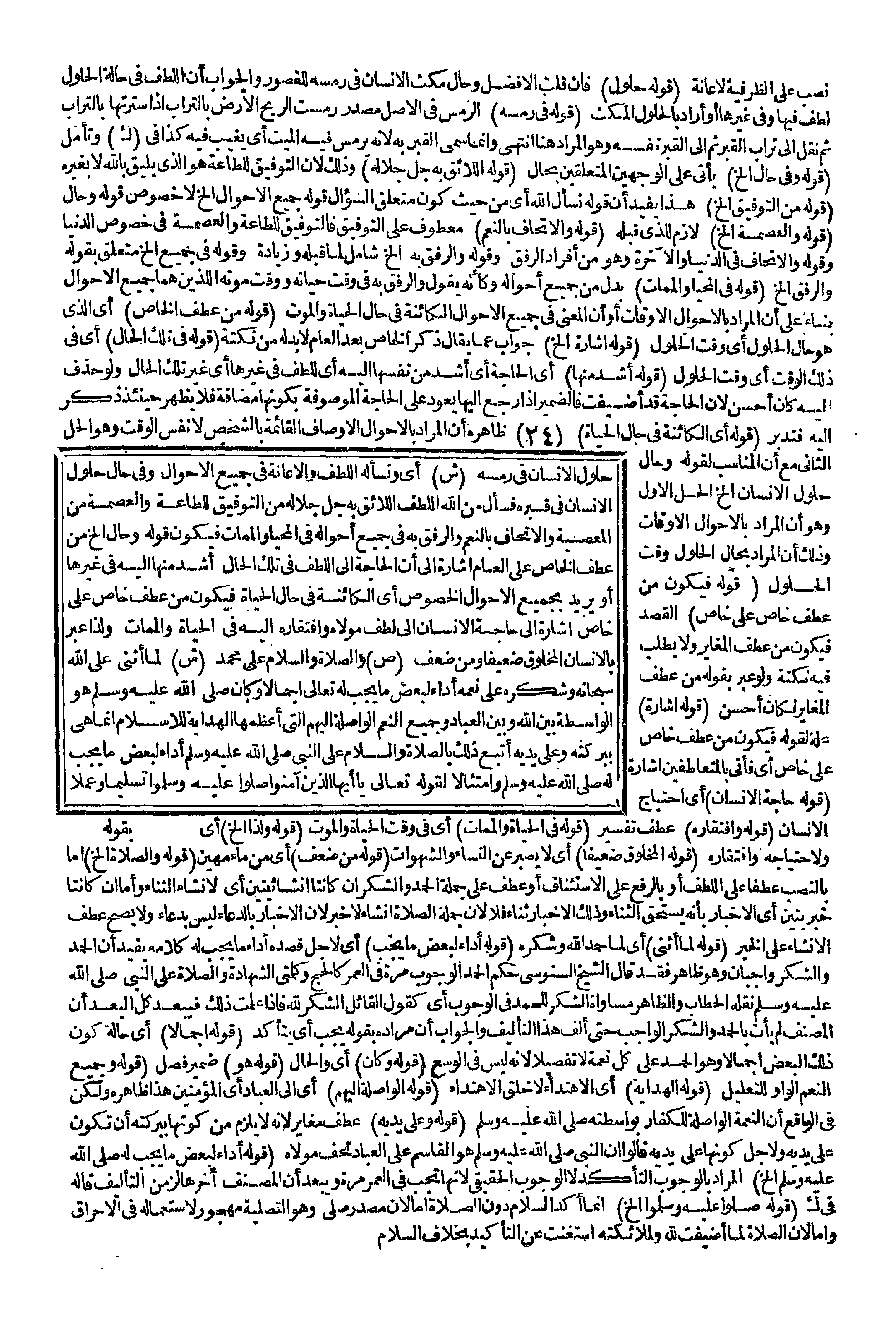 (قَوْلُهُ أَيْ الْكَائِنَةَ فِي حَالِ الْحَيَاةِ) ظَاهِرُهُ أَنَّ الْمُرَادَ بِالْأَحْوَالِ الْأَوْصَافُ الْقَائِمَةُ بِالشَّخْصِ لَا نَفْسُ الْوَقْتِ، وَهُوَ الْحَلُّ الثَّانِي مَعَ أَنَّ الْمُنَاسِبَ لِقَوْلِهِ وَحَالِ حُلُولِ الْإِنْسَانِ إلَخْ الْحَلُّ الْأَوَّلُ، وَهُوَ أَنَّ الْمُرَادَ بِالْأَحْوَالِ الْأَوْقَاتُ، وَذَلِكَ أَنَّ الْمُرَادَ بِحَالِ الْحُلُولِ وَقْتُ الْحُلُولِ (قَوْلُهُ فَيَكُونُ مِنْ عَطْفِ خَاصٍّ عَلَى خَاصٍّ) الْقَصْدُ فَيَكُونُ مِنْ عَطْفِ الْمُغَايِرِ وَلَا يُطْلَبُ فِيهِ نُكْتَةٌ وَلَوْ عَبَّرَ بِقَوْلِهِ مِنْ عَطْفِ الْمُغَايِرِ لَكَانَ أَحْسَنَ (قَوْلُهُ إشَارَةً) عِلَّةٌ لِقَوْلِهِ فَيَكُونُ مِنْ عَطْفِ خَاصٍّ عَلَى خَاصٍّ أَيْ فَأَتَى بِالْمُتَعَاطِفِينَ إشَارَةً (قَوْلُهُ حَاجَةِ الْإِنْسَانِ) أَيْ احْتِيَاجِ الْإِنْسَانِ (قَوْلُهُ وَافْتِقَارِهِ) عَطْفُ تَفْسِيرٍ (قَوْلُهُ فِي الْحَيَاةِ وَالْمَمَاتِ) أَيْ فِي وَقْتِ الْحَيَاةِ وَالْمَوْتِ (قَوْلُهُ وَلِذَا إلَخْ) أَيْ وَلِاحْتِيَاجِهِ وَافْتِقَارِهِ (قَوْلُهُ الْمَخْلُوقِ ضَعِيفًا) أَيْ لَا يَصْبِرُ عَنْ النِّسَاءِ وَالشَّهَوَاتِ (قَوْلُهُ مِنْ ضَعْفٍ) أَيْ مِنْ مَاءٍ مَهِينٍ (قَوْلُهُ وَالصَّلَاةُ إلَخْ) إمَّا بِالنَّصْبِ عَطْفًا عَلَى اللُّطْفِ أَوْ بِالرَّفْعِ عَلَى الِاسْتِئْنَافِ أَوْ عَطْفٌ عَلَى جُمْلَةِ الْحَمْدِ وَالشُّكْرِ إنْ كَانَتَا إنْشَائِيَّتَيْنِ أَيْ لِإِنْشَاءِ الثَّنَاءِ، وَأَمَّا إنْ كَانَتَا خَبَرِيَّتَيْنِ أَيْ الْإِخْبَارُ بِأَنَّهُ يَسْتَحِقُّ الثَّنَاءَ وَذَلِكَ الْإِخْبَارُ ثَنَاءٌ فَلَا؛ لِأَنَّ جُمْلَةَ الصِّلَةِ إنْشَاءٌ لَا خَبَرٌ؛ لِأَنَّ الْإِخْبَارَ بِالدُّعَاءِ لَيْسَ بِدُعَاءٍ وَلَا يَصِحُّ عَطْفُ الْإِنْشَاءِ عَلَى الْخَبَرِ (قَوْلُهُ لَمَّا أَثْنَى) أَيْ لَمَّا حَمِدَ اللَّهَ وَشَكَرَهُ (قَوْلُهُ أَدَاءً لِبَعْضِ مَا يَجِبُ) أَيْ لِأَجْلِ قَصْدِهِ أَدَاءَ مَا يَجِبُ لَهُ كَلَامُهُ يُفِيدُ أَنَّ الْحَمْدَ وَالشُّكْرَ وَاجِبَانِ، وَهُوَ ظَاهِرٌ فَقَدْ قَالَ الشَّيْخُ السَّنُوسِيُّ حُكْمُ الْحَمْدِ الْوُجُوبُ مَرَّةً فِي الْعُمُرِ كَالْحَجِّ وَكَلِمَتَيْ الشَّهَادَةِ وَالصَّلَاةِ عَلَى النَّبِيِّ - صَلَّى اللَّهُ عَلَيْهِ وَسَلَّمَ - نَقَلَهُ الْحَطَّابُ وَالظَّاهِرُ مُسَاوَاةُ الشُّكْرِ لِلْحَمْدِ فِي الْوُجُوبِ أَيْ كَقَوْلِ الْقَائِلِ الشُّكْرُ لِلَّهِ فَإِذَا عَلِمْت ذَلِكَ فَيَبْعُدُ كُلُّ الْبُعْدِ أَنَّ الْمُصَنِّفَ لَمْ يَأْتِ بِالْحَمْدِ وَالشُّكْرِ الْوَاجِبِ حَتَّى أَلَّفَ هَذَا التَّأْلِيفَ.