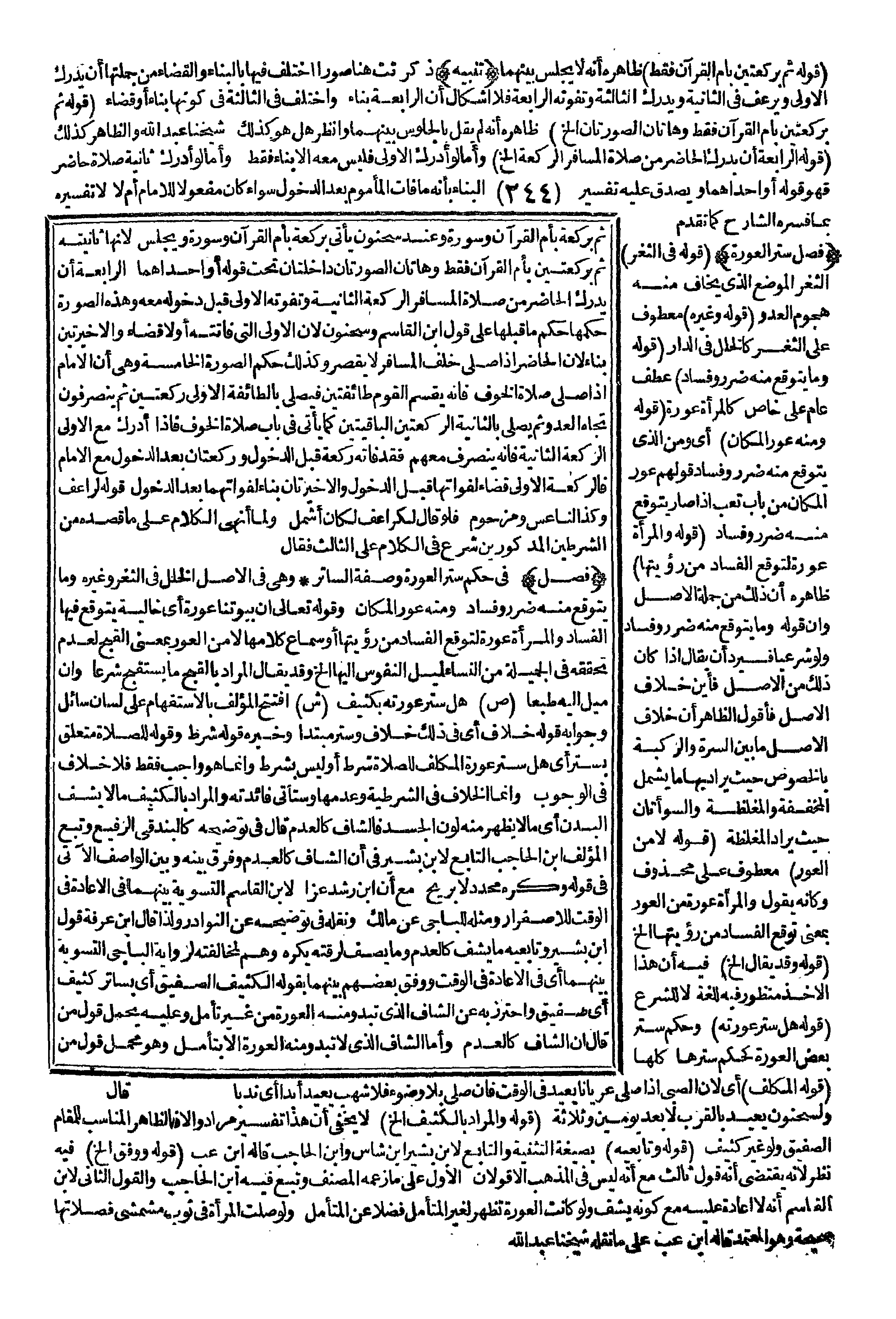 (قَوْلُهُ وَالْمَرْأَةُ عَوْرَةٌ لِتَوَقُّعِ الْفَسَادِ مِنْ رُؤْيَتِهَا) ظَاهِرُهُ أَنَّ ذَلِكَ مِنْ جُمْلَةِ الْأَصْلِ وَأَنَّ قَوْلَهُ وَمَا يُتَوَقَّعُ مِنْهُ ضَرَرٌ وَفَسَادٌ وَلَوْ شَرْعِيًّا، فَيَرِدُ أَنْ يُقَالَ: إذَا كَانَ ذَلِكَ مِنْ الْأَصْلِ فَأَيْنَ خِلَافُ الْأَصْلِ فَأَقُولُ الظَّاهِرُ أَنَّ خِلَافَ الْأَصْلِ مَا بَيْنَ السُّرَّةِ وَالرُّكْبَةِ بِالْخُصُوصِ حَيْثُ يُرَادُ بِهَا مَا يَشْمَلُ الْمُخَفَّفَةَ وَالْمُغَلَّظَةَ وَالسَّوْأَتَانِ حَيْثُ يُرَادُ الْمُغَلَّظَةُ.