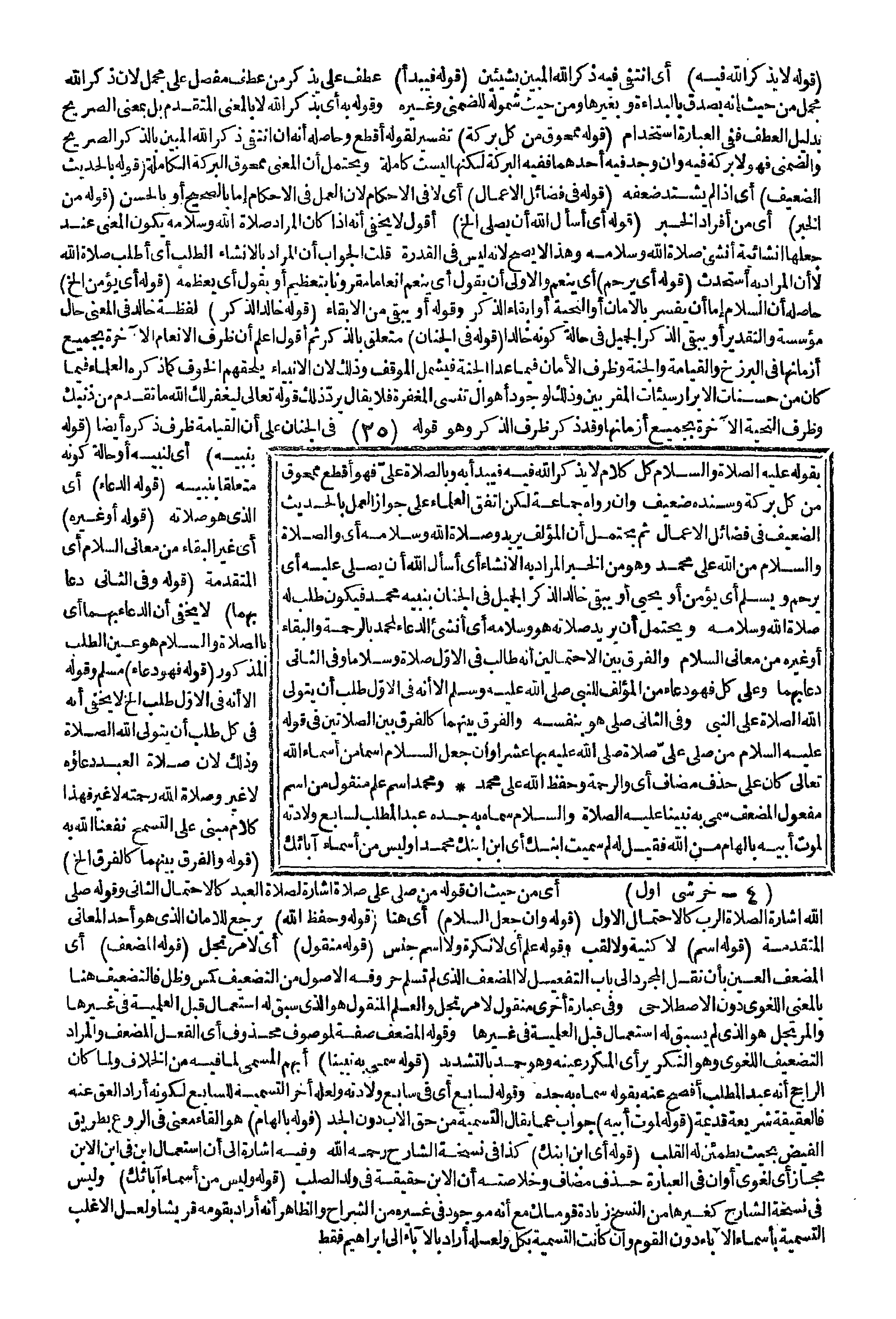 بِقَوْلِهِ - عَلَيْهِ الصَّلَاةُ وَالسَّلَامُ - «كُلُّ كَلَامٍ لَا يُذْكَرُ اللَّهُ فِيهِ فَيُبْدَأُ بِهِ وَبِالصَّلَاةِ عَلَيَّ فَهُوَ أَقْطَعُ مَمْحُوقٌ مِنْ كُلِّ بَرَكَةٍ» وَسَنَدُهُ ضَعِيفٌ، وَإِنْ رَوَاهُ جَمَاعَةٌ لَكِنْ اتَّفَقَ الْعُلَمَاءُ عَلَى جَوَازِ الْعَمَلِ بِالْحَدِيثِ الضَّعِيفِ فِي فَضَائِلِ الْأَعْمَالِ، ثُمَّ يُحْتَمَلُ أَنَّ الْمُؤَلِّفَ يُرِيدُ وَصَلَاةُ اللَّهِ وَسَلَامُهُ أَيْ وَالصَّلَاةُ وَالسَّلَامُ مِنْ اللَّهِ عَلَى مُحَمَّدٍ، وَهُوَ مِنْ الْخَبَرِ الْمُرَادُ بِهِ الْإِنْشَاءُ أَيْ أَسْأَلُ اللَّهَ أَنْ يُصَلِّيَ عَلَيْهِ أَيْ يَرْحَمَ وَيُسَلِّمَ أَيْ يُؤَمِّنُ أَوْ يُحْيِي أَوْ يَبْقَى خَالِدَ الذِّكْرِ الْجَمِيلِ فِي الْجِنَانِ بِنَبِيِّهِ مُحَمَّدٍ فَيَكُونُ طَلَبَ لَهُ صَلَاةَ اللَّهِ وَسَلَامَهُ.