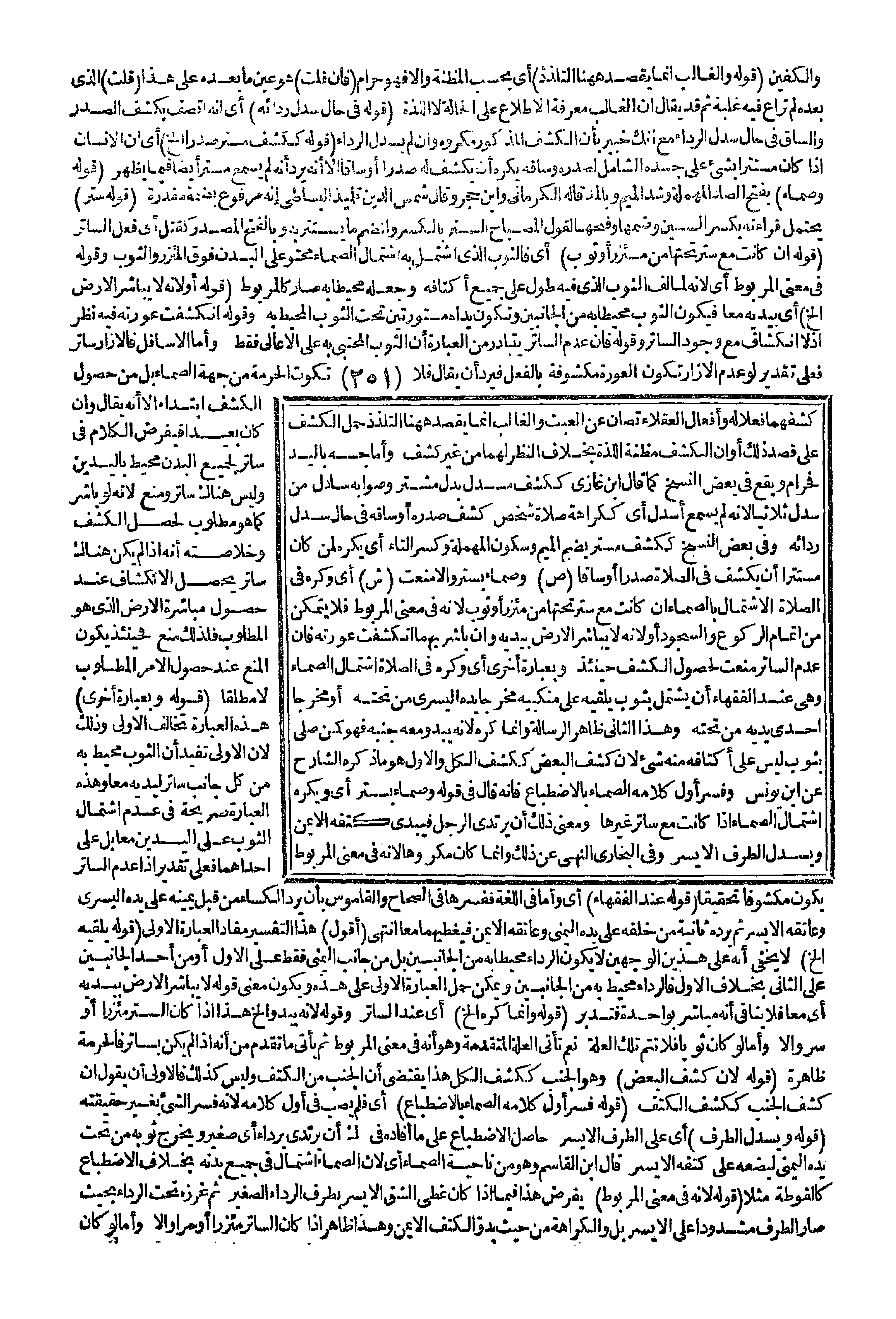 كَشْفُهُمَا فِعْلًا لَهُ وَأَفْعَالُ الْعُقَلَاءِ تُصَانُ عَنْ الْعَبَثِ وَالْغَالِبُ إنَّمَا يُقْصَدُ هَاهُنَا التَّلَذُّذُ حُمِلَ الْكَشْفُ عَلَى قَصْدِ ذَلِكَ أَوْ أَنَّ الْكَشْفَ مَظِنَّةُ اللَّذَّةِ بِخِلَافِ النَّظَرِ لَهُمَا مِنْ غَيْرِ كَشْفٍ وَأَمَّا جَسُّهُ بِالْيَدِ فَحَرَامٌ وَيَقَعُ فِي بَعْضِ النُّسَخِ كَمَا قَالَ ابْنُ غَازِيٍّ كَكَشْفِ مُسْدَلٍ بَدَلَ مُسْتِرٍ وَصَوَابُهُ سَادِلٌ مِنْ سَدَلَ ثُلَاثِيًّا؛ لِأَنَّهُ لَمْ يُسْمَعْ أَسْدَلَ أَيْ كَكَرَاهَةِ صَلَاةِ شَخْصٍ كَشَفَ صَدْرَهُ أَوْ سَاقَهُ فِي حَالِ سَدْلِ رِدَائِهِ وَفِي بَعْضِ النُّسَخِ كَكَشْفِ مُسْتَرٍ بِضَمِّ الْمِيمِ وَسُكُونِ الْمُهْمَلَةِ وَكَسْرِ التَّاءِ أَيْ يُكْرَهُ لِمَنْ كَانَ مُسْتَتِرًا أَنْ يَكْشِفَ فِي الصَّلَاةِ صَدْرًا أَوْ سَاقًا.