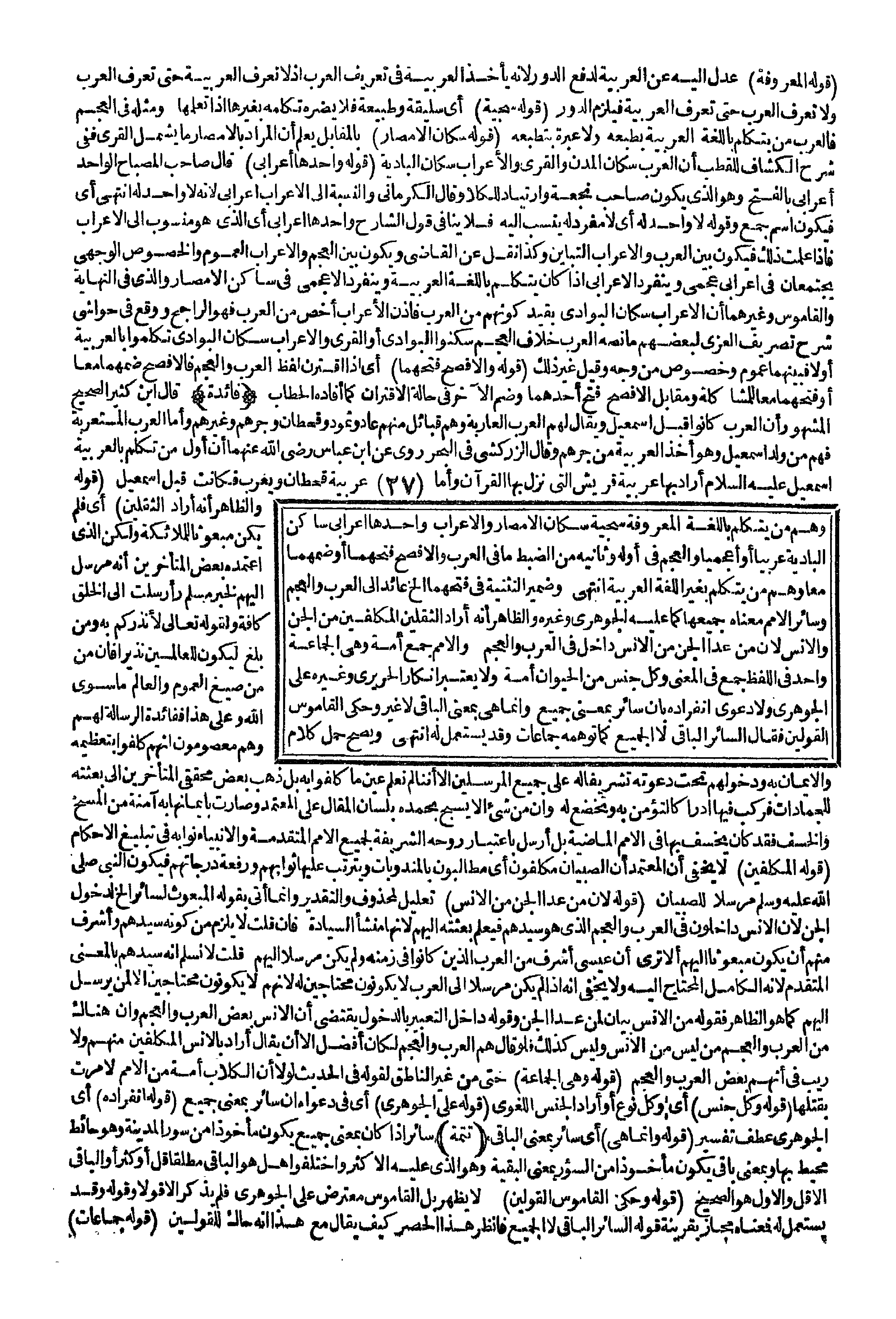 وَهُمْ مَنْ يَتَكَلَّمُ بِاللُّغَةِ الْمَعْرُوفَةِ سَجِيَّةً سُكَّانُ الْأَمْصَارِ وَالْأَعْرَابُ وَاحِدُهَا أَعْرَابِيٌّ سَاكِنُ الْبَادِيَةِ عَرَبِيًّا أَوْ أَعْجَمِيًّا وَالْعَجَمُ فِي أَوَّلِهِ وَثَانِيهِ مِنْ الضَّبْطِ مَا فِي الْعَرَبِ وَالْأَفْصَحُ فَتْحُهُمَا أَوْ ضَمُّهُمَا مَعًا وَهُمْ مَنْ يَتَكَلَّمُ بِغَيْرِ اللُّغَةِ الْعَرَبِيَّةِ انْتَهَى وَضَمِيرُ التَّثْنِيَةِ فِي فَتْحِهِمَا إلَخْ عَائِدٌ إلَى الْعَرَبِ وَالْعَجَمِ وَسَائِرِ الْأُمَمِ مَعْنَاهُ جَمِيعُهَا كَمَا عَلَيْهِ الْجَوْهَرِيُّ وَغَيْرُهُ وَالظَّاهِرُ أَنَّهُ أَرَادَ الثَّقَلَيْنِ الْمُكَلَّفِينَ مِنْ الْجِنِّ وَالْإِنْسِ؛ لِأَنَّ مَنْ عَدَا الْجِنَّ مِنْ الْإِنْسِ دَاخِلٌ فِي الْعَرَبِ وَالْعَجَمِ وَالْأُمَمُ جَمْعُ أُمَّةٍ وَهِيَ الْجَمَاعَةُ وَاحِدٌ فِي اللَّفْظِ جَمْعٌ فِي الْمَعْنَى وَكُلُّ جِنْسٍ مِنْ الْحَيَوَانِ أُمَّةٌ وَلَا يُعْتَبَرُ إنْكَارُ الْحَرِيرِيِّ وَغَيْرِهِ عَلَى الْجَوْهَرِيِّ وَلَا دَعْوَى انْفِرَادِهِ بِأَنَّ سَائِرَ بِمَعْنَى جَمِيعٍ وَإِنَّمَا هِيَ بِمَعْنَى الْبَاقِي لَا غَيْرَ وَحَكَى الْقَامُوسُ الْقَوْلَيْنِ فَقَالَ السَّائِرُ الْبَاقِي لَا الْجَمِيعُ كَمَا تَوَهَّمَهُ جَمَاعَاتٌ وَقَدْ يُسْتَعْمَلُ لَهُ انْتَهَى وَيَصِحُّ حَمْلُ كَلَامِ
