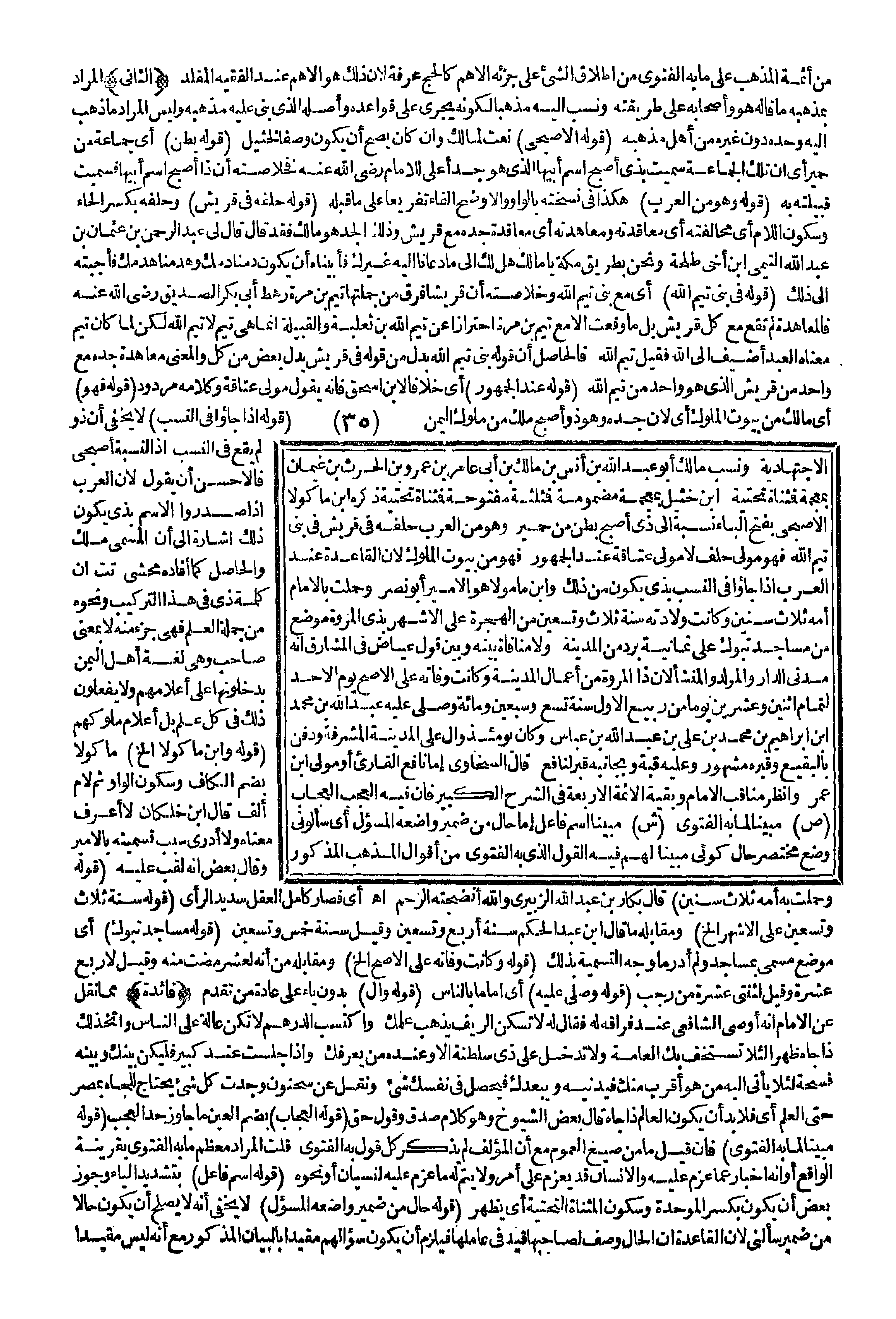 ـــــــــــــــــــــــــــــQمِنْ أَئِمَّةِ الْمَذْهَبِ عَلَى مَا بِهِ الْفَتْوَى مِنْ إطْلَاقِ الشَّيْءِ عَلَى جُزْئِهِ الْأَهَمِّ كَالْحَجِّ عَرَفَةُ؛ لِأَنَّ ذَلِكَ هُوَ الْأَهَمُّ عِنْدَ الْفَقِيهِ الْمُقَلِّدِ (الثَّانِي) الْمُرَادُ بِمَذْهَبِهِ مَا قَالَهُ هُوَ وَأَصْحَابُهُ عَلَى طَرِيقَتِهِ وَنُسِبَ إلَيْهِ مَذْهَبًا لِكَوْنِهِ يَجْرِي عَلَى قَوَاعِدِهِ وَأَصْلُهُ الَّذِي بُنِيَ عَلَيْهِ مَذْهَبُهُ، وَلَيْسَ الْمُرَادُ مَا ذَهَبَ إلَيْهِ وَحْدَهُ دُونَ غَيْرِهِ مِنْ أَهْلِ مَذْهَبِهِ (قَوْلُهُ الْأَصْبَحِيُّ) نَعْتٌ لِمَالِكٍ، وَإِنْ كَانَ يَصِحُّ أَنْ يَكُونَ وَصْفًا لِخُثَيْلٍ (قَوْلُهُ بَطْنٌ) أَيْ جَمَاعَةٌ مِنْ حِمْيَرَ أَيْ إنَّ تِلْكَ الْجَمَاعَةِ سُمِّيَتْ بِذِي أَصْبَحَ اسْمِ أَبِيهَا الَّذِي هُوَ جَدٌّ أَعْلَى لِلْإِمَامِ - رَضِيَ اللَّهُ عَنْهُ - فَخُلَاصَتُهُ أَنَّ ذَا أُصْبِحَ اسْمُ أَبِيهَا فَسُمِّيَتْ قَبِيلَتُهُ بِهِ (قَوْلُهُ: وَهُوَ مِنْ الْعَرَبِ) هَكَذَا فِي نُسْخَتِهِ بِالْوَاوِ وَالْأَوْضَحُ الْفَاءُ تَفْرِيعًا عَلَى مَا قَبْلَهُ (قَوْلُهُ حِلْفُهُ فِي قُرَيْشٍ) وَحِلْفُهُ بِكَسْرِ الْحَاءِ وَسُكُونِ اللَّامِ أَيْ مُخَالَفَتُهُ أَيْ مُعَاقَدَتُهُ وَمُعَاهَدَتُهُ أَيْ مُعَاقَدَةُ جَدِّهِ مَعَ قُرَيْشٍ وَذَلِكَ الْجَدُّ هُوَ مَالِكٌ فَقَدْ قَالَ قَالَ لِي عَبْدُ الرَّحْمَنِ بْنُ عُثْمَانَ بْنِ عَبْدِ اللَّهِ التَّيْمِيِّ ابْنُ أَخِي طَلْحَةَ وَنَحْنُ بِطَرِيقِ مَكَّةَ يَا مَالِكُ هَلْ لَك إلَى مَا دَعَانَا إلَيْهِ غَيْرُك فَأَبَيْنَاهُ أَنْ يَكُونَ دَمُنَا دَمُك وَهَدْمُنَا هَدْمُك فَأَجَبْته إلَى ذَلِكَ (قَوْلُهُ فِي بَنِي تَيْمِ اللَّهِ) أَيْ مَعَ بَنِي تَيْمِ اللَّهِ وَخُلَاصَتُهُ أَنَّ قُرَيْشًا فِرَقٌ مِنْ جُمْلَتِهَا تَيْمُ بْنُ مَرَّةَ رَهْطُ أَبِي بَكْرِ الصِّدِّيقِ - رَضِيَ اللَّهُ عَنْهُ - فَالْمُعَاهَدَةُ لَمْ تَقَعْ مَعَ كُلِّ قُرَيْشٍ بَلْ مَا وَقَعَتْ إلَّا مَعَ تَيْمِ بْنِ مُرَّةَ احْتِرَازًا عَنْ تَيْمِ اللَّهِ بْنِ ثَعْلَبَةَ وَالْقَبِيلَةُ إنَّمَا هِيَ تَيْمٌ لَا تَيْمُ اللَّهِ لَكِنْ لَمَّا كَانَ تَيْمُ مَعْنَاهُ الْعَبْدُ أُضِيفَ إلَى اللَّهِ فَقِيلَ تَيْمُ اللَّهِ.
