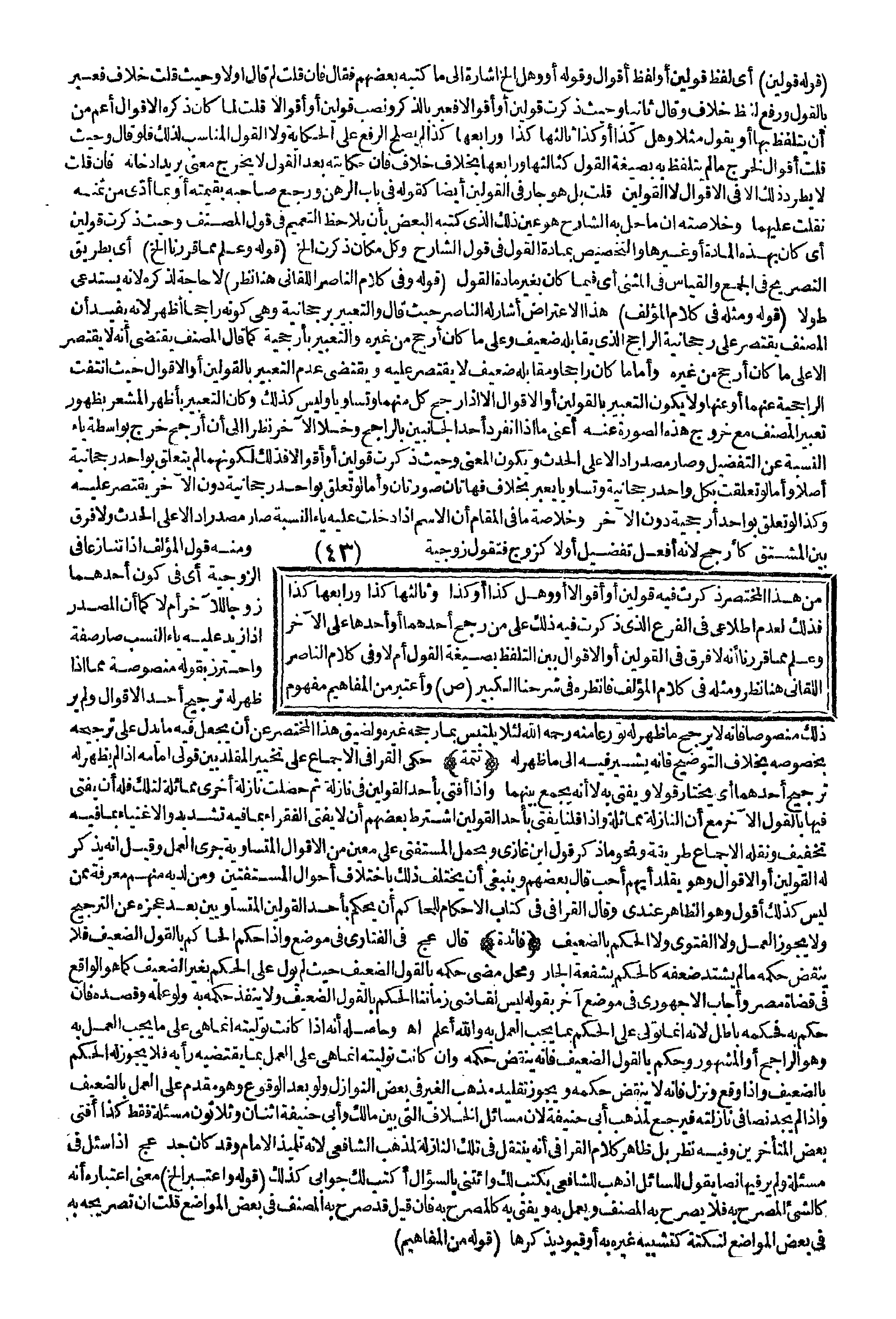 مِنْ هَذَا الْمُخْتَصَرِ ذَكَرْت فِيهِ قَوْلَيْنِ أَوْ أَقْوَالًا أَوْ وَهَلْ كَذَا أَوْ كَذَا وَثَالِثُهَا كَذَا وَرَابِعُهَا كَذَا فَذَلِكَ لِعَدَمِ اطِّلَاعِي فِي الْفَرْعِ الَّذِي ذَكَرْت فِيهِ ذَلِكَ عَلَى مَنْ رَجَّحَ أَحَدَهُمَا أَوْ أَحَدَهَا عَلَى الْآخَرِ وَعُلِمَ مِمَّا قَرَّرْنَا أَنَّهُ لَا فَرْقَ فِي الْقَوْلَيْنِ أَوْ الْأَقْوَالِ بَيْنَ التَّلَفُّظِ بِصِيغَةِ الْقَوْلِ أَمْ لَا وَفِي كَلَامِ النَّاصِرِ اللَّقَانِيِّ هُنَا نَظَرٌ وَمِثْلُهُ فِي كَلَامِ الْمُؤَلِّفِ فَانْظُرْهُ فِي شَرْحِنَا الْكَبِيرِ.