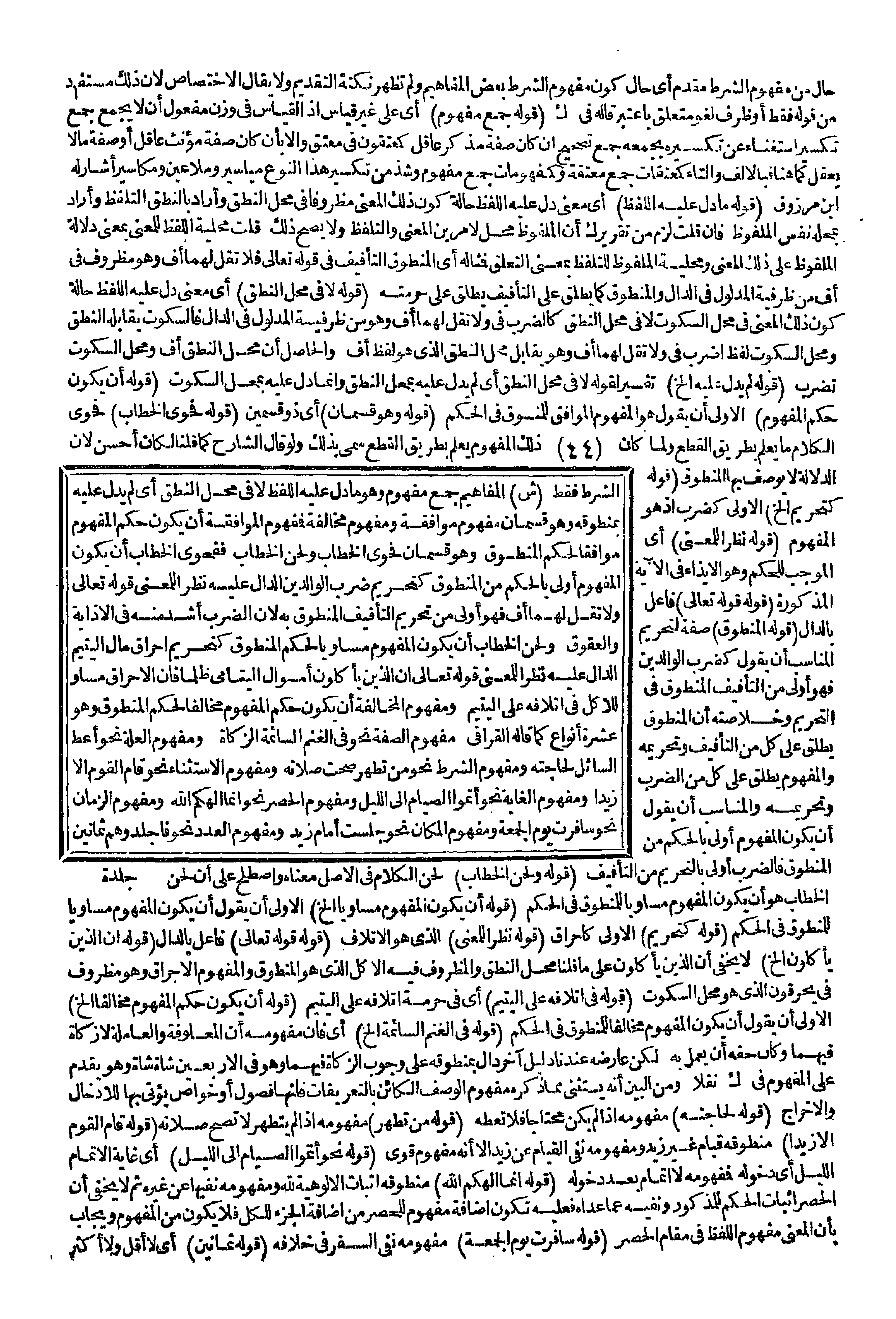 ـــــــــــــــــــــــــــــQحَالٌ مِنْ مَفْهُومِ الشَّرْطِ مُقَدَّمٌ أَيْ حَالُ كَوْنِ مَفْهُومِ الشَّرْطِ بَعْضُ الْمَفَاهِيمِ وَلَمْ تَظْهَرْ نُكْتَةُ التَّقْدِيمِ وَلَا يُقَالُ الِاخْتِصَاصُ؛ لِأَنَّ ذَلِكَ مُسْتَفَادٌ مِنْ قَوْلِهِ فَقَطْ أَوْ ظَرْفٌ لَغْوٌ مُتَعَلِّقٌ بِأَعْتَبِرُ قَالَ فِي ك (قَوْلُهُ جَمْعُ مَفْهُومٍ) أَيْ عَلَى غَيْرِ قِيَاسٍ إذْ الْقِيَاسُ فِي وَزْنِ مَفْعُولٍ أَنْ لَا يُجْمَعَ جَمْعَ تَكْسِيرٍ اسْتِغْنَاءً عَنْ تَكْسِيرِهِ بِجَمْعِهِ جَمْعَ تَصْحِيحٍ إنْ كَانَ صِفَةَ مُذَكَّرٍ عَاقِلٍ كَمُعْتَقُونَ فِي مُعْتَقٍ وَإِلَّا بِأَنْ كَانَ صِفَةَ مُؤَنَّثٍ عَاقِلٍ أَوْ صِفَةَ مَا لَا يَعْقِلُ كَمَا هُنَا فَبِالْأَلِفِ وَالتَّاءِ كَمُعْتَقَاتٍ جَمْعُ مُعْتَقَةٍ وَكَمَفْهُومَاتِ جَمْعُ مَفْهُومٍ وَشَذَّ مِنْ تَكْسِيرِ هَذَا النَّوْعِ مَيَاسِيرُ وَمَلَاعِينُ وَمَكَاسِيرُ أَشَارَ لَهُ ابْنُ مَرْزُوقٍ (قَوْلُهُ مَا دَلَّ عَلَيْهِ اللَّفْظُ) أَيْ مَعْنَى دَلَّ عَلَيْهِ اللَّفْظُ حَالَةَ كَوْنِ ذَلِكَ الْمَعْنَى مَظْرُوفًا فِي مَحَلِّ النُّطْقِ وَأَرَادَ بِالنُّطْقِ التَّلَفُّظَ وَأَرَادَ بِمَحَلِّهِ نَفْسَ الْمَلْفُوظِ، فَإِنْ قُلْت لَزِمَ مِنْ تَقْرِيرِك أَنَّ الْمَلْفُوظَ مَحَلٌّ لِأَمْرَيْنِ الْمَعْنَى وَالتَّلَفُّظِ وَلَا يَصِحُّ ذَلِكَ قُلْت مَحَلِّيَّةُ اللَّفْظِ لِلْمَعْنَى بِمَعْنَى دَلَالَةِ الْمَلْفُوظِ عَلَى ذَلِكَ الْمَعْنَى وَمَحَلِّيَّةُ الْمَلْفُوظِ لِلتَّلْفِيظِ بِمَعْنَى التَّعَلُّقِ فَمِثَالُهُ أَيْ الْمَنْطُوقِ التَّأْفِيفُ فِي قَوْله تَعَالَى {فَلا تَقُلْ لَهُمَا أُفٍّ} [الإسراء: 23] ، وَهُوَ مَظْرُوفٌ فِي أُفٍّ مِنْ ظَرْفِيَّةِ الْمَدْلُولِ فِي الدَّالِّ وَالْمَنْطُوقُ كَمَا يُطْلَقُ عَلَى التَّأْفِيفِ يُطْلَقُ عَلَى حُرْمَتِهِ (قَوْلُهُ لَا فِي مَحَلِّ النُّطْقِ) أَيْ مَعْنَى دَلَّ عَلَيْهِ اللَّفْظُ حَالَةَ كَوْنِ ذَلِكَ الْمَعْنَى فِي مَحَلِّ السُّكُوتِ لَا فِي مَحَلِّ النُّطْقِ كَالضَّرْبِ فِي {فَلا تَقُلْ لَهُمَا أُفٍّ} [الإسراء: 23] ، وَهُوَ مِنْ ظَرْفِيَّةِ الْمَدْلُولِ فِي الدَّالِّ فَالسُّكُوتُ يُقَابِلُهُ النُّطْقُ وَمَحَلُّ السُّكُوتِ لَفْظُ اضْرِبْ فِي {فَلا تَقُلْ لَهُمَا أُفٍّ} [الإسراء: 23] ، وَهُوَ يُقَابِلُ مَحَلَّ النُّطْقِ الَّذِي هُوَ لَفْظُ أُفٍّ.