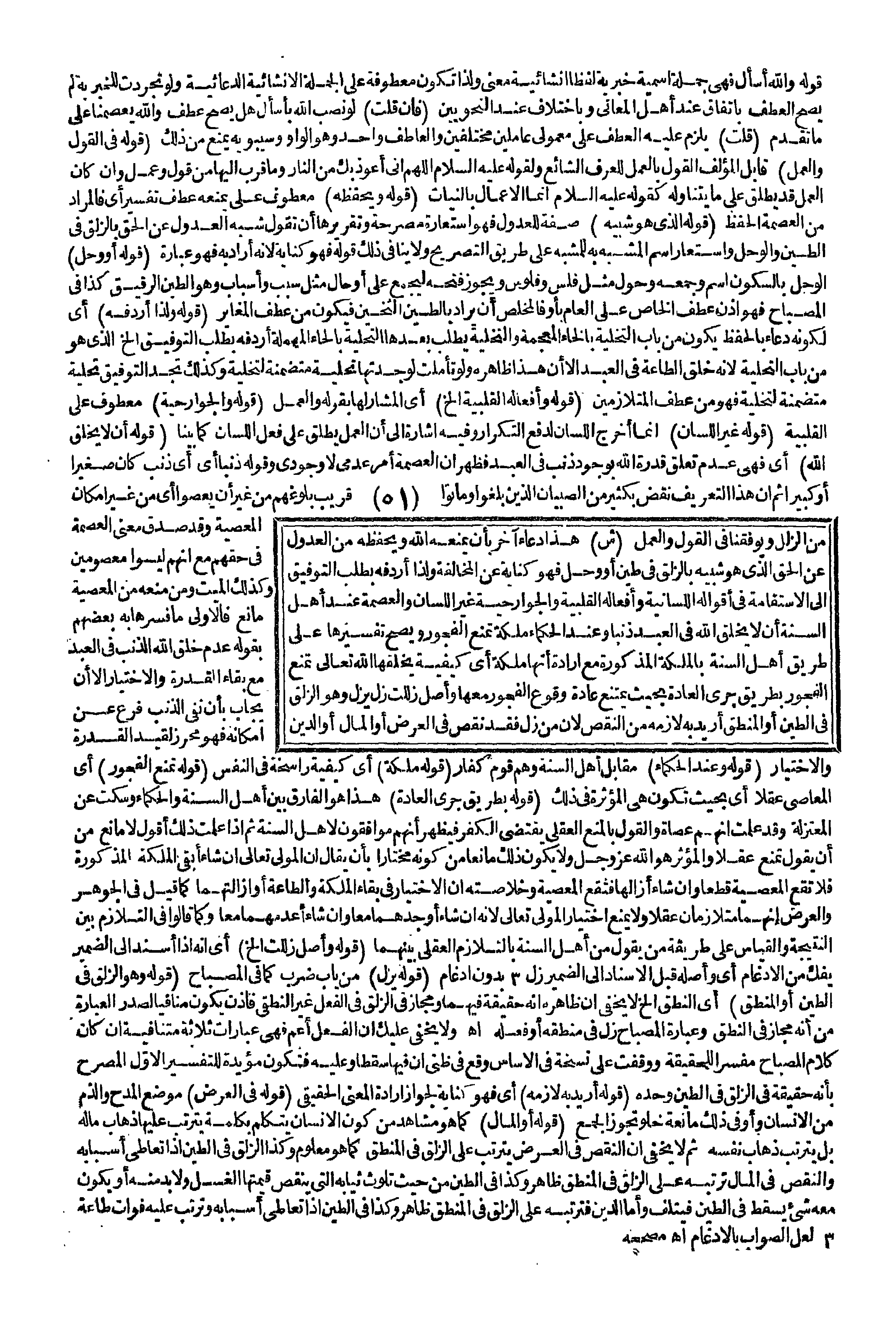 (قَوْلُهُ وَلِذَا أَرْدَفَهُ) أَيْ لِكَوْنِهِ دُعَاءً بِالْحِفْظِ يَكُونُ مِنْ بَابِ التَّخْلِيَةِ بِالْخَاءِ الْمُعْجَمَةِ وَالتَّخْلِيَةُ يُطْلَبُ بَعْدَهَا التَّحْلِيَةُ بِالْحَاءِ الْمُهْمَلَةِ أَرْدَفَهُ بِطَلَبِ التَّوْفِيقِ إلَخْ الَّذِي هُوَ مِنْ بَابِ التَّحْلِيَةِ؛ لِأَنَّهُ خَلْقُ الطَّاعَةِ فِي الْعَبْدِ إلَّا أَنَّ هَذَا ظَاهِرُهُ وَلَوْ تَأَمَّلْت لَوَجَدْتهَا تَحْلِيَةً مُتَضَمِّنَةً لِتَخْلِيَةٍ وَكَذَلِكَ تَجِدُ التَّوْفِيقَ تَحْلِيَةً مُتَضَمِّنَةً لِتَخْلِيَةٍ فَهُوَ مِنْ عَطْفِ الْمُتَلَازِمَيْنِ (قَوْلُهُ وَأَفْعَالِهِ الْقَلْبِيَّةِ إلَخْ) أَيْ الْمُشَارِ لَهَا بِقَوْلِهِ وَالْعَمَلِ (قَوْلُهُ والجوارحية) مَعْطُوفٌ عَلَى الْقَلْبِيَّةِ (قَوْلُهُ غَيْرِ اللِّسَانِ) إنَّمَا أَخْرَجَ اللِّسَانَ لِدَفْعِ التَّكْرَارِ وَفِيهِ إشَارَةٌ إلَى أَنَّ الْعَمَلَ يُطْلَقُ عَلَى فِعْلِ اللِّسَانِ كَمَا بَيَّنَّا (قَوْلُهُ أَنْ لَا يَخْلُقَ اللَّهُ) أَيْ فَهِيَ عَدَمُ تَعَلُّقِ قُدْرَةِ اللَّهِ بِوُجُودِ ذَنْبٍ فِي الْعَبْدِ فَظَهَرَ أَنَّ الْعِصْمَةَ أَمْرٌ عَدَمِيٌّ لَا وُجُودِيٌّ وَقَوْلُهُ ذَنْبًا أَيْ أَيَّ ذَنْبٍ كَانَ صَغِيرًا أَوْ كَبِيرًا، ثُمَّ إنَّ هَذَا التَّعْرِيفَ نُقِضَ بِكَثِيرٍ مِنْ الصِّبْيَانِ الَّذِينَ بَلَغُوا وَمَاتُوا قَرِيبَ بُلُوغِهِمْ مِنْ غَيْرِ أَنْ يَعْصُوا أَيْ مِنْ غَيْرِ إمْكَانِ الْمَعْصِيَةِ وَقَدْ صَدَقَ مَعْنَى الْعِصْمَةِ فِي حَقِّهِمْ مَعَ أَنَّهُمْ لَيْسُوا مَعْصُومِينَ وَكَذَلِكَ الْمَيِّتُ وَمَنْ مَنَعَهُ مِنْ الْمَعْصِيَةِ مَانِعٌ فَالْأَوْلَى مَا فَسَّرَهَا بِهِ بَعْضُهُمْ بِقَوْلِهِ عَدَمُ خَلْقِ اللَّهِ الذَّنْبَ فِي الْعَبْدِ مَعَ بَقَاءِ الْقُدْرَةِ وَالِاخْتِيَارِ إلَّا أَنْ يُجَابَ بِأَنَّ نَفْيَ الذَّنْبِ فَرْعٌ عَنْ إمْكَانِهِ فَهُوَ مُحْرِزٌ لِقَيْدِ الْقُدْرَةِ وَالِاخْتِيَارِ (قَوْلُهُ وَعِنْدَ الْحُكَمَاءِ) مُقَابِلُ أَهْلِ السُّنَّةِ وَهُمْ قَوْمٌ كُفَّارٌ (قَوْلُهُ مَلَكَةٌ) أَيْ كَيْفِيَّةٌ رَاسِخَةٌ فِي النَّفْسِ (قَوْلُهُ تَمْنَعُ الْفُجُورَ) أَيْ الْمَعَاصِيَ عَقْلًا أَيْ بِحَيْثُ تَكُونُ هِيَ الْمُؤَثِّرَةُ فِي ذَلِكَ.
