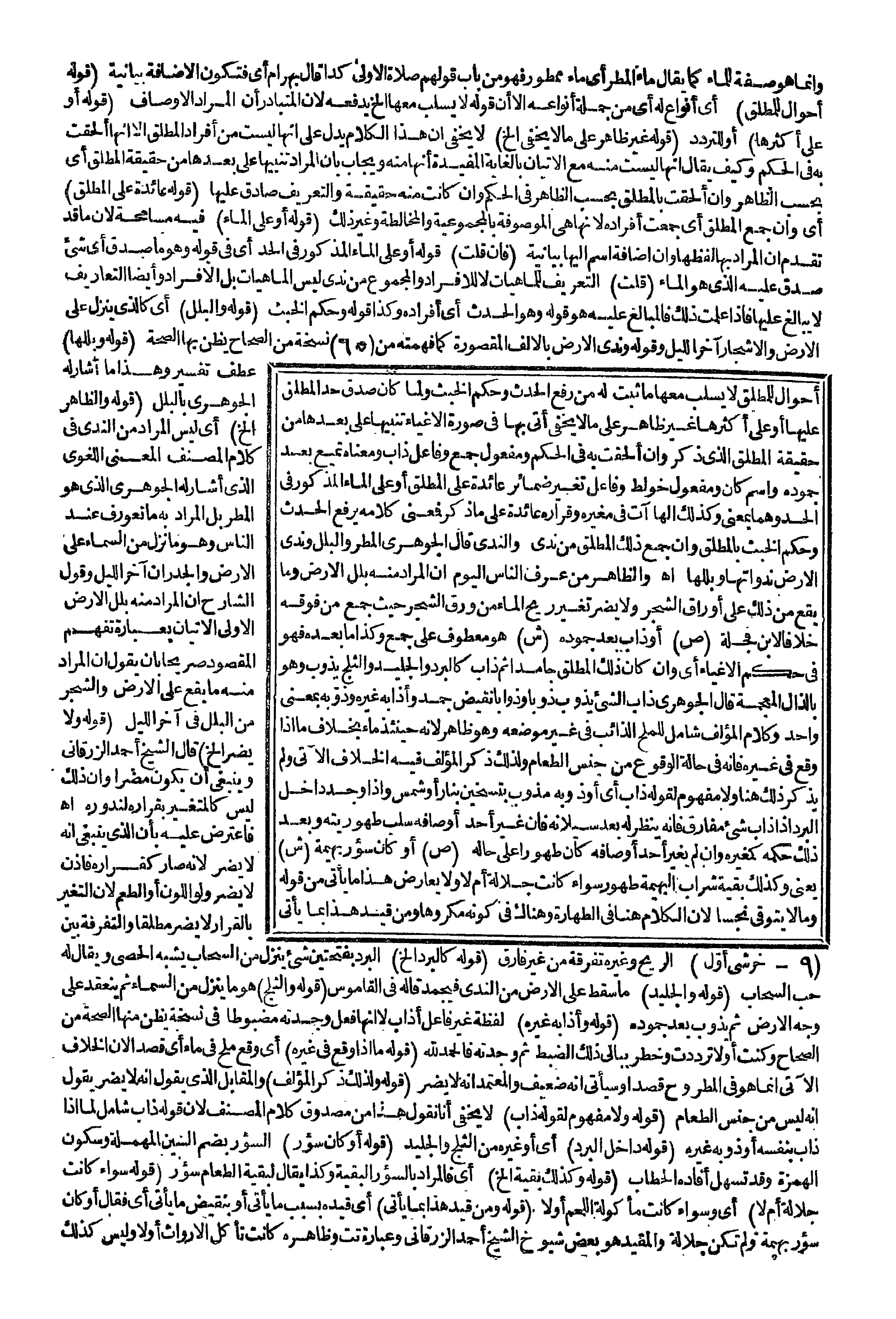 ـــــــــــــــــــــــــــــQوَإِنَّمَا هُوَ صِفَةٌ لِلْمَاءِ كَمَا يُقَالُ مَاءُ الْمَطَرِ أَيْ مَاءٌ مَمْطُورٌ فَهُوَ مِنْ بَابِ قَوْلِهِمْ صَلَاةُ الْأُولَى كَذَا قَالَ بَهْرَامُ أَيْ فَتَكُونُ الْإِضَافَةُ بَيَانِيَّةً (قَوْلُهُ أَحْوَالٌ لِلْمُطْلَقِ) أَيْ أَنْوَاعٌ لَهُ أَيْ مِنْ جُمْلَةِ أَنْوَاعِهِ إلَّا أَنَّ قَوْلَهُ لَا يَسْلُبُ مَعَهَا إلَخْ يَدْفَعُهُ؛ لِأَنَّ الْمُتَبَادِرَ أَنَّ الْمُرَادَ الْأَوْصَافُ (قَوْلُهُ أَوْ عَلَى أَكْثَرِهَا) أَوْ لِلتَّرَدُّدِ (قَوْلُهُ غَيْرُ ظَاهِرٍ عَلَى مَا لَا يَخْفَى إلَخْ) لَا يَخْفَى أَنَّ هَذَا الْكَلَامَ يَدُلُّ عَلَى أَنَّهَا لَيْسَتْ مِنْ أَفْرَادِ الْمُطْلَقِ إلَّا أَنَّهَا أُلْحِقَتْ بِهِ فِي الْحُكْمِ وَكَيْفَ يُقَالُ أَنَّهَا لَيْسَتْ مِنْهُ مَعَ الْإِتْيَانِ بِالْغَايَةِ الْمُفِيدَةِ أَنَّهَا مِنْهُ وَيُجَابُ بِأَنَّ الْمُرَادَ تَنْبِيهٌ عَلَى بُعْدِهَا مِنْ حَقِيقَةِ الْمُطْلَقِ أَيْ بِحَسَبِ الظَّاهِرِ، وَإِنْ أُلْحِقَتْ بِالْمُطْلَقِ بِحَسَبِ الظَّاهِرِ فِي الْحُكْمِ، وَإِنْ كَانَتْ مِنْهُ حَقِيقَةً وَالتَّعْرِيفُ صَادِقٌ عَلَيْهَا (قَوْلُهُ عَائِدَةٌ عَلَى الْمُطْلَقِ) أَيْ، وَإِنْ جُمِعَ الْمُطْلَقُ أَيْ جُمِعَتْ أَفْرَادُهُ؛ لِأَنَّهَا هِيَ الْمَوْصُوفَةُ بالمجموعية وَالْمُخَالَطَةِ وَغَيْرِ ذَلِكَ (قَوْلُهُ أَوْ عَلَى الْمَاءِ) فِيهِ مُسَامَحَةٌ؛ لِأَنَّ مَا قَدْ تَقَدَّمَ أَنَّ الْمُرَادَ بِهَا لَفْظُهَا وَأَنَّ إضَافَةَ اسْمٍ إلَيْهَا بَيَانِيَّةٌ (فَإِنْ قُلْت) قَوْلُهُ أَوْ عَلَى الْمَاءِ الْمَذْكُورِ فِي الْحَدِّ أَيْ فِي قَوْلِهِ، وَهُوَ مَا صَدَقَ أَيْ شَيْءٌ صَدَقَ عَلَيْهِ الَّذِي هُوَ الْمَاءُ (قُلْت) التَّعْرِيفُ لِلْمَاهِيَّاتِ لَا لِلْأَفْرَادِ وَالْمَجْمُوعُ مِنْ نَدًى لَيْسَ الْمَاهِيَّاتِ بَلْ الْأَفْرَادُ وَأَيْضًا التَّعَارِيفُ لَا يُبَالِغُ عَلَيْهَا فَإِذَا عَلِمْت ذَلِكَ فَالْمُبَالَغُ عَلَيْهِ هُوَ قَوْلُهُ، وَهُوَ الْحَدَثُ أَيْ أَفْرَادُهُ وَكَذَا قَوْلُهُ وَحُكْمُ الْخَبَثِ (قَوْلُهُ وَالْبَلَلُ) أَيْ كَاَلَّذِي يَنْزِلُ عَلَى الْأَرْضِ وَالْأَشْجَارِ آخِرَ اللَّيْلِ وَقَوْلُهُ وَنَدَى الْأَرْضِ بِالْأَلِفِ الْمَقْصُورَةِ كَمَا فَهِمْته مِنْ نُسْخَةِ الصِّحَاحِ يُظَنُّ بِهَا الصِّحَّةُ (قَوْلُهُ وَبَلَلُهَا) عَطْفُ تَفْسِيرٍ وَهَذَا مَا أَشَارَ لَهُ الْجَوْهَرِيُّ بِالْبَلَلِ (قَوْلُهُ وَالظَّاهِرُ إلَخْ) أَيْ لَيْسَ الْمُرَادُ مِنْ النَّدَى فِي كَلَامِ الْمُصَنِّفِ الْمَعْنَى اللُّغَوِيَّ الَّذِي أَشَارَ لَهُ الْجَوْهَرِيُّ الَّذِي هُوَ الْمَطَرُ بَلْ الْمُرَادُ بِهِ مَا تُعُورِفَ عِنْدَ النَّاسِ، وَهُوَ مَا نَزَلَ مِنْ السَّمَاءِ عَلَى الْأَرْضِ وَالْجُدْرَانِ آخِرَ اللَّيْلِ وَقَوْلُ الشَّارِحِ أَنَّ الْمُرَادَ مِنْهُ بَلَلُ الْأَرْضِ الْأَوْلَى الْإِتْيَانُ بِعِبَارَةٍ تُفْهِمُ الْمَقْصُودَ صَرِيحًا بِأَنْ يَقُولَ إنَّ الْمُرَادَ مِنْهُ مَا يَقَعُ عَلَى الْأَرْضِ وَالشَّجَرِ مِنْ الْبَلَلِ فِي آخِرِ اللَّيْلِ