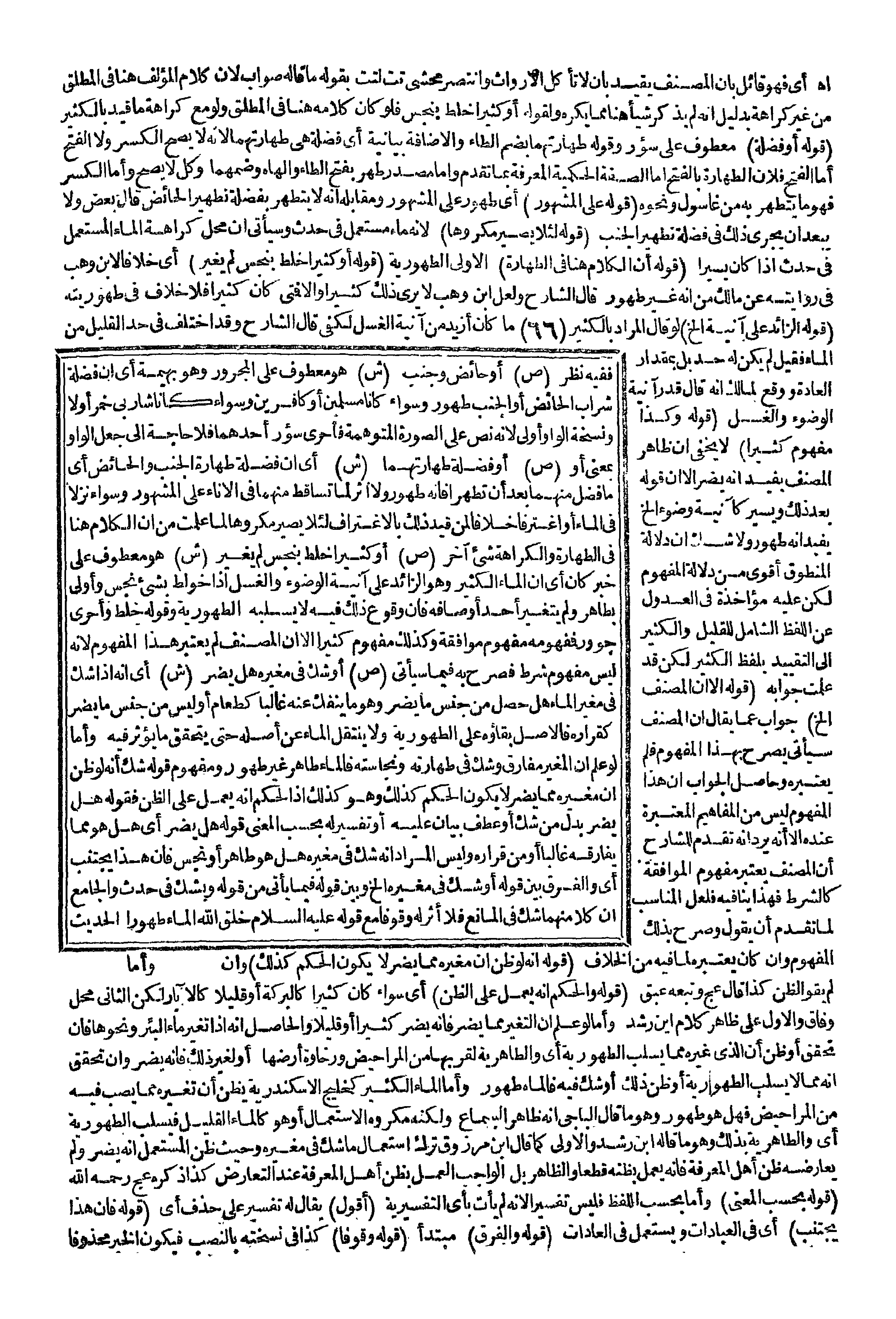 (قَوْلُهُ أَوْ كَثِيرًا خُلِطَ بِنَجَسٍ لَمْ يُغَيَّرْ) أَيْ خِلَافًا لِابْنِ وَهْبٍ فِي رِوَايَتِهِ عَنْ مَالِكٍ مِنْ أَنَّهُ غَيْرُ طَهُورٍ قَالَ الشَّارِحُ وَلَعَلَّ ابْنَ وَهْبٍ لَا يَرَى ذَلِكَ كَثِيرًا وَإِلَّا فَمَتَى كَانَ كَثِيرًا فَلَا خِلَافَ فِي طَهُورِيَّتِهِ (قَوْلُهُ الزَّائِدُ عَلَى آنِيَةٍ إلَخْ) لَوْ قَالَ الْمُرَادُ بِالْكَثِيرِ مَا كَانَ أَزْيَدَ مِنْ آنِيَةِ الْغُسْلِ لَكَفَى قَالَ الشَّارِحُ وَقَدْ اُخْتُلِفَ فِي حَدِّ الْقَلِيلِ مِنْ الْمَاءِ فَقِيلَ لَمْ يَكُنْ لَهُ حَدٌّ بَلْ بِمِقْدَارِ الْعَادَةِ وَوَقَعَ لِمَالِكٍ أَنَّهُ قَالَ قَدْرَ آنِيَةِ الْوُضُوءِ وَالْغُسْلِ (قَوْلُهُ وَكَذَا مَفْهُومُ كَثِيرًا) لَا يَخْفَى أَنَّ ظَاهِرَ الْمُصَنِّفِ يُفِيدُ أَنَّهُ يَضُرُّ إلَّا أَنَّ قَوْلَهُ بَعْدَ ذَلِكَ وَيَسِيرٌ كَآنِيَةِ وُضُوءٍ إلَخْ يُفِيدُ أَنَّهُ طَهُورٌ وَلَا شَكَّ أَنَّ دَلَالَةَ الْمَنْطُوقِ أَقْوَى مِنْ دَلَالَةِ الْمَفْهُومِ لَكِنْ عَلَيْهِ مُؤَاخَذَةٌ فِي الْعُدُولِ عَنْ اللَّفْظِ الشَّامِلِ لِلْقَلِيلِ وَالْكَثِيرِ إلَى التَّقْيِيدِ الشَّامِلِ لِلْقَلِيلِ لَكِنْ قَدْ عَلِمْت جَوَابَهُ (قَوْلُهُ إلَّا أَنَّ الْمُصَنِّفَ إلَخْ) جَوَابٌ عَمَّا يُقَالُ أَنَّ الْمُصَنِّفَ سَيَأْتِي يُصَرِّحُ بِهَذَا الْمَفْهُومِ فَلَمْ يَعْتَبِرْهُ وَحَاصِلُ الْجَوَابِ أَنَّ هَذَا الْمَفْهُومَ لَيْسَ مِنْ الْمَفَاهِيمِ الْمُعْتَبَرَةِ عِنْدَهُ إلَّا أَنَّهُ يَرِدُ أَنَّهُ تَقَدَّمَ لِلشَّارِحِ أَنَّ الْمُصَنِّفَ يَعْتَبِرُ مَفْهُومَ الْمُوَافَقَةِ كَالشَّرْطِ فَهَذَا يُنَافِيهِ فَلَعَلَّ الْمُنَاسِبَ لِمَا تَقَدَّمَ أَنْ يَقُولَ وَصَرَّحَ بِذَلِكَ الْمَفْهُومِ، وَإِنْ كَانَ يَعْتَبِرُهُ لِمَا فِيهِ مِنْ الْخِلَافِ.