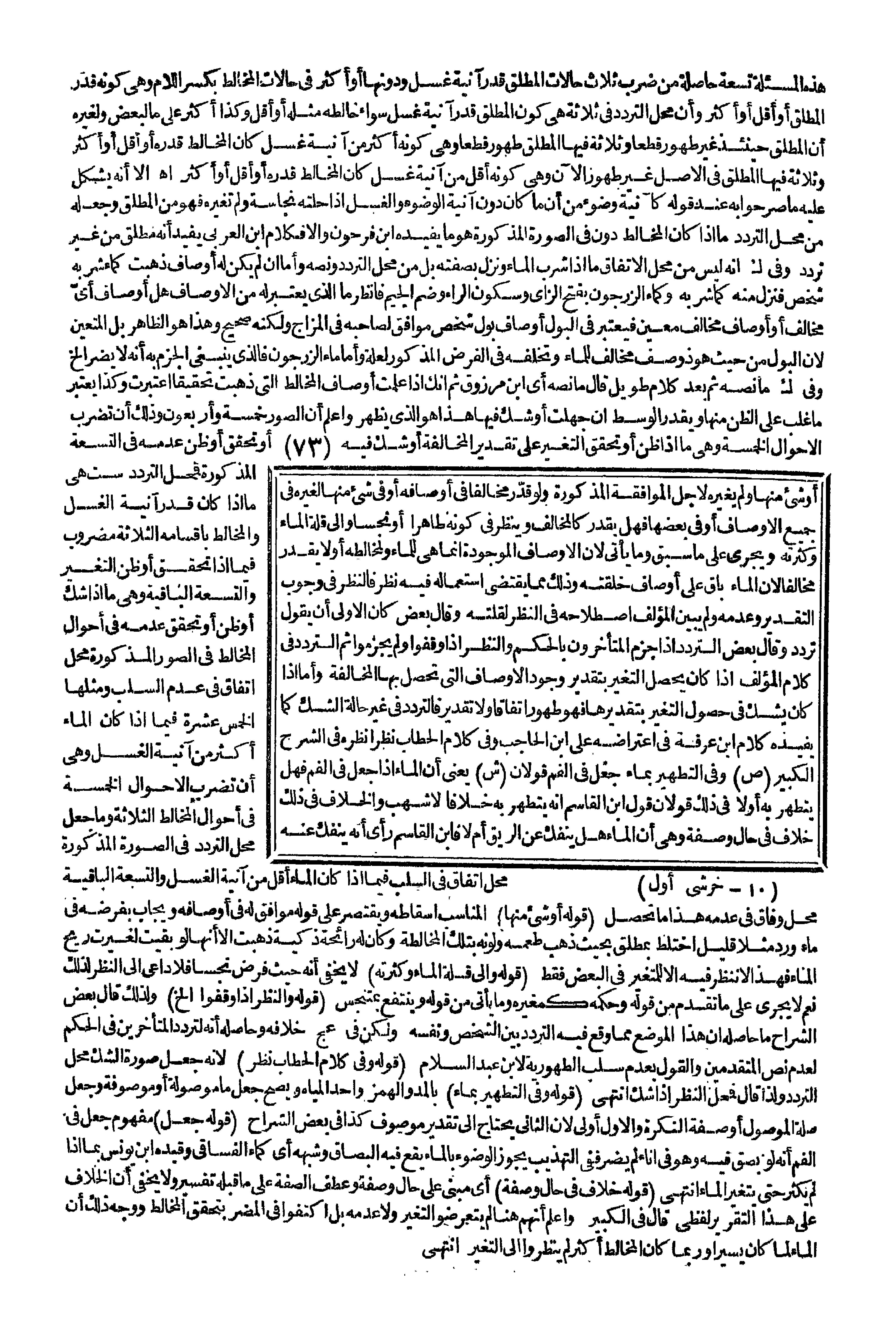 ـــــــــــــــــــــــــــــQهَذِهِ الْمَسْأَلَةِ تِسْعَةٌ حَاصِلَةٌ مِنْ ضَرْبِ ثَلَاثِ حَالَاتِ الْمُطْلَقِ قَدْرِ آنِيَةِ غُسْلٍ وَدُونِهَا أَوْ أَكْثَرَ فِي حَالَاتِ الْمُخَالِطِ بِكَسْرِ اللَّامِ وَهِيَ كَوْنُهُ قَدْرَ الْمُطْلَقِ أَوْ أَقَلَّ أَوْ أَكْثَرَ وَأَنَّ مَحَلَّ التَّرَدُّدِ فِي ثَلَاثَةٍ هِيَ كَوْنُ الْمُطْلَقِ قَدْرَ آنِيَةِ غُسْلٍ سَوَاءٌ خَالَطَهُ مِثْلُهُ أَوْ أَقَلُّ وَكَذَا أَكْثَرُ عَلَى مَا لِبَعْضٍ وَلِغَيْرِهِ أَنَّ الْمُطْلَقَ حِينَئِذٍ غَيْرُ طَهُورٍ قَطْعًا وَثَلَاثَةٌ فِيهَا الْمُطْلَقُ طَهُورٌ قَطْعًا، وَهِيَ كَوْنُهُ أَكْثَرَ مِنْ آنِيَةِ غُسْلٍ كَانَ الْمُخَالِطُ قَدْرَهُ أَوْ أَقَلَّ أَوْ أَكْثَرَ وَثَلَاثَةٌ فِيهَا الْمُطْلَقُ فِي الْأَصْلِ غَيْرُ طَهُورٍ الْآنَ وَهِيَ كَوْنُهُ أَقَلَّ مِنْ آنِيَةِ غُسْلٍ كَانَ الْمُخَالِطُ قَدْرَهُ أَوْ أَكْثَرَ اهـ. إلَّا أَنَّهُ يَشْكُلُ عَلَيْهِ مَا صَرَّحُوا بِهِ عِنْدَ قَوْلِهِ كَآنِيَةِ وُضُوءٍ مِنْ أَنَّ مَا كَانَ دُونَ آنِيَةِ الْوُضُوءِ وَالْغُسْلِ إذَا حَلَّتْهُ نَجَاسَةٌ وَلَمْ تُغَيِّرْهُ فَهُوَ مِنْ الْمُطْلَقِ وَجَعَلَهُ مِنْ مَحَلِّ التَّرَدُّدِ مَا إذَا كَانَ الْمُخَالِطُ دُونَهُ فِي الصُّورَةِ الْمَذْكُورَةِ هُوَ مَا يُفِيدُهُ ابْنُ فَرْحُونٍ وَإِلَّا فَكَلَامُ ابْنِ الْعَرَبِيِّ يُفِيدُ أَنَّهُ مُطْلَقٌ مِنْ غَيْرِ تَرَدُّدٍ وَفِي ك أَنَّهُ لَيْسَ مِنْ مَحَلِّ الِاتِّفَاقِ مَا إذَا شَرِبَ الْمَاءَ وَنَزَلَ بِصِفَتِهِ بَلْ مِنْ مَحَلِّ التَّرَدُّدِ وَنَصُّهُ، وَأَمَّا إنْ لَمْ يَكُنْ لَهُ أَوْصَافٌ ذَهَبَتْ كَمَاءٍ شَرِبَهُ شَخْصٌ فَنَزَلَ مِنْهُ كَمَا شَرِبَهُ وَكَمَاءِ الزَّرْجُونِ بِفَتْحِ الزَّايِ وَسُكُونِ الرَّاءِ وَضَمِّ الْجِيمِ فَانْظُرْ مَا الَّذِي يُعْتَبَرُ لَهُ مِنْ الْأَوْصَافِ هَلْ أَوْصَافُ أَيِّ مُخَالِفٍ أَوْ أَوْصَافُ مُخَالِفٍ مُعَيَّنٍ فَيُعْتَبَرُ فِي الْبَوْلِ أَوْصَافُ بَوْلِ شَخْصٍ مُوَافِقٍ لِصَاحِبِهِ فِي الْمِزَاجِ وَلَكِنَّهُ صَحِيحٌ، وَهَذَا هُوَ الظَّاهِرُ بَلْ الْمُتَعَيِّنُ.