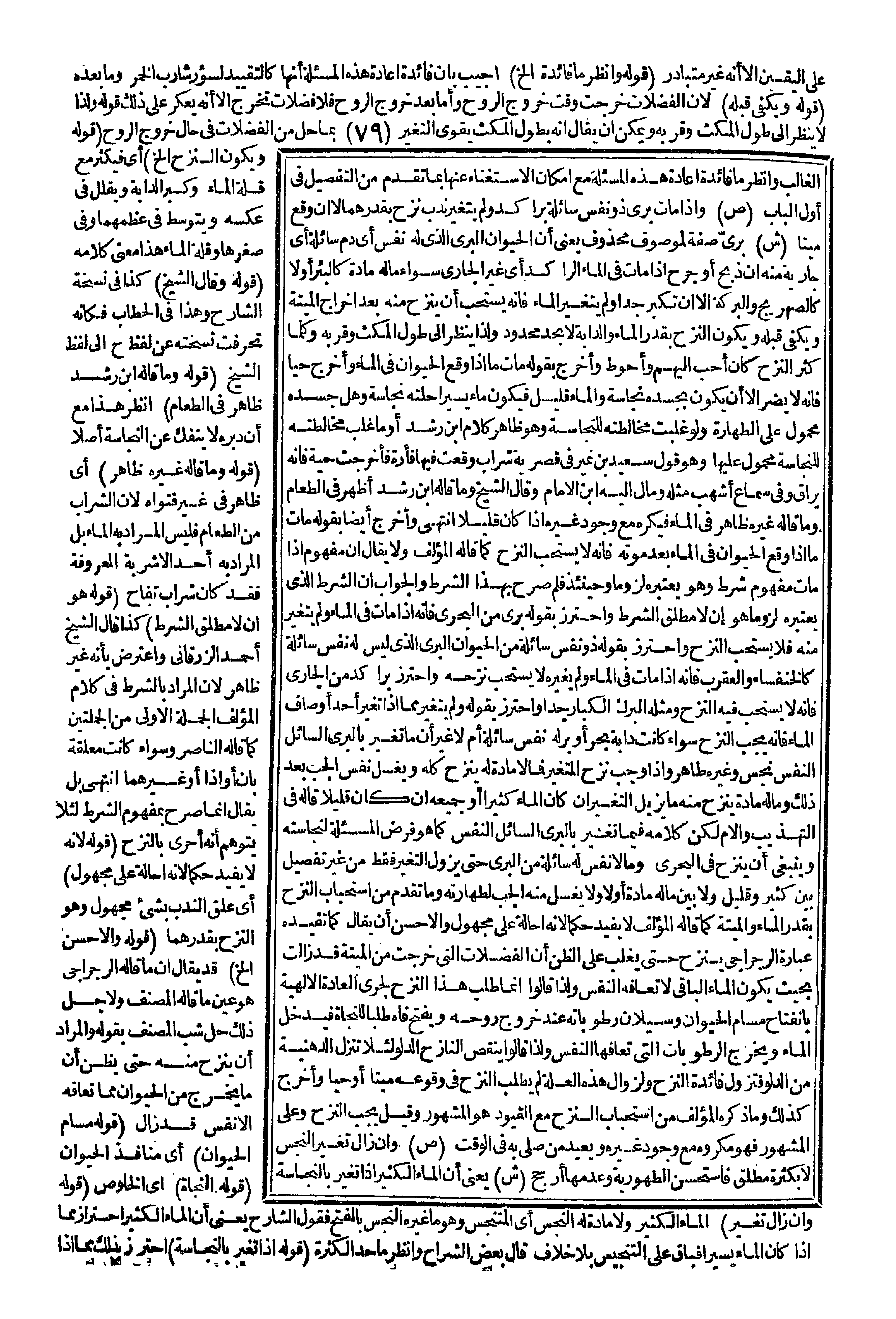 (قَوْلُهُ وَيَكْفِي قَبْلَهُ) ؛ لِأَنَّ الْفَضَلَاتِ خَرَجَتْ وَقْتَ خُرُوجِ الرُّوحِ، وَأَمَّا بَعْدَ خُرُوجِ الرُّوحِ فَلَا فَضَلَاتِ تَخْرُجُ إلَّا أَنَّهُ يُعَكَّرُ عَلَى ذَلِكَ قَوْلُهُ؛ وَلِذَا لَا يَنْظُرُ إلَى طُولِ الْمُكْثِ وَقُرْبِهِ وَيُمْكِنُ أَنْ يُقَالَ أَنَّهُ بِطُولِ الْمُكْثِ يَقْوَى التَّغَيُّرُ بِمَا حَلَّ مِنْ الْفَضَلَاتِ فِي حَالِ خُرُوجِ الرُّوحِ. (قَوْلُهُ وَيَكُونُ النَّزْحُ إلَخْ) أَيْ فَيَكْثُرُ مَعَ قِلَّةِ الْمَاءِ وَكِبَرِ الدَّابَّةِ وَيُقَلَّلُ فِي عَكْسِهِ وَيُتَوَسَّطُ فِي عِظَمِهِمَا وَفِي صِغَرِهَا وَقِلَّةِ الْمَاءِ هَذَا مَعْنَى كَلَامِهِ (قَوْلُهُ وَقَالَ الشَّيْخُ) كَذَا فِي نُسْخَةِ الشَّارِحِ وَهَذَا فِي الْحَطَّابِ فَكَأَنَّهُ تَحَرَّفَتْ نُسْخَتُهُ عَنْ لَفْظِ ح إلَى لَفْظِ الشَّيْخِ (قَوْلُهُ وَمَا قَالَهُ ابْنُ رُشْدٍ ظَاهِرٌ فِي الطَّعَامِ) اُنْظُرْ هَذَا مَعَ أَنَّ دُبُرَهُ لَا يَنْفَكُّ عَنْ النَّجَاسَةِ أَصْلًا (قَوْلُهُ وَمَا قَالَهُ غَيْرُهُ ظَاهِرٌ) أَيْ ظَاهِرٌ فِي غَيْرِ فَتْوَاهُ؛ لِأَنَّ الشَّرَابَ مِنْ الطَّعَامِ فَلَيْسَ الْمُرَادُ بِهِ الْمَاءَ بَلْ الْمُرَادُ بِهِ أَحَدُ الْأَشْرِبَةِ الْمَعْرُوفَةِ فَقَدْ كَانَ شَرَابَ تُفَّاحٍ (قَوْلُهُ هُوَ أَنْ لَا مُطْلَقَ الشَّرْطِ) كَذَا قَالَ الشَّيْخُ أَحْمَدُ الزَّرْقَانِيُّ وَاعْتُرِضَ بِأَنَّهُ غَيْرُ ظَاهِرٍ؛ لِأَنَّ الْمُرَادَ بِالشَّرْطِ فِي كَلَامِ الْمُؤَلِّفِ الْجُمْلَةُ الْأُولَى مِنْ الْجُمْلَتَيْنِ كَمَا قَالَهُ النَّاصِرُ اللَّقَانِيِّ وَسَوَاءٌ كَانَتْ مُعَلَّقَةً بِإِنْ أَوْ إذَا أَوْ غَيْرِهِمَا انْتَهَى.