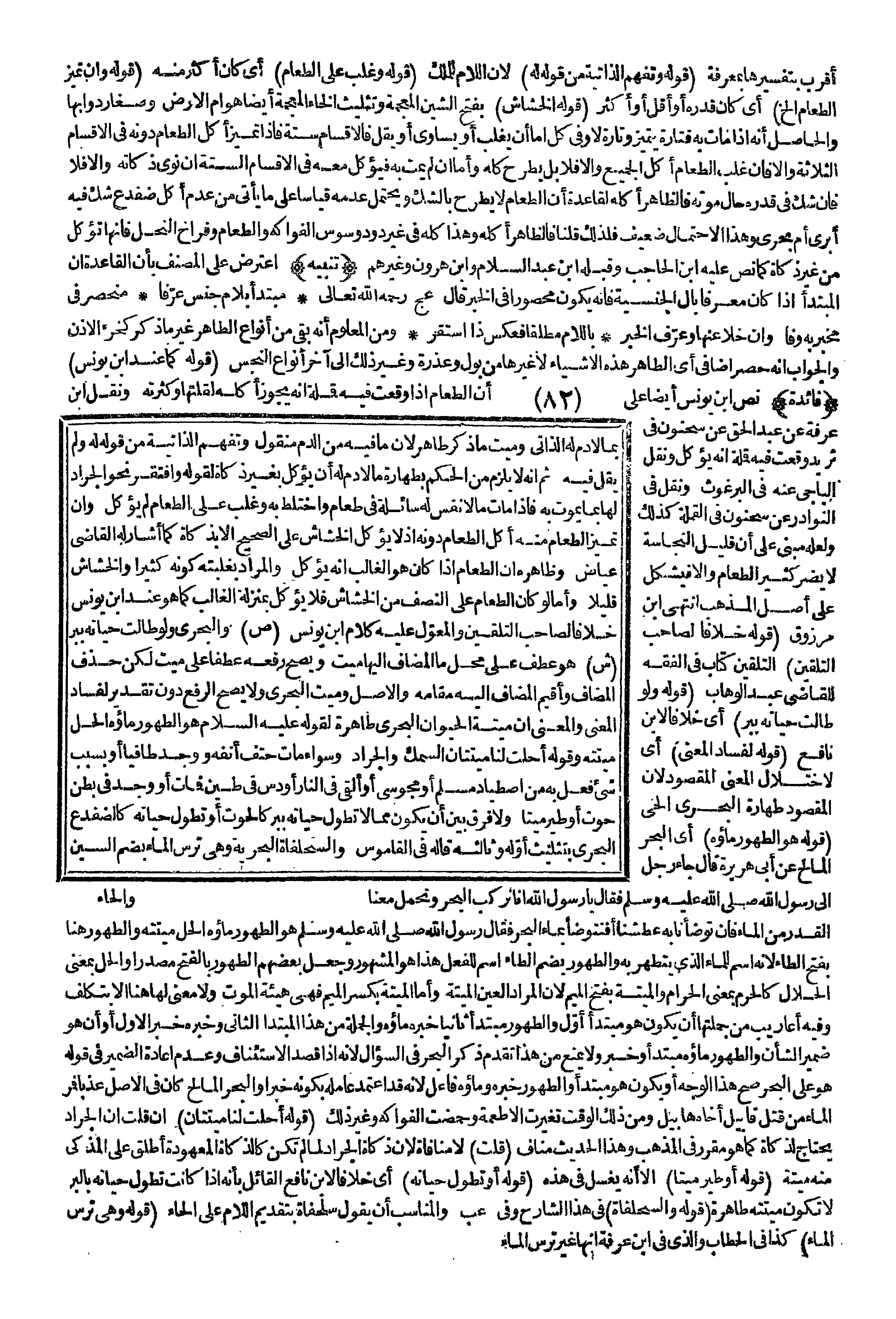 (قَوْلُهُ وَلَوْ طَالَتْ حَيَاتُهُ بِبَرٍّ) أَيْ خِلَافًا لِابْنِ نَافِعٍ (قَوْلُهُ لِفَسَادِ الْمَعْنَى) أَيْ لِاخْتِلَالِ الْمَعْنَى الْمَقْصُودِ؛ لِأَنَّ الْمَقْصُودَ طَهَارَةُ الْبَحْرِيِّ الْحَيِّ (قَوْلُهُ: وَهُوَ الطَّهُورُ مَاؤُهُ) أَيْ الْبَحْرُ الْمَالِحُ عَنْ أَبِي هُرَيْرَةَ قَالَ «جَاءَ رَجُلٌ إلَى رَسُولِ اللَّهِ - صَلَّى اللَّهُ عَلَيْهِ وَسَلَّمَ - فَقَالَ يَا رَسُولَ اللَّهِ إنَّا نَرْكَبُ الْبَحْرَ وَنَحْمِلُ مَعَنَا الْقَدْرَ مِنْ الْمَاءِ، فَإِنْ تَوَضَّأْنَا بِهِ عَطِشْنَا أَفَنَتَوَضَّأُ بِمَاءِ الْبَحْرِ فَقَالَ رَسُولُ اللَّهِ - صَلَّى اللَّهُ عَلَيْهِ وَسَلَّمَ - هُوَ الطَّهُورُ مَاؤُهُ الْحِلُّ مَيْتَتُهُ» وَالطَّهُورُ هُنَا بِفَتْحِ الطَّاءِ؛ لِأَنَّهُ اسْمٌ لِلْمَاءِ الَّذِي يُتَطَهَّرُ بِهِ وَالطُّهُورُ بِضَمِّ الطَّاءِ اسْمٌ لِلْفِعْلِ هَذَا هُوَ الْمَشْهُورُ وَجَعَلَ بَعْضُهُمْ الطَّهُورَ بِالْفَتْحِ مَصْدَرًا وَالْحِلُّ بِمَعْنَى الْحَلَالِ كَالْحَرَمِ بِمَعْنَى الْحَرَامِ وَالْمَيْتَةُ بِفَتْحِ الْمِيمِ؛ لِأَنَّ الْمُرَادَ الْعَيْنُ الْمَيِّتَةُ، وَأَمَّا الْمِيتَةُ بِكَسْرِ الْمِيمِ فَهِيَ هَيْئَةُ الْمَوْتِ وَلَا مَعْنَى لَهَا هُنَا إلَّا بِتَكَلُّفٍ وَفِيهِ أَعَارِيبُ مِنْ جُمْلَتِهَا أَنْ يَكُونَ هُوَ مُبْتَدَأٌ أَوَّلٌ وَالطَّهُورُ مُبْتَدَأٌ ثَانِيًا خَبَرُهُ مَاؤُهُ وَالْجُمْلَةُ مِنْ هَذَا الْمُبْتَدَأِ الثَّانِي وَخَبَرُهُ خَبَرُ الْأَوَّلِ أَوْ أَنَّ هُوَ ضَمِيرُ الشَّأْنِ وَالطَّهُورُ مَاؤُهُ مُبْتَدَأٌ وَخَبَرٌ وَلَا يَمْنَعُ مِنْ هَذَا تَقَدُّمُ ذِكْرِ الْبَحْرِ فِي السُّؤَالِ؛ لِأَنَّهُ إذَا قَصَدَ الِاسْتِئْنَافَ وَعَدَمَ إعَادَةِ الضَّمِيرِ فِي قَوْلِهِ هُوَ عَلَى الْبَحْرِ صَحَّ هَذَا الْوَجْهُ أَوْ يَكُونُ هُوَ مُبْتَدَأٌ وَالطَّهُورُ خَبَرُهُ وَمَاؤُهُ فَاعِلٌ؛ لِأَنَّهُ قَدْ اعْتَمَدَ عَامِلَهُ بِكَوْنِهِ خَبَرًا وَالْبَحْرُ الْمَالِحُ كَانَ فِي الْأَصْلِ عَذْبًا فَمَرَّ الْمَاءُ مِنْ قَتْلِ قَابِيلَ أَخَاهُ هَابِيلَ وَمِنْ ذَلِكَ الْوَقْتِ تَغَيَّرَتْ الْأَطْعِمَةُ وَحَمُضَتْ الْفَوَاكِهُ وَغَيْرُ ذَلِكَ (قَوْلُهُ «أُحِلَّتْ لَنَا مَيْتَتَانِ» ) إنْ قُلْت إنَّ الْجَرَادَ يَحْتَاجُ لِذَكَاةٍ كَمَا هُوَ مُقَرَّرٌ فِي الْمَذْهَبِ وَهَذَا الْحَدِيثُ مُنَافٍ (قُلْت) لَا مُنَافَاةَ.