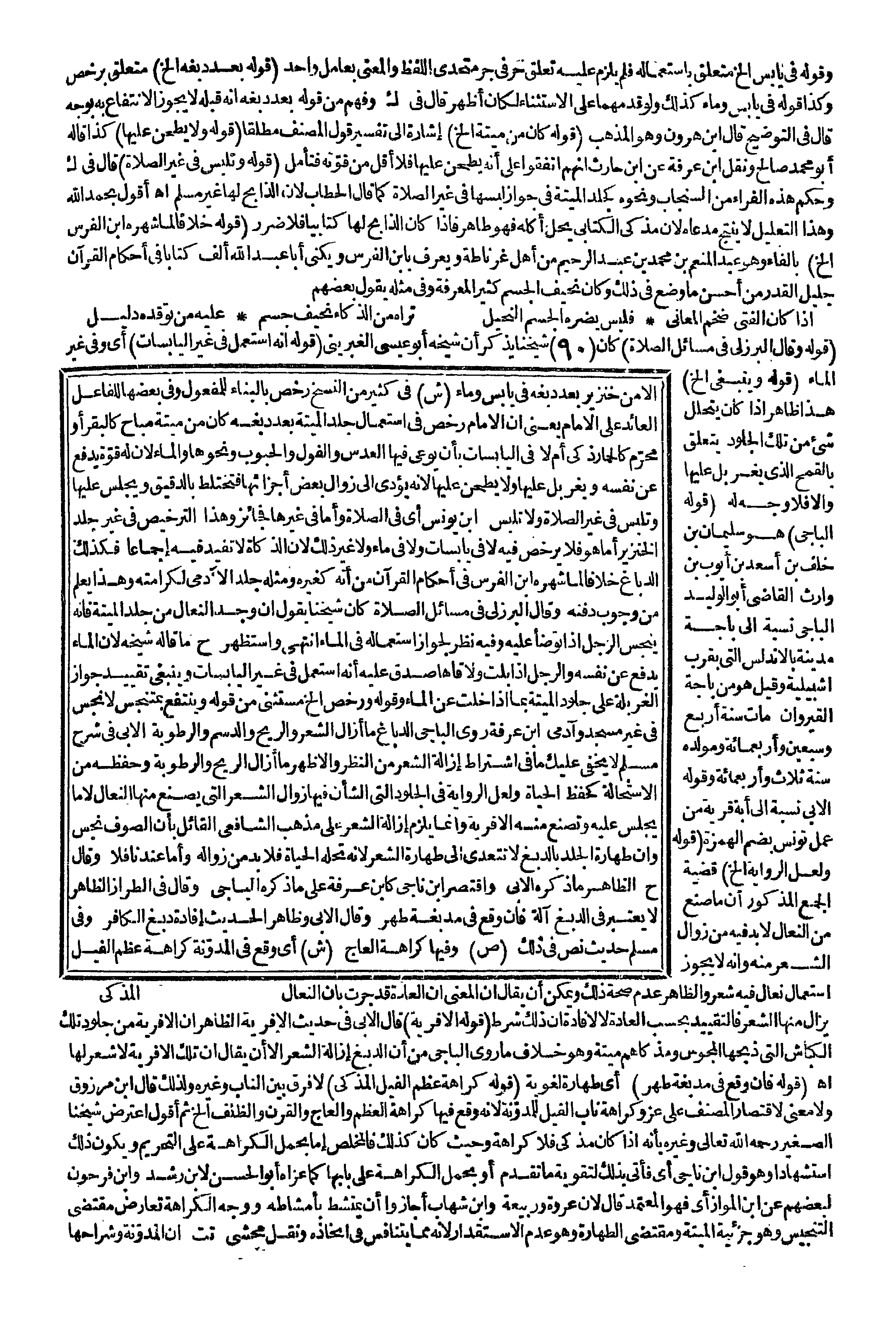 (قَوْلُهُ وَقَالَ الْبُرْزُلِيُّ فِي مَسَائِلِ الصَّلَاةِ) كَانَ شَيْخُنَا يَذْكُرُ أَنَّ شَيْخَهُ أَبُو عِيسَى الْغُبْرِينِيُّ (قَوْلُهُ: أَنَّهُ اُسْتُعْمِلَ فِي غَيْرِ الْيَابِسَاتِ) أَيْ وَفِي غَيْرِ الْمَاءِ (قَوْلُهُ وَيَنْبَغِي إلَخْ) هَذَا ظَاهِرٌ إذَا كَانَ يَتَحَلَّلُ شَيْءٌ مِنْ تِلْكَ الْجُلُودِ يَتَعَلَّقُ بِالْقَمْحِ الَّذِي يُغَرْبِلُ عَلَيْهَا وَإِلَّا فَلَا وَجْهَ لَهُ (قَوْلُهُ الْبَاجِيُّ) هُوَ سُلَيْمَانُ بْنُ خَلَفٍ بْنِ أَسْعَدَ بْنِ أَيُّوبَ بْنِ وَارِثٍ الْقَاضِي أَبُو الْوَلِيدِ الْبَاجِيِّ نِسْبَةً إلَى بَاجَةَ مَدِينَةٌ بِالْأَنْدَلُسِ الَّتِي بِقُرْبِ إشْبِيلِيَّةَ وَقِيلَ هُوَ مِنْ بَاجَةِ الْقَيْرَوَانِ مَاتَ سَنَةَ أَرْبَعٍ وَسَبْعِينَ وَأَرْبَعِمِائَةٍ وَمَوْلِدُهُ سَنَةَ ثَلَاثٍ وَأَرْبَعِمِائَةٍ وَقَوْلُهُ الْأَبِيُّ نِسْبَةٌ إلَى آبَهْ قَرْيَةُ مِنْ عَمَلِ تُونِسَ بِضَمِّ الْهَمْزَةِ (قَوْلُهُ وَلَعَلَّ الرِّوَايَةَ إلَخْ) قَضِيَّةُ الْجَمْعِ الْمَذْكُورِ أَنَّ مَا صُنِعَ مِنْ النِّعَالِ لَا بُدَّ فِيهِ مِنْ زَوَالِ الشَّعْرِ مِنْهُ وَأَنَّهُ لَا يَجُوزُ اسْتِعْمَالُ نِعَالٍ فِيهِ شَعْرٌ وَالظَّاهِرُ عَدَمُ صِحَّةِ ذَلِكَ وَيُمْكِنُ أَنْ يُقَالَ إنَّ الْمَعْنَى أَنَّ الْعَادَةَ قَدْ جَرَتْ بِأَنَّ النِّعَالَ يُزَالُ مِنْهَا الشَّعْرُ فَالتَّقْيِيدُ بِحَسَبِ الْعَادَةِ لَا لِإِفَادَةِ أَنَّ ذَلِكَ شَرْطٌ (قَوْلُهُ الْأَفْرِيَةُ) قَالَ الْأَبِيُّ فِي حَدِيثِ الْأَفْرِيَةِ الظَّاهِرُ أَنَّ الْأَفْرِيَةَ مِنْ جُلُودِ تِلْكَ الْكِبَاشِ الَّتِي ذَبَحَهَا الْمَجُوسُ وَمُذَكَّاهُمْ مَيْتَةٌ، وَهُوَ خِلَافُ مَا رَوَى الْبَاجِيُّ مِنْ أَنَّ الدَّبْغَ إزَالَةُ الشَّعْرِ إلَّا أَنْ يُقَالَ أَنَّ تِلْكَ الْأَفْرِيَةِ لَا شَعْرَ لَهَا اهـ.