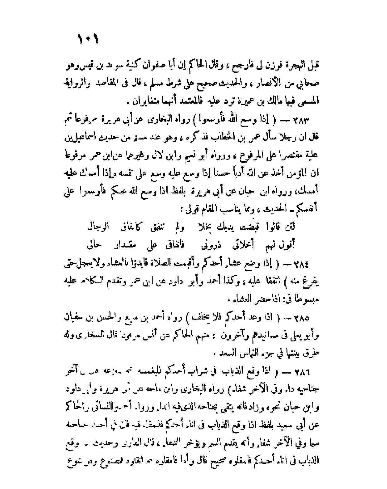 283 - (إذا وَسَّع اللهُ فأوْسِعوا) رواه البخاري عن أبي هريرة مرفوعا ثم قال إن رجلا سأل عمر بن الخطاب فذكره، وهو عند مسلم من حديث إسماعيل بن علية مقصرا على المرفوع، ورواه أبو نعيم وابن لال وغيرهما عن ابن عمر مرفوعا أن المؤمن أخذ عن الله أدبا حسنا إذا وسع عليه وسع على نفسه وإذا أمسك عليه أمسك، ورواه ابن حبان عن أبي هريرة بلفظ إذا وسع عليكم فأوسعوا على أنفسكم - الحديث، ومما يناسب المقام قولي: