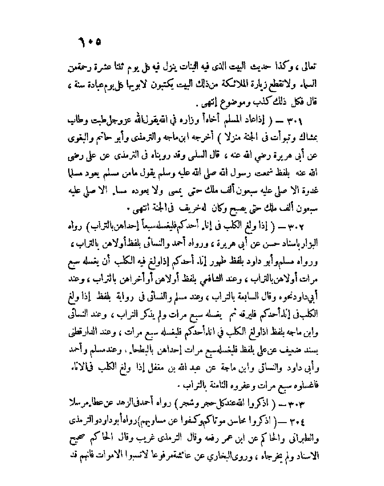 301 - (إذا عاد المسلم أخاه أو زاره في الله يقول الله عز وجل طبت وطاب ممشاك وتبوَّأت في الجنة منزلا) أخرجه ابن ماجه والترمذي وأبو حاتم والبغوي عن أبي هريرة رضي الله عنه، قال السُلَمِيُ وقد رويناه في الترمذي عن علي رضي الله عنه بلفظ سمعت رسول الله صلى عليه وسلم يقول ما من مسلم يعود مسلما غُدوة إلا صلى عليه سبعون ألف ملك حتى يمسي ولا يعوده مساء إلا صلى عليه سبعون ألف ملك حتى يصبح وكان له خريف في الجنة انتهى.