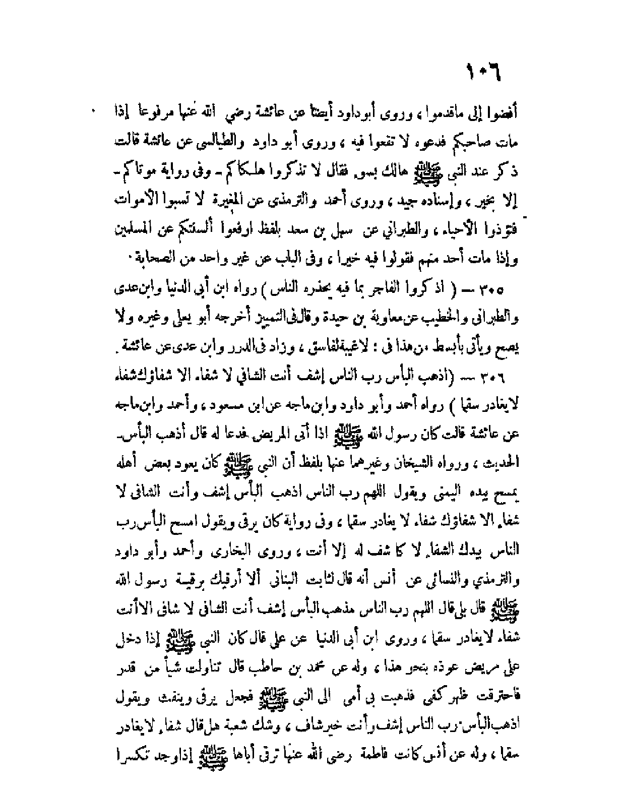 لا يغادر سقما) رواه أحمد وأبو داود وابن ماجه عن ابن مسعود، وأحمد وابن ماجه عن عائشة قالت كان رسول الله صلى الله عليه وسلم إذا أتى المريض فدعا له قال أذهب البأس - الحديث، ورواه الشيخان وغيرهما عنها بلفظ أن النبي صلى الله عليه وسلم كان يعود بعض أهله يمسح بيده اليمنى ويقول اللهم رب الناس أذهب البأس اشف وأنت الشافي لا شفاء إلا شفاؤك شفاء لا يغادر سقما، وفي رواية كان يرقى ويقول امسح البأس رب الناس بيدك الشفاء لا كاشف له إلا أنت، وروى البخاري وأحمد وأبو داود والترمذي والنسائي عن أنس أنه قال لثابت البناني: ألا أرقيك برقية رسول الله صلى الله عليه وسلم؟ قال: بلى. قال: اللهم رب الناس مُذهِبَ البأس اشف أنت الشافي لا شافي إلا أنت شفاء لا يغادر سقما.