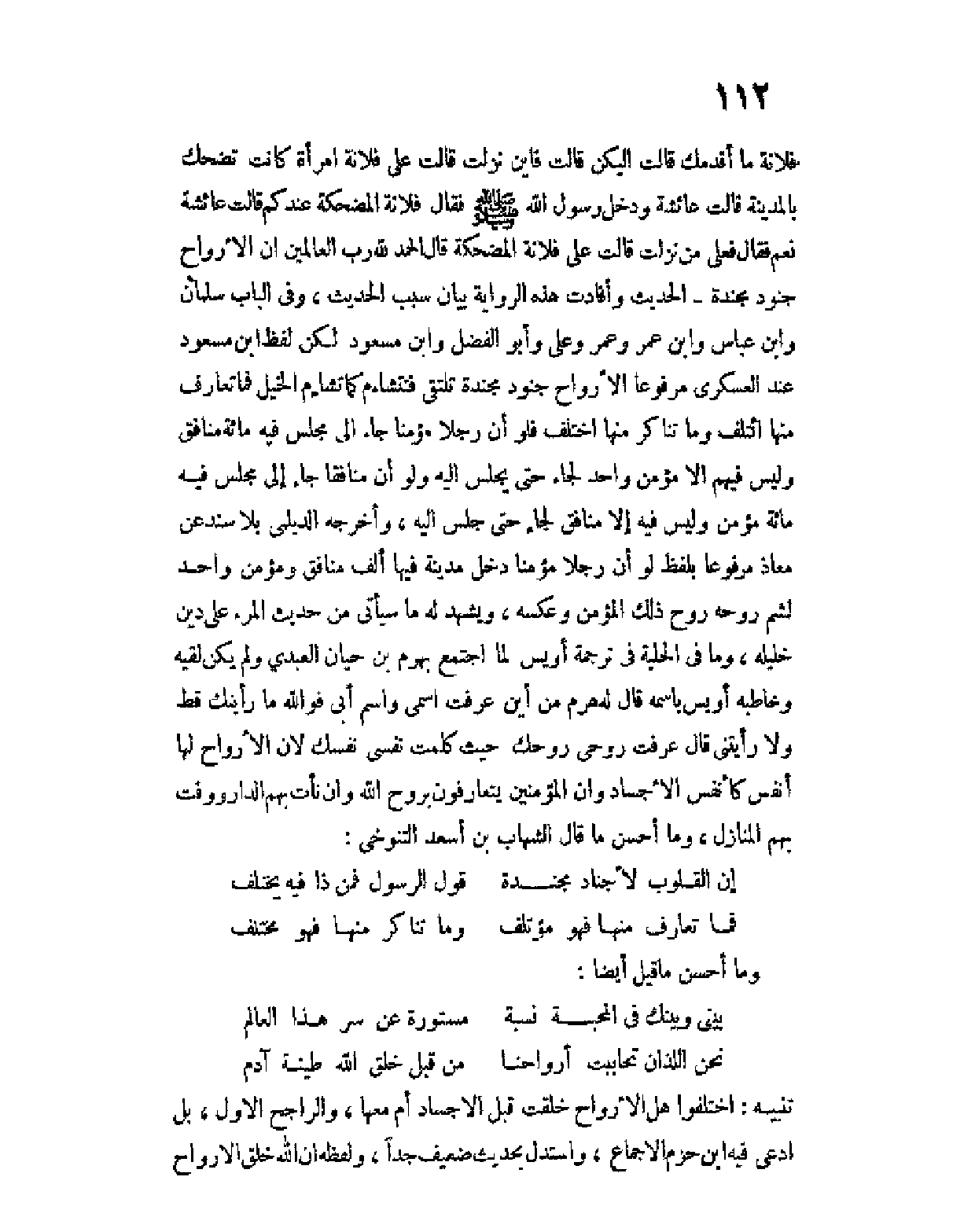 فلانة ما أقدمك قالت إليكن قالت فأين نزلت قالت على فلانة امرأة كانت تضحك بالمدينة قالت عائشة ودخل رسول الله صلى الله عليه وسلم فقال فلانة المضحكة عندكم قالت عائشة نعم فقال فعلى من نزلت قالت على فلانة المضحكة قال الحمد لله رب العالمين إن الأرواح جنود مجندة - الحديث وأفادت هذه الرواية بيان سبب الحديث، وفي الباب سلمان وابن عباس وابن عمر وعمر وعلي وأبو الفضل وابن مسعود لكن لفظ ابن مسعود عند العسكري مرفوعا الأرواح جنود مجندة تلتقي فتشاءم كما تشاءم الخيل فما تعارف منها ائتلف وما تناكر منها اختلف فلو أن رجلا مؤمنا جاء إلى مجلس فيه مائة منافق وليس فيهم إلا مؤمن واحد لجاء حتى يجلس إليه ولو أن منافقا جاء إلى مجلس فيه مائة مؤمن وليس فيه إلا منافق لجاء حتى جلس إليه، وأخرجه الديلمي بلا سند عن معاذ مرفوعا بلفظ لو أن رجلا مؤمنا دخل مدينة فيها ألف منافق ومؤمن واحد لشم روحه روح ذلك المؤمن وعكسه، ويشهد له ما سيأتي من حديث المرء على دين خليله، وما في الحلية في ترجمة أويس لما اجتمع بهرم بن حيان العبدي ولم يكن لقيه وخاطبه أويس باسمه قال له هرم من أين عرفت اسمي واسم أبي فوالله ما رأيتك قط ولا رأيتني قال عرفت روحي روحك حيث كلمت نفسي نفسك لأن الأرواح لها أنفس كأنفس الأجساد وإن المؤمنين يتعارفون بروح الله وإن نأت بهم الدار ووفت بهم المنازل، وما أحسن ما قال الشهاب بن أسعد التنوخي: