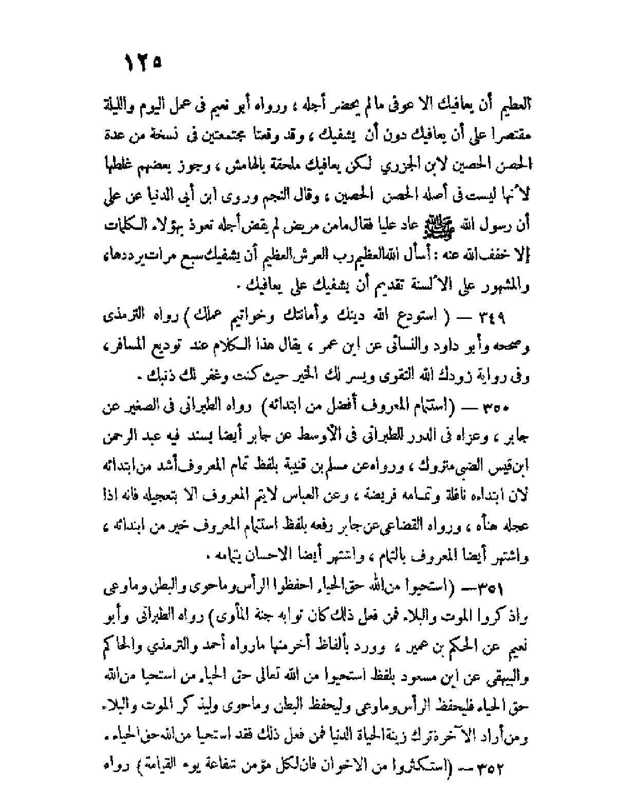 351 - (استحيوا من الله حق الحياء احفظوا الرأس وما حوى والبطن وما وعى واذكروا الموت والبلاء فمن فعل ذلك كان ثوابه جنة المأوى) رواه الطبراني وأبو نعيم عن الحكم بن عمير، وورد بألفاظ أخر منها ما رواه أحمد والترمذي والحاكم والبيهقي عن ابن مسعود بلفظ استحيوا من الله تعالى حق الحياء من استحيا من الله حق الحياء فليحفظ الرأس وما وعى وليحفظ البطن وما حوى وليذكر الموت والبلاء ومن أراد الآخرة ترك زينة الحياة الدنيا فمن فعل ذلك فقد استحيا من الله حق الحياء.
