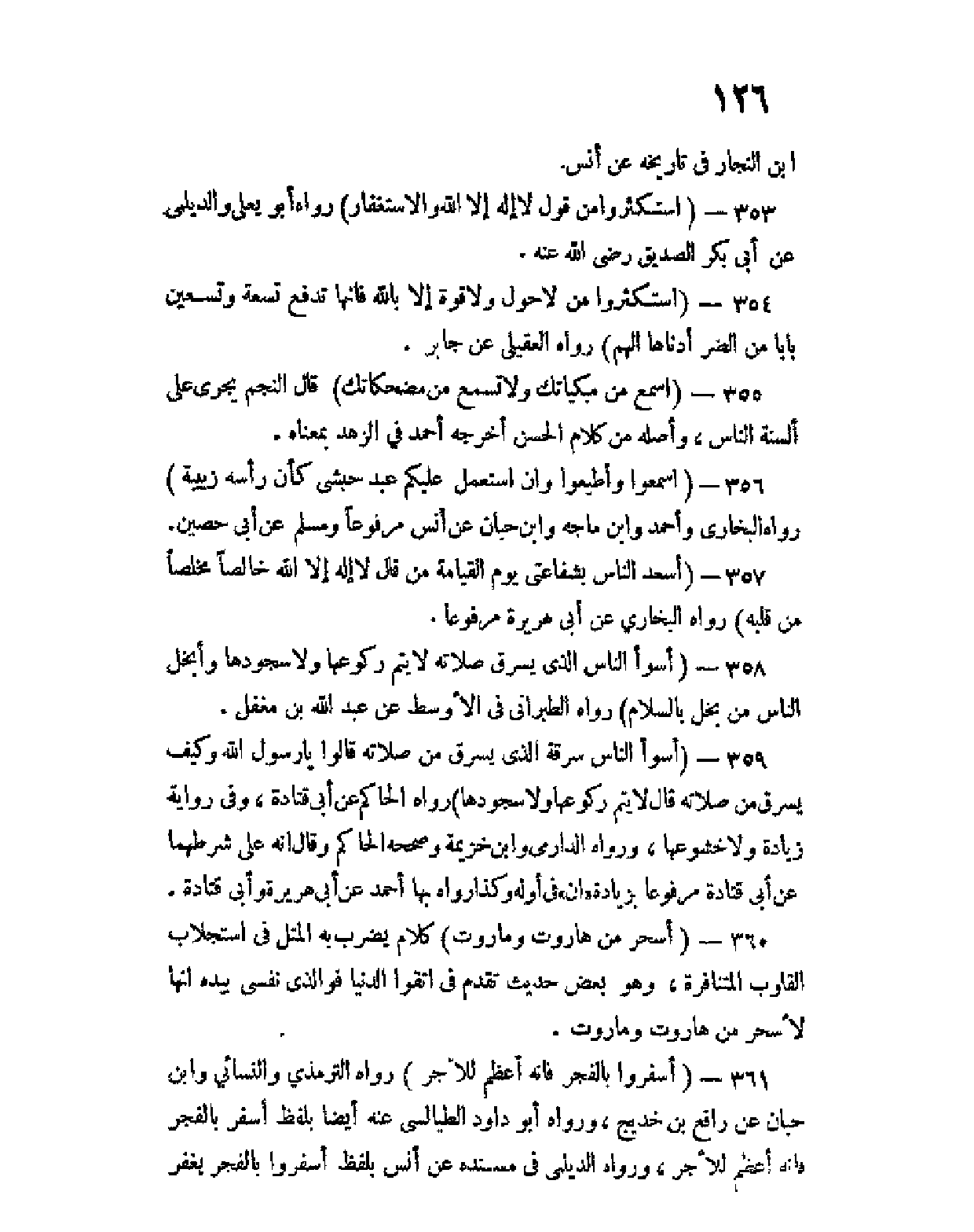 361 - (أسفِروا بالفجر فإنه أعظم للأجر) رواه الترمذي والنسائي وابن حبان عن رافع بن خديج، ورواه أبو داود الطيالسي عنه أيضا بلفظ أسْفِرْ بالفجر فإنه أعظم للأجر، ورواه الديلمي في مسنده عم أنس بلفظ أسفروا بالفجر يغفر