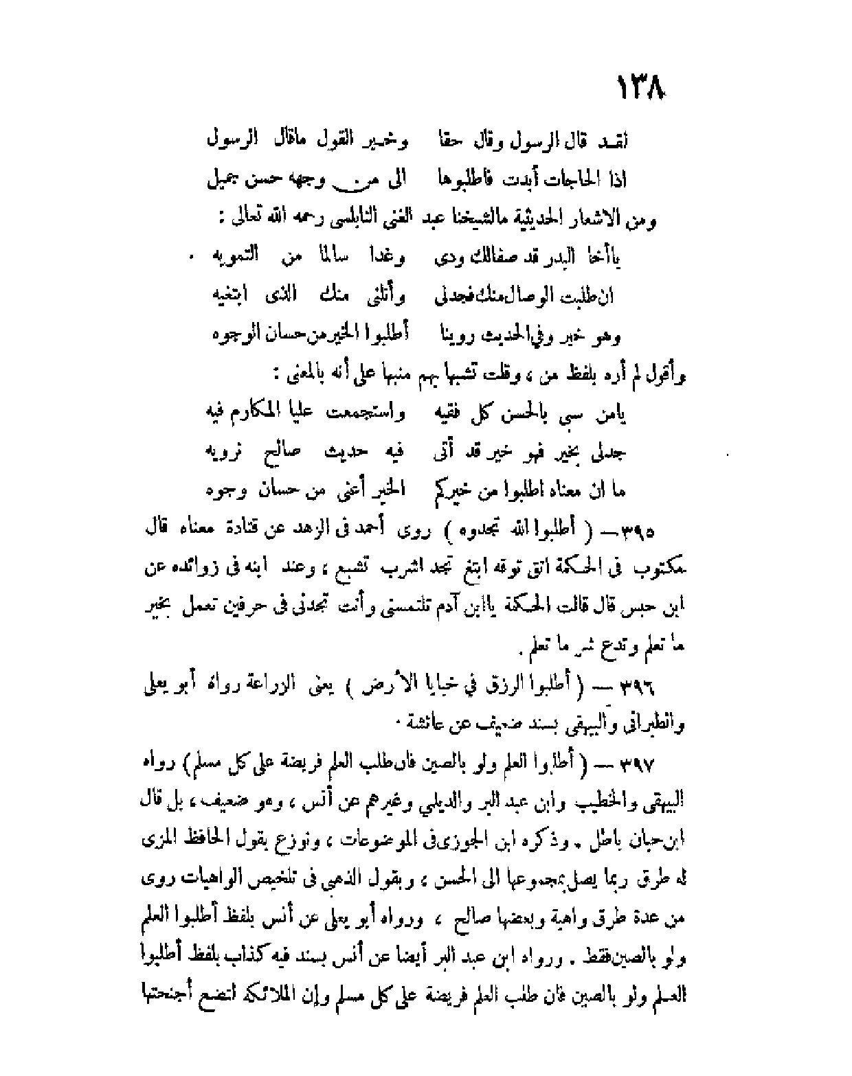 397 - (اطلبوا العلم ولو بالصين فإن طلب العلم فريضة على كل مسلم) رواه البيهقي والخطيب وابن عبد البر والديلمي وغيرهم عن أنس، وهو ضعيف، بل قال ابن حبان باطل، وذكره ابن الجوزي في الموضوعات، ونوزع بقول الحافظ المزي له طرق ربما يصل بمجموعها إلى الحسن، وبقول الذهبي في تلخيص الواهيات روى من عدة طرق واهية وبعضها صالح، ورواه أبو يعلى عن أنس بلفظ اطلبوا العلم ولو بالصين فقط، ورواه ابن عبد البر أيضا عن أنس بسند فيه كذاب بلفظ اطلبوا العلم ولو بالصين فإن طلب العلم فريضة على كل مسلم وإن الملائكة لتضع أجنحتها