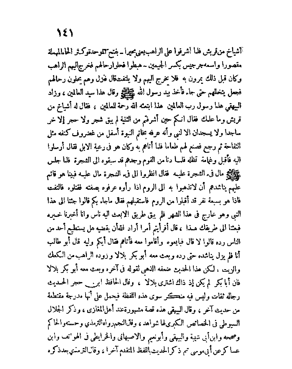 أشياخ من قريش فلما أشرفوا على الراهب يعني بحيرا - بفتح الموحدة وكثر الحاء المهملة مقصورا واسمه جِرجِيس، بكسر الجيمين - هبطوا فحلوا رحالهم فخرج إليهم الراهب وكان قبل ذلك يمرون به فلا يخرج إليهم ولا يلتفت قال فنزل وهم يحلون رحالهم فجعل يتخللهم حتى جاء فأخذ بيد رسول الله صلى الله عليه وسلم وقال هذا سيد العالمين، وزاد البيهقي هذا رسول رب العالمين هذا ابتعثه الله رحمة للعالمين، فقال له أشياخ من قريش وما علمك فقال إنكم حين أشرفتم من الثنية لم يبق شجر ولا حجر إلا خر ساجدا ولا يسجدان إلا لنبي وأنه عرفه بخاتم النبوة أسفل من غضروف كتفه مثل التفاحة ثم رجع فصنع لهم طعاما فلما أتاهم به وكان هو في رعية الإبل فقال أرسلوا إليه فأقبل وغمامة تظله فلما دنا من القوم وجدهم قد سبقوه إلى الشجرة فلما جلس صلى الله عليه وسلم مال فئ الشجرة عليه فقال انظروا إلى فئ الشجرة مال عليه فبينا هو قائم عليهم يناشدهم أن لا تذهبوا به إلى الروم إذا رؤوه عرفوه بصفته فقتلوه فالتفت فإذا هو بسبعة نفر قد أقبلوا من الروم فاستقبلتهم فقال ما جاء بكم قالوا جئنا إلى هذا النبي وهو خارج في هذا الشهر فلم يبق طريق إلا بعث إليه ناس وإنا أخبرنا خبره فبعثنا إلى طريقك هذا، قال أفرأيتم أمرا أراد الله أن يقضيه هل يستطيع أحد من الناس ردَّه قالوا لا قال فبايعوه وأقاموا معه فأتاهم فقال أيكم وليه قال أبو طالب أنا فلم يزل يناشده حتى رده وبعث معه أبو بكر بلالا وزوده الراهب من الكعك والزيت.