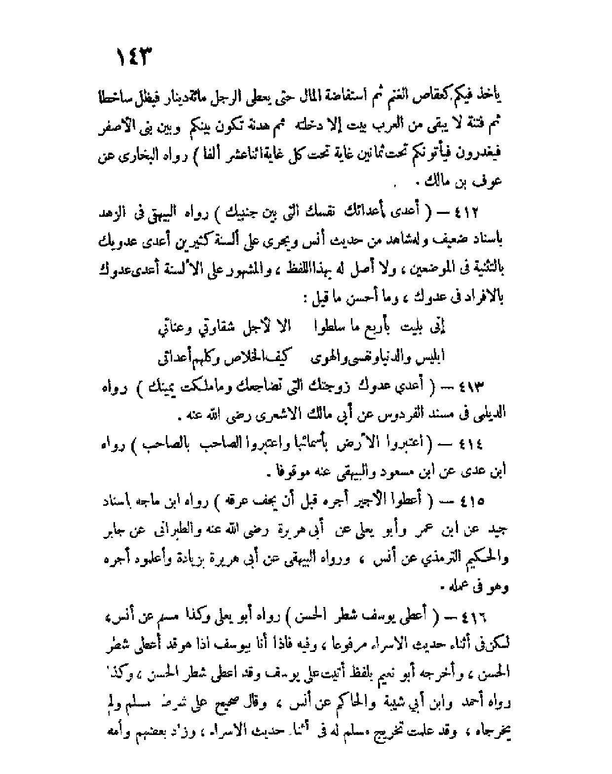 412 - (أعدى أعدائك نفسك التي بين جنبيك) رواه البيهقي في الزهد بإسناد ضعيف وله شاهد من حديث أنس ويجرى على ألسنة كثيرين أعدى عدويك بالتثنية في الموضعين، ولا أصل له بهذا اللفظ، والمشهور على الألسنة أعدى عدوك بالأفراد في عدوك، وما أحسن ما قيل: