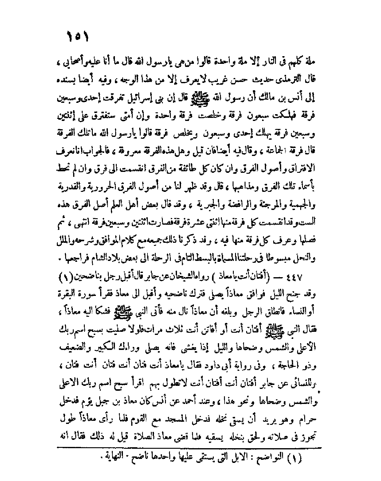 447 - (أفتَّانٌ أنت يا معاذ) رواه الشيخان عن جابر قال أقبل رجل بناضحين (¬1) وقد جنح الليل فوافق معاذا يصلي فترك ناضحيه وأقبل إلى معاذ فقرأ سورة البقرة أو النساء فانطلق الرجل وبلغه أن معاذا نال منه فأتى النبي صلى الله عليه وسلم فشكا إليه معاذا،