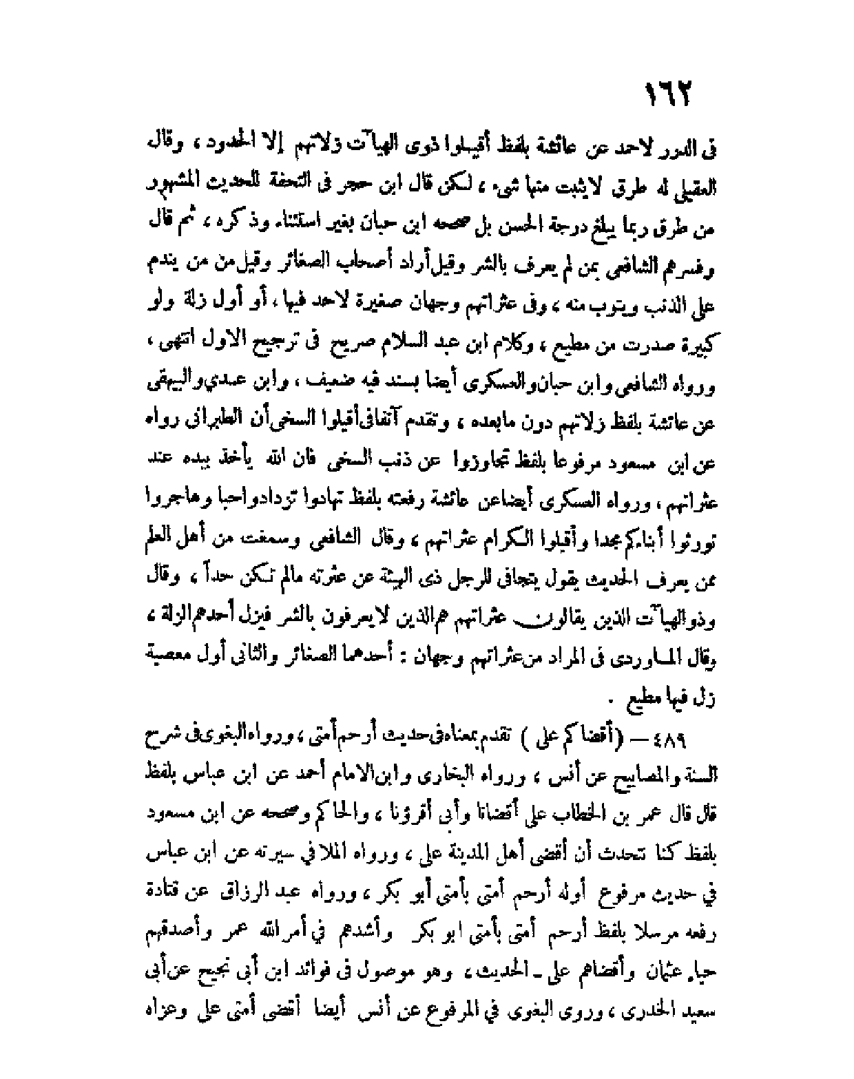 في الدرر لأحمد عن عائشة بلفظ أقيلوا ذوي الهيآت زلاتهم إلا الحدود، وقال العقيلي له طرق لا يثبت منها شئ، لكن قال ابن حجر في التحفة للحديث المشهور من طرق ربما يبلغ درجة الحسن بل صححه ابن حبان بغير استثناء وذكره، ثم قال وفسرهم الشافعي بمن لم يعرف بالشر وقيل أراد أصحاب الصغائر وقيل من من يندم على الذنب ويتوب منه، وفي عثراتهم وجهان صغيرة لا حد فيها، أو أول زلة ولو كبيرة صدرت من مطيع، وكلام ابن عبد السلام صريح في ترجيح الأول انتهى، ورواه الشافعي وابن حبان والعسكري أيضا بسند ضعيف، وابن عدي والبيهقي عن عائشة بلفظ زلاتهم دون ما بعده، وتقدم آنفا في أقيلوا السخي أن الطبراني رواه عن ابن مسعود مرفوعا بلفظ تجاوزوا عن ذنب السخي فإن الله يأخذ بيده عند عثراتهم، ورواه العسكري أيضا عن عائشة رفعته بلفظ تهادوا تزدادوا حبا وهاجروا تورثوا أبنائكم مجدا وأقيلوا الكرام عثراتهم، وقال الشافعي وسمعت من أهل العلم ممن يعرف الحديث يقول يتجافى للرجل ذي الهيئة عن عثرته ما لم تكن حدا، وقال وذو الهيآت الذين يقالون عثراتهم هم الذين لا يعرفون بالشر فيزل أحدهم الزلة، وقال الماوردي المراد من عثراتهم وجهان: أحدهما الصغائر والثاني أول معصية زل فيها مطيع.