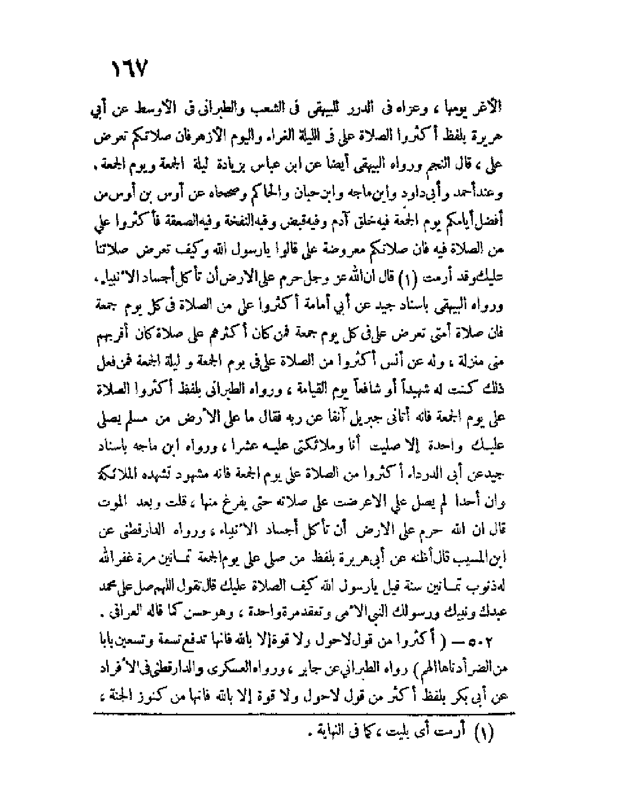 الأغر يومها، وعزاها في الدرر للبيهقي في الشعب والطبراني في الأوسط عن أبي هريرة بلفظ أكثروا الصلاة علي في الليلة الغراء واليوم الأزهر فإن صلاتكم تُعرض عليَّ، قال النجم ورواه البيهقي أيضا عن ابن عباس بزيادة ليلة الجمعة ويوم الجمعة، وعند أحمد وأبي داود وابن ماجه وابن حبان والحاكم وصححاه عن أوس بن أوس من أفضل أيامكم يوم الجمعة فيه خلق آدم وفيه قبض وفيه النفخة وفيه الصعقة فأكثروا عليَّ من الصلاة فيه فإن صلاتكم معروضة عليَّ قالوا يا رسول الله وكيف تعرض صلاتنا عليك وقد أرِمْتَ؟ (¬1) قال إن الله عز وجل حرم على الأرض أن تأكل أجساد الأنبياء، ورواه البيهقي بإسناد جيد عن أبي أمامة أكثروا علي من الصلاة في كل يوم جمعة فإن صلاة أمتي تعرض علي في كل يوم جمعة فمن كان أكثرهم علي صلاة كان أقربهم مني منزلة، وله عن أنس أكثروا من الصلاة علي في يوم الجمعة وليلة الجمعة فمن فعل ذلك كنت له شهيدا أو شافعا يوم القيامة، ورواه الطبراني بلفظ أكثروا الصلاة علي يوم الجمعة فإنه أتاني جبريل آنفا عن ربه فقال ما على الأرض من مسلم يصلي عليك واحدة إلا صليت أنا وملائكتي عليه عشرا، ورواه ابن ماجه بإسناد جيد عن أبي الدرداء أكثروا من الصلاة علي يوم الجمعة فإنه مشهود تشهده الملائكة وأن أحدا لم يصل علي إلا عرضت علي صلاته حتى يفرغ منها، قلت وبعد الموت قال إن الله حرم على الأرض أن تأكل أجساد الأنبياء، ورواه الدارقطني عن ابن المسيب قال أظنه عن أبي هريرة بلفظ من صلى علي يوم الجمعة ثمانين مرة غفر الله له ذنوب ثمانين سنة قيل يا رسول الله كيف الصلاة عليك قال تقول اللهم صل على محمد عبدك ونبيك ورسولك النبي الأمي وتعقد مرة واحدة، وهو حسن كما قاله العراقي.