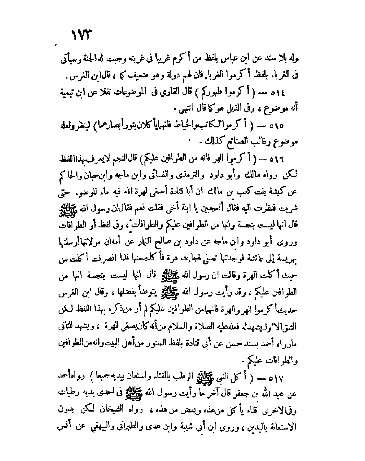516 - (أكرموا الهر فإنه من الطَّوَّافين عليكم) قال النجم لا يعرف بهذا اللفظ لكن رواه مالك وأبو داود والترمذي والنسائي وابن ماجه وابن حبان والحاكم عن كبشة بنت كعب بن مالك أن أبا قتادة أصغى لهرةٍ إناءً فيه ماء للوضوء حتى شربت فنظرتُ إليه فقال أتعجبين يا ابنة أخي فقلت نعم فقال أن رسول الله صلى الله عليه وسلم قال إنها ليست بنجسة وإنها من الطوافين عليكم والطوافات، وفي لفظ أو الطوافات وروى أبو داود وابن ماجه عن داود بن صالح التمار عن أمه أن مولاتها أرسلتها بهريسة إلى عائشة فوجدتها تصلي فجاءت هرة فأكلت منها فلما انصرفت أكلت من حيث أكلت الهرة وقالت أن رسول الله صلى الله عليه وسلم قال إنها ليست بنجسة إنها من الطوافين عليكم، وقد رأيت رسول الله صلى الله عليه وسلم يتوضأ بفضلها، وقال ابن الغرس حديث أكرموا الهر والهرة فإنهما من الطوافين عليكم لم أر من ذكره بهذا اللفظ لكن الشق الأول يشهد له فعله عليه الصلاة والسلام من أنه كان يصغي للهرة، ويشهد للثاني ما رواه أحمد بسند حسن عن أبي قتادة بلفظ السنور من أهل البيت وإنه من الطوافين والطوافات عليكم.