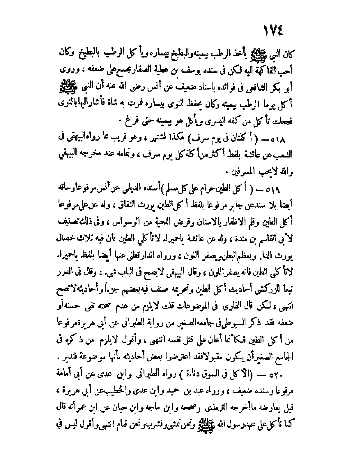520 - (الأكل في السوق دناءة) رواه الطبراني وابن عدي عن أبي أمامة مرفوعا وسنده ضعيف، ورواه عبد بن حميد وابن عدي والخطيب عن أبي هريرة، قيل يعارضه ما أخرجه الترمذي وصححه وابن ماجه وابن حبان عن ابن عمر أنه قال كنا نأكل على عهد رسول الله صلى الله عليه وسلم ونحن نمشي ونشرب ونحن قيام انتهى وأقول ليس في