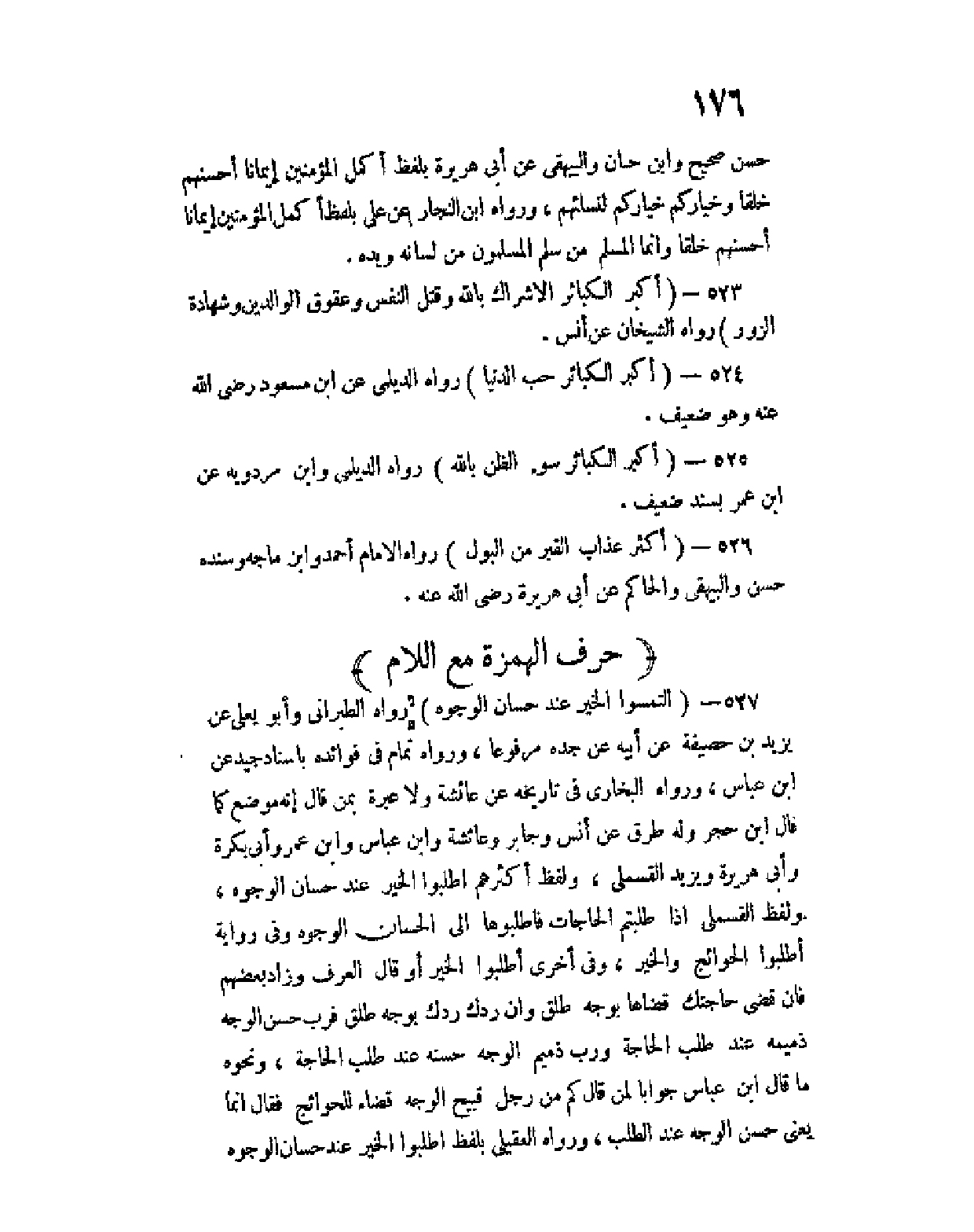527 - (اِلتمسوا الخير عند حسان الوجوه) رواه الطبراني وأبو يعلى عن يزيد بن حصيفة عن أبيه عن جده مرفوعا، ورواه تمام في فوائده بإسناد جيد عن ابن عباس، ورواه البخاري في تاريخه عن عائشة ولا عبرة بمن قال إنه موضع كما قال ابن حجر وله طرق عن أنس وجابر وعائشة وابن عباس وابن عمر وأبي بكرة وأبي هريرة ويزيد القسملي، ولفظ أكثرهم اطلبوا الخير عند حسان الوجوه، ولفظ القسملي إذا طلبتم الحاجات فاطلبوها إلى الحسان الوجوه وفي رواية اطلبوا الحوائج والخير، وفي أخرى اطلبوا الخير أو قال العرف وزاد بعضهم فإن قضى حاجتك قضاها بوجه طلق وإن ردك ردك بوجه طلق فرب حسن الوجه ذميمه عند طلب الحاجة ورب ذميم الوجه حسنه عند طلب الحاجة، ونحوه ما قال ابن عباس جوابا لمن قال كم من رجل قبيح الوجه قضاء للحوائج فقال إنما يعني حسن الوجه عند الطلب، ورواه العقيلي بلفظ اطلبوا الخير عند حسان الوجوه