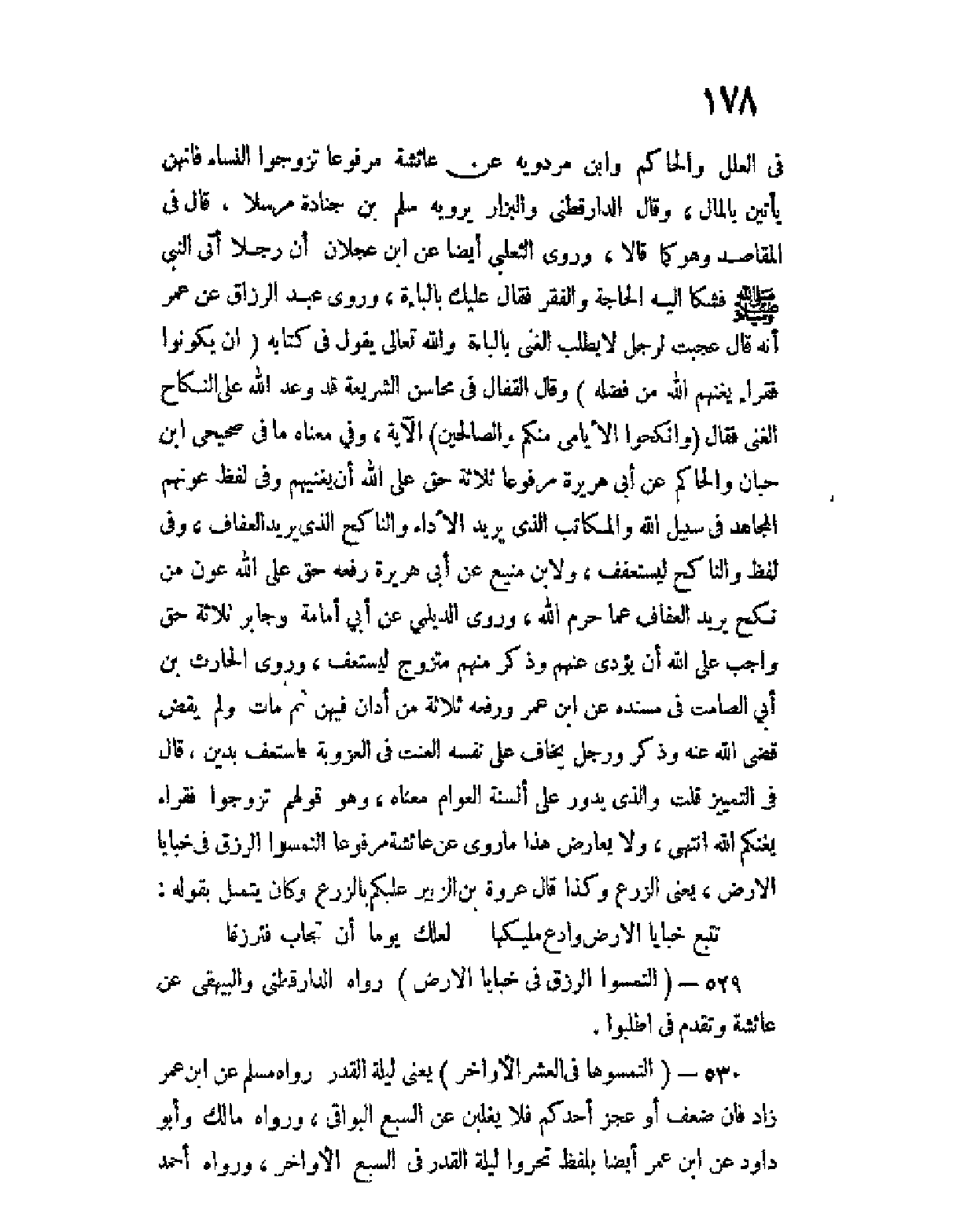 وروى الثعلبي أيضا عن ابن عُجلان أن رجلا أتى النبي صلى الله عليه وسلم فشكا إليه الحاجة والفقر فقال " عليك بالباءة "، وروى عبد الرزاق عن عمر أنه قال: عجبت لرجل لا يطلب الغنى بالباءة، والله تعالى يقول في كتابه ... (إن يكونوا فقراء يُغْنِهِمُ الله من فضله) ... وقال القفَّال في محاسن الشريعة: قد وعد الله على النكاح الغنى فقال ... (وأنكحوا الأيامى منكم والصالحين) ... الآية، وفي معناه ما في صحيحي ابن حبان والحاكم عن أبي هريرة مرفوعا: " ثلاثة حق على الله أن يغنيهم " وفي لفظ " عونهم " " المجاهد في سبيل الله، والمكاتب الذي يريد الأداء، والناكح الذي يريد العفاف "، وفي لفظ " والناكح ليستعفف "، ولابن منيع عن أبي هريرة رفعه " حق على الله عون من نكح يريد العفاف عما حرم الله "، وروى الديلمي عن أبي أمامة وجابر " ثلاثة حق واجب على الله أن يؤدى عنهم " وذكر منهم " متزوج ليستعف "، وروى الحارث بن أبي الصامت في مسنده عن ابن عمر ورفعه " ثلاثة من اِدّانَ فيهن ثم مات ولم يقض قضى الله عنه " وذكر " ورجل يخاف على نفسه العنت في العزوبة، فاستعَفّ بدَيْنٍ "، قال في التمييز: قلت والذي يدور على ألسنة العوّام معناه، وهو قولهم " تزوجوا فقراء يغنكم الله ".