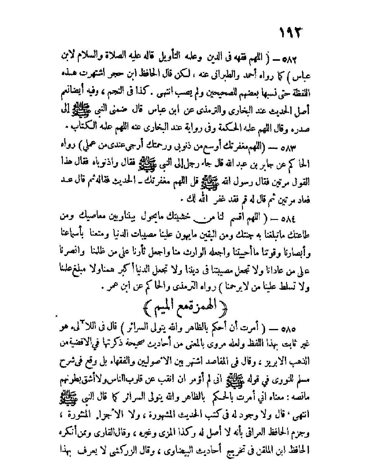 582 - (اللهم فَقِّهْهُ في الدين وعَلِّمه التأويل قاله عليه الصلاة والسلام لابن عباس) كما رواه أحمد والطبراني عنه، لكن قال الحافظ ابن حجر اشتهرت هذه اللفظة حتى نسبها بعضهم للصحيحين ولم يُصبْ انتهى.