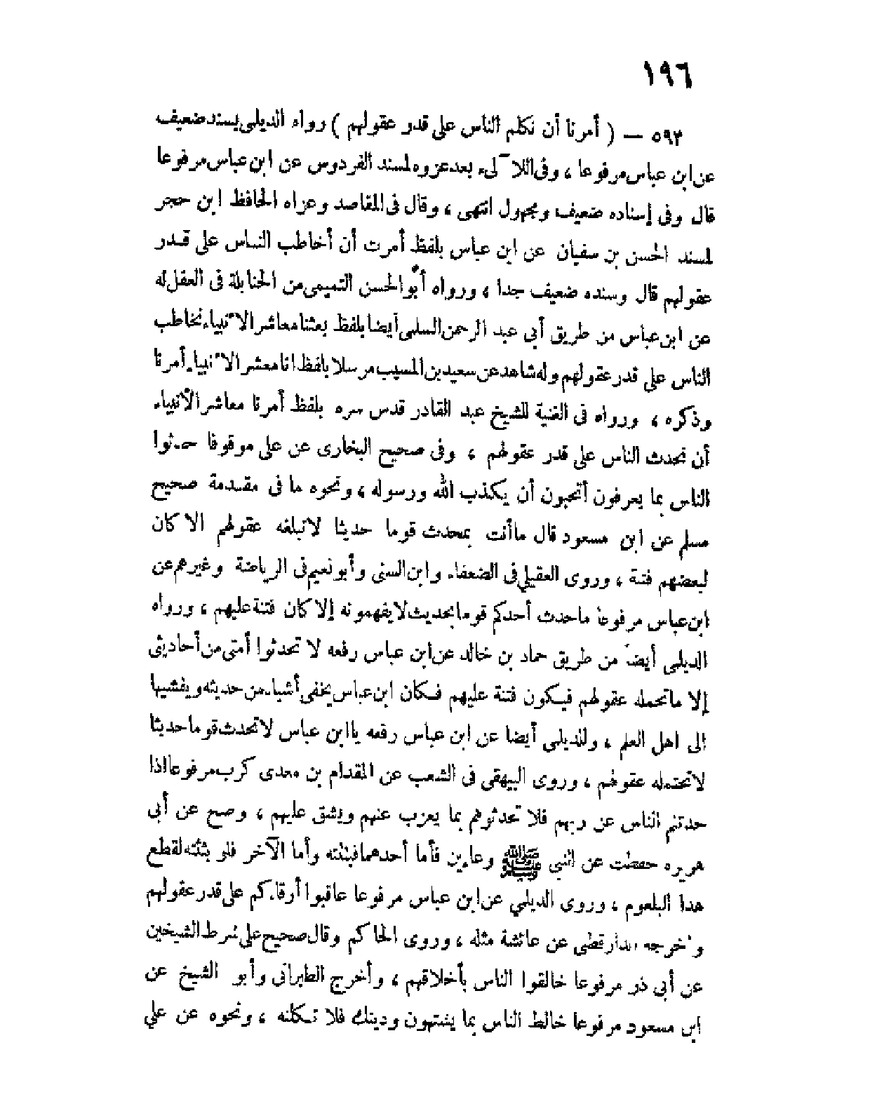 592 - (أُمِرْنا أن نُكلِّمَ الناس على قدر عقولِهم) رواه الديلمي بسند ضعيف عن ابن عباس مرفوعا، وفي اللآلئ بعد عزوه لمسند الفردوس عن ابن عباس مرفوعا قال وفي إسناده ضعيف ومجهول انتهى، وقال في المقاصد وعزاه الحافظ ابن حجر لمسند الحسن بن سفيان عن ابن عباس بلفظ أمرت أن أخاطب الناس على قدر عقولهم قال وسنده ضعيف جدا، ورواه أبو الحسن التميمي من الحنابلة في العقل له عن ابن عباس من طريق أبي عبد الرحمن السُلَمي أيضا بلفظ بُعْثِنا معاشر الأنبياء نخاطب الناس على قدر عقولهم وله شاهد عن سعيد بن المسيب مرسلا بلفظ أنا معشر الأنبياء أمرنا وذكره، ورواه في الغنية للشيخ عبد القادر قدس سره بلفظ أمرنا معاشر الأنبياء أن نحدث الناس على قدر عقولهم، وفي صحيح البخاري عن علي موقوفا حدثوا الناس بما يعرفون أتحبون أن يكذب الله ورسوله، ونحوه ما في مقدمة صحيح مسلم عن ابن مسعود قال ما أنت بمحدث قوما حديثا لا تبلغه عقولهم إلا كان لبعضهم فتنة، وروي العقيلي في الضعفاء وابن السني وأبو نعيم في الرياضة وغيرهم عن ابن عباس مرفوعا ما حدث أحدكم قوما بحديث لا يفهمونه إلا كان فتنة عليهم، ورواه الديلمي أيضا من طريق حماد بن خالد عن ابن عباس رفعه لا تحدثوا أمتي من أحاديثي إلا ما تحمله عقولهم فيكون فتنة عليهم فكان ابن عباس يخفي أشياء من حديثه ويفشيها إلى أهل العلم، وللديلمي أيضا عن ابن عباس رفعه يا ابن عباس لا تحدث قوما حديثا لا تحتمله عقولهم، وروى البيهقي في الشعب عن المقدام بن معدي كرب مرفوعا إذا حدثتم الناس عن ربهم فلا تحدثوهم بما يعزب عنهم ويشق عليهم، وصح عن أبي هريرة حفظت عن النبي صلى الله عليه وسلم وعاءَيْنِ فأما أحدهما فَبَثثْتُهُ وأما الآخر فلو بثثتُه لقُطع هذا البلعوم، وروى الديلمي عن ابن عباس مرفوعا عاقبوا أرقاءكم على قدر عقولهم وأخرجه الدارقطني عن عائشة مثله، وروى الحاكم وقال صحيح على شرط الشيخين عن أبي ذر مرفوعا خالقوا الناس بأخلاقهم، وأخرج الطبراني وأبو الشيخ عن ابن مسعود خالط الناس بما يشتهون ودينك فلا تكلنه، ونحوه عن علي