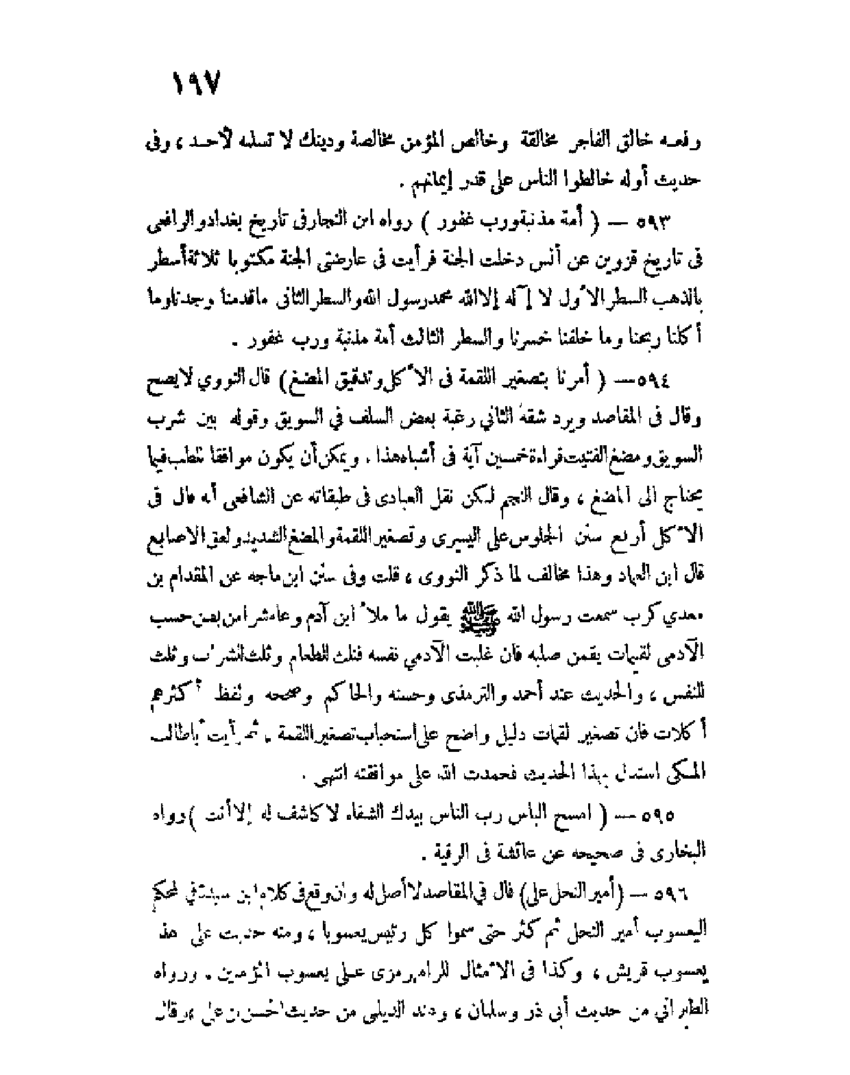 594 - (أُمِرْنا بتصغير اللقمة في الأكل وتدقيق المَضْغ) قال النووي لا يصح وقال في المقاصد ويرد شقه الثاني رغبة بعض السلف في السويق وقوله بين شرب السويق ومضغ الفتيت قراءة خمسين آية في أشباه هذا، ويمكن أن يكون موافقا للطب فيما يحتاج إلى المضغ، وقال النجم لكن نقل العَبَّاديُّ في طبقاته عن الشافعي أنه قال في الأكل أربع سنن الجلوس علي اليسرى وتصغير اللقمة والمضغ الشديد ولعق الأصابع قال ابن العماد وهذا مخالف لما ذكر النووي، قلت وفي سنن ابن ماجه عن المقدام بن معدي كرب سمعت رسول الله صلى الله عليه وسلم يقول ما ملأ ابن آدم وعاء شرا من بطنٍ حَسْبُ الآدمي لقيمات يقمن صُلبه فإن غلبت الآدميَّ نفسه فثلث للطعام وثلث للشراب وثلث للنفس، والحديث عند أحمد والترمذي وحسنه والحاكم وصححه ولفظ أكثرهم أكلات فإن تصغير لقمات دليل واضح على استحباب تصغير اللقمة، ثم رأيت أبا طالب المكي استدل بهذا الحديث فحمدت الله على موافقته انتهى.