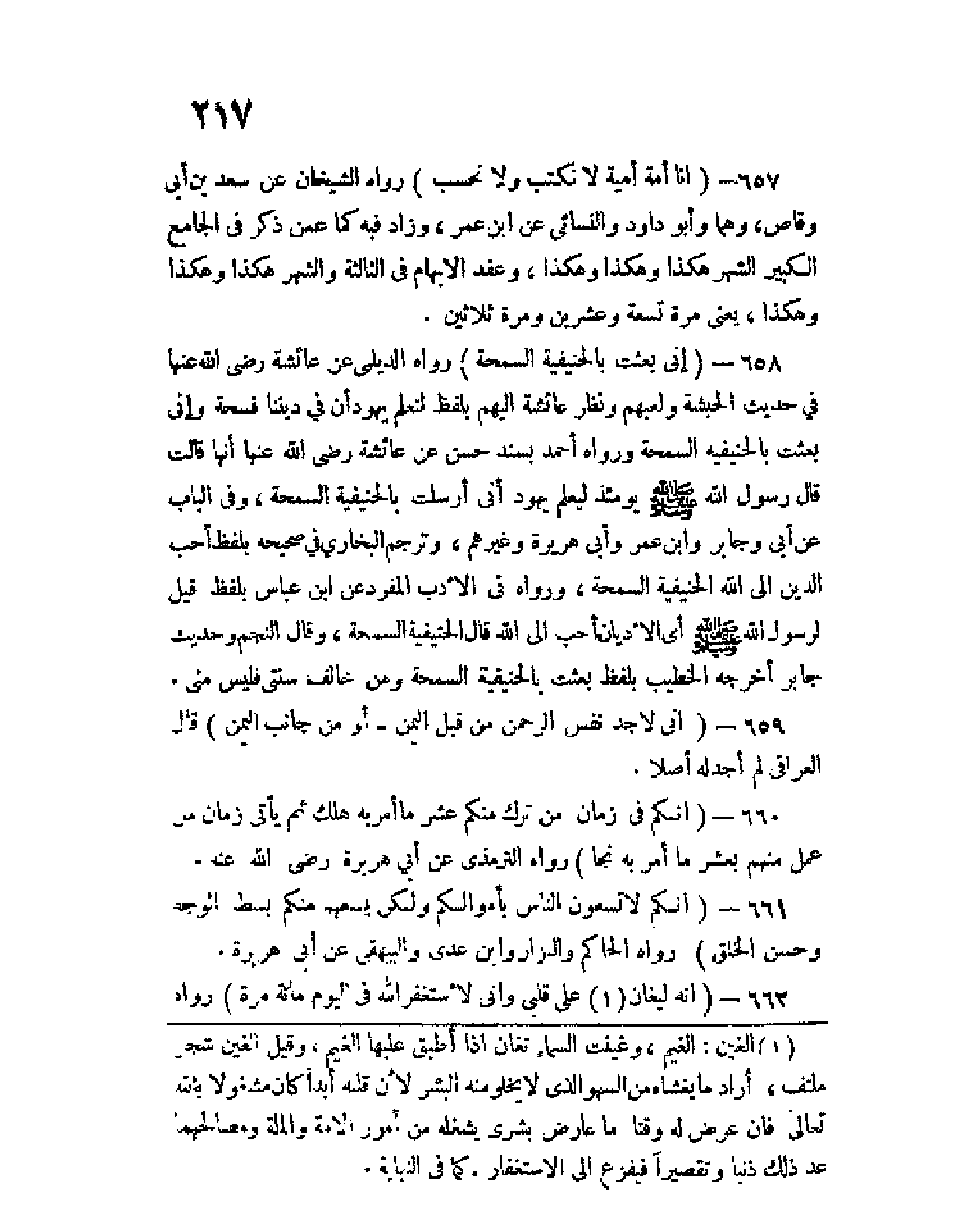 657 - (إنّا أُمَّةٌٌ أُمِّيَّةٌ لا نكتب ولا نحسب) رواه الشيخان عن سعد بن أبي وقاص، وهما وأبو داود والنسائي عن ابن عمر، وزاد فيه عمن ذكر كما الجامع الكبير الشهر هكذا وهكذا وهكذا، وعقد الإبهام في الثالثة والشهر هكذا وهكذا وهكذا، يعني مرة تسعة وعشرين ومرة ثلاثين.
