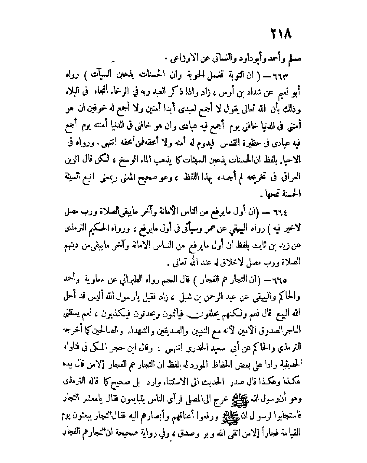 665 - (إن التجار هم الفُجّار) قال النجم رواه الطبراني عن معاوية وأحمد والحاكم والبيهقي عن عبد الرحمن بن شبل، زاد فقيل يا رسول الله أليس قد أحل الله البيع قال نعم ولكنهم يحلفون فيأثمون ويحدثون فيكذبون، نعم يستثنى التاجر الصدوق الأمين لأنه مع النبيين والصديقين والشهداء والصالحين كما أخرجه الترمذي والحاكم عن أبي سعيد الخدري انتهى، وقال ابن حجر المكي في فتاواه الحديثية رادا على بعض الحفاظ المورِد له بلفظ: أن التجار هم الفجار إلا من قال بيده هكذا وهكذا قال صدر الحديث إلى الاستثناء وارد بل صحيح كما قاله الترمذي وهو أن رسول الله صلى الله عليه وسلم خرج إلى المصلى فرأى الناس يتبايعون فقال يا معشر التجار فاستجابوا لرسول الله صلى الله عليه وسلم ورفعوا أعناقهم وأبصارهم إليه فقال التجار يبعثون يوم القيامة فجارا إلا من اتقى الله وبر وصدق، وفي رواية صحيحة إن التجار هم الفجار