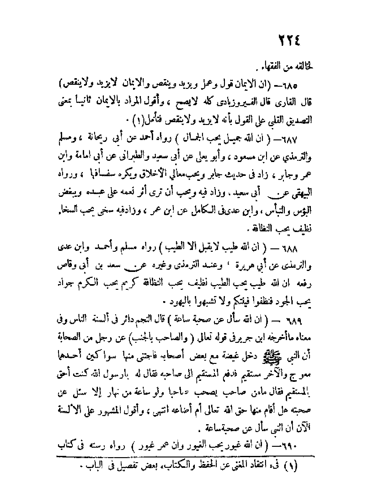 685 - (أن الإيمان قول وعمل ويزيد وينقص والإيمان لا يزيد ولا ينقص) قال القاري قال الفيروزآبادي كله لا يصح، وأقول المراد بالإيمان ثانيا بمعنى التصديق القلبي على القول بأنه لا يزيد ولا ينقص فتأمل (¬1) .