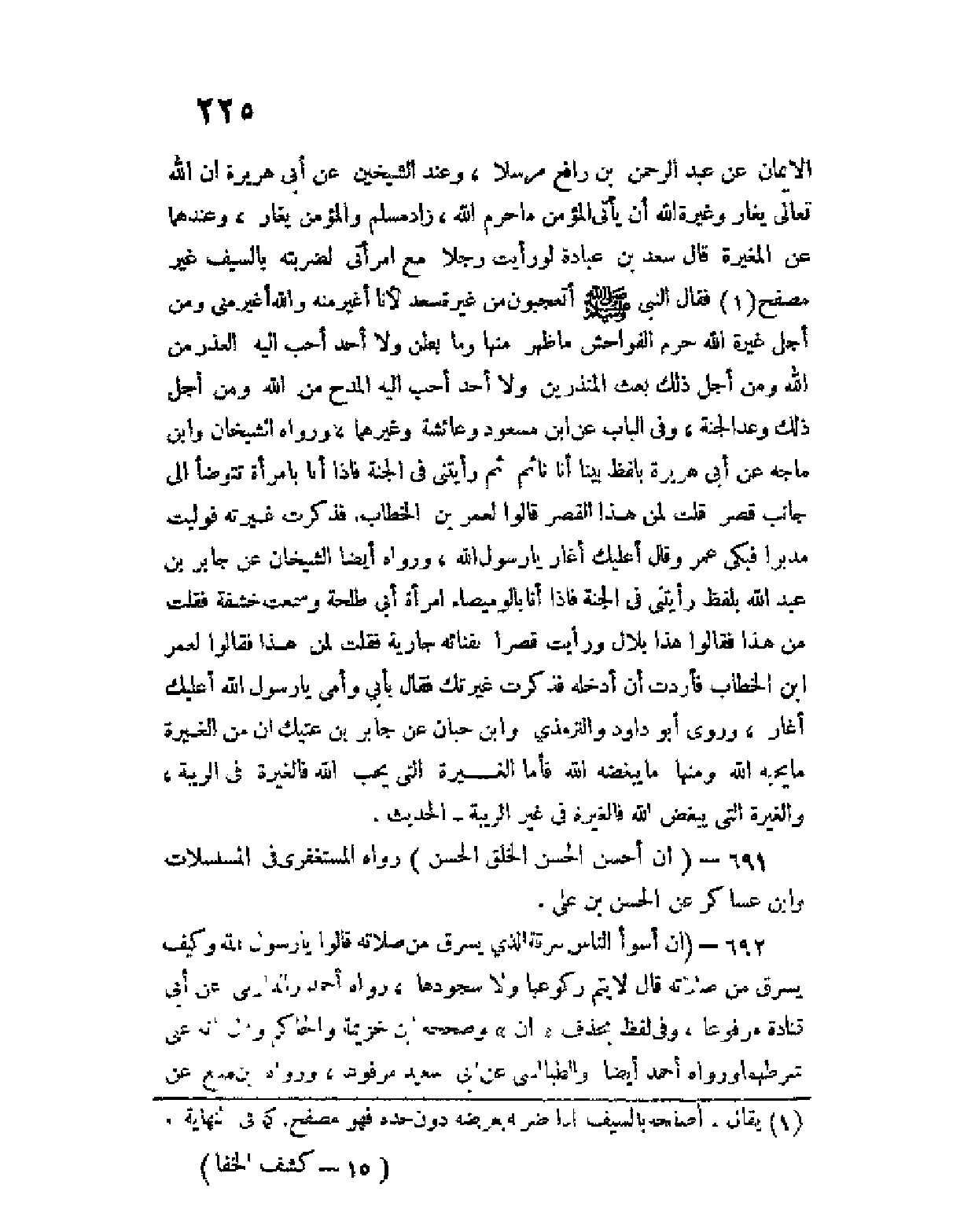 الإيمان عن عبد الرحمن بن رافع مرسلا، وعند الشيخين عن أبي هريرة أن الله تعالى يغار وغَيرة الله أن يأتي المؤمن ما حرم الله، زاد مسلم والمؤمن يغار، وعندهما عن المغيرة قال سعد بن عبُادة لو رأيت رجلا مع امرأتي لضربته بالسيف غير مصفح (¬1) فقال النبي صلى الله عليه وسلم أتعجبون من غيرة سعد لأنا أغير منه والله أغير مني ومن أجل غيرة الله حرم الفواحش ما ظهر منها وما بطن ولا أحد أحب إليه العذر من الله ومن أجل ذلك بعث المنذرين ولا أحد أحب إليه المدح من الله ومن أجل ذلك وعد الجنة، وفي الباب عن ابن مسعود وعائشة وغيرهما، ورواه الشيخان وابن ماجه عن أبي هريرة بلفظ بينا أنا نائم ثم رأيتني في الجنة فإذا أنا بامرأة تتوضأ إلى جانب قصر قلت لمن هذا القصر قالوا لعمر بن الخطاب فذكرت غيرته فوليت مدبرا فبكى عمر وقال أعليك أغار يا رسول الله، ورواه أيضا الشيخان عن جابر بن عبد الله بلفظ رأيتني في الجنة فإذا أنا بالوميصاء امرأة أبي طلحة وسمعت خَشْفة فقلت من هذا فقالوا هذا بلال ورأيت قصرا بفنائه جارية فقلت لمن هذا فقالوا لعمر ابن الخطاب فأردت أن أدخله فذكرت غيرتك فقال بأبي وأمي يا رسول الله أعليك أغار، وروى أبو داود والترمذي وابن حبان عن جابر بن عتيك إن من الغيرة ما يحبه الله ومنها ما يبغضه الله فأما الغيرة التي يحب الله فالغيرة في الريبة، والغيرة التي يبغض الله فالغيرة في غير الريبة - الحديث.
