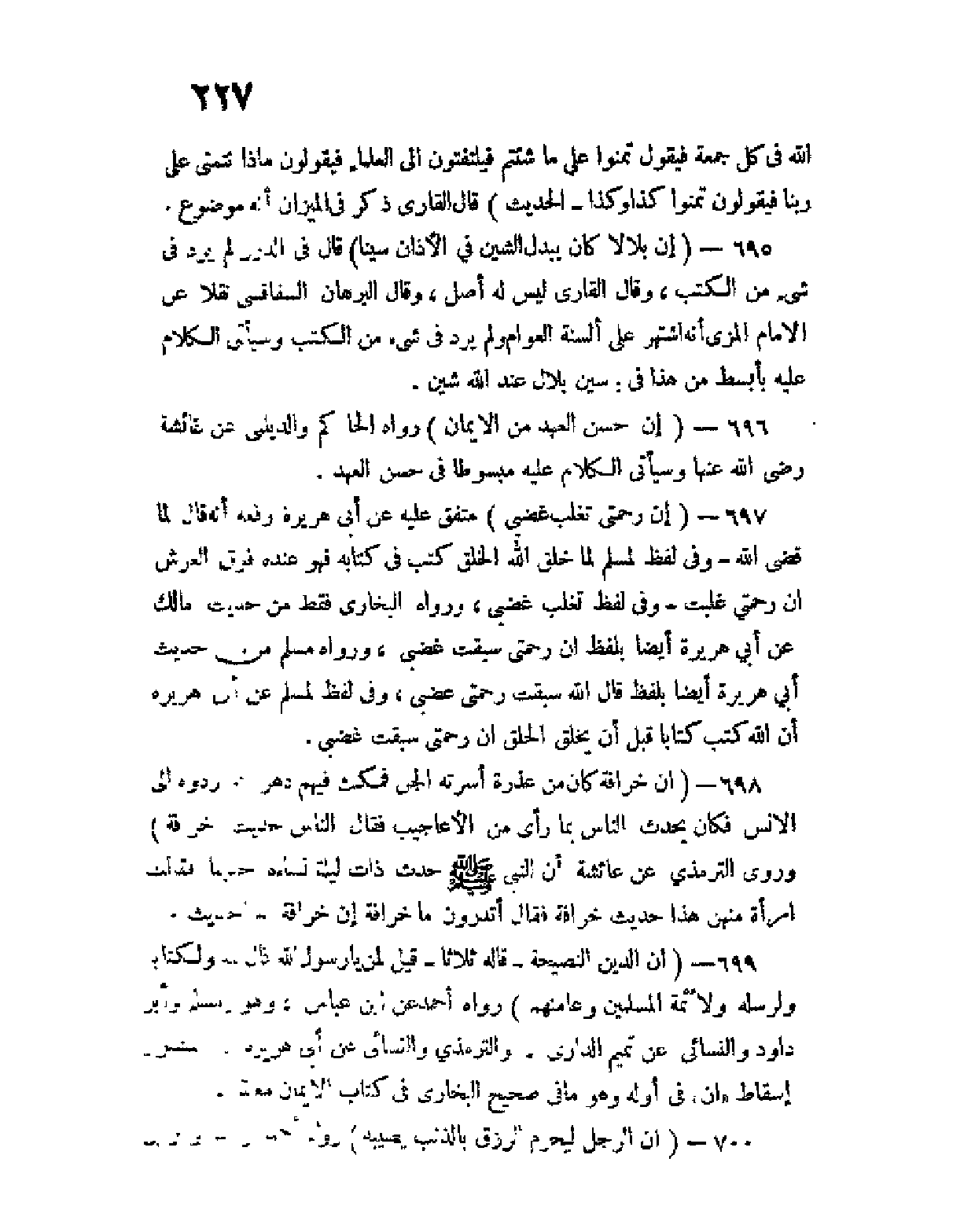 695 - (أن بلالا كان يبدل الشين في الأذان سينا) قال في الدرر لم يرد في شئ من الكتب، وقال القاري ليس له أصل، وقال البرهان السفاقسي نقلا عن الإمام المزي أنه اشتهر على ألسنة العوام ولم يرد في شئ من الكتب وسيأتي الكلام عليه بأبسط من هذا في: سين بلال عند الله شين.