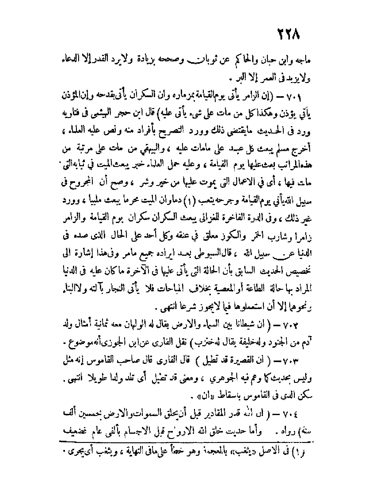 701 - إن الزامر يأتي يوم القيامة بمزماره، وإن السكران يأتي بقدحه، وإن المؤذن يأتي يؤذن، وهكذا كل من مات على شئ يأتي عليه) قال ابن حجر الهيثمي في فتاويه ورد في الحديث ما يقتضي ذلك وورد التصريح بأفراد منه ونص عليه العلماء، أخرج مسلم يبعث كل عبد على ما مات عليه، والبيهقي من مات على مرتبة من هذه المراتب بعث عليها يوم القيامة، وعليه حمل العلماء خبر يبعث الميت في ثيابه التي مات فيها، أي الأعمال التي يموت عليها من خير وشر، وصح أن المجروح في سبيل الله يأتي يوم القيامة وجرحه يثعب (¬1) دما وإن الميت محرما يبعث ملبيا، وورد غير ذلك، وفى الدرة الفاخرة للغزالي: يبعث السكران سكران يوم القيامة، والزامر زامرا، وشارب الخمر والكوز معلق في عنقه، وكل أحد على الحال الذي صده في الدنيا عن سبيل الله، قال السيوطي بعد إيراده جميع ما مر: وفي هذا إشارة إلى تخصيص الحديث السابق بأن الحالة التي يأتي عليها في الآخرة، ما كان عليه في الدنيا المراد بها حالة الطاعة أو المعصية، بخلاف المباحات فلا يأتي النجار بآلته ولا البناء ونحوهما، إلا إن استعملوها فيما لا يجوز شرعا.