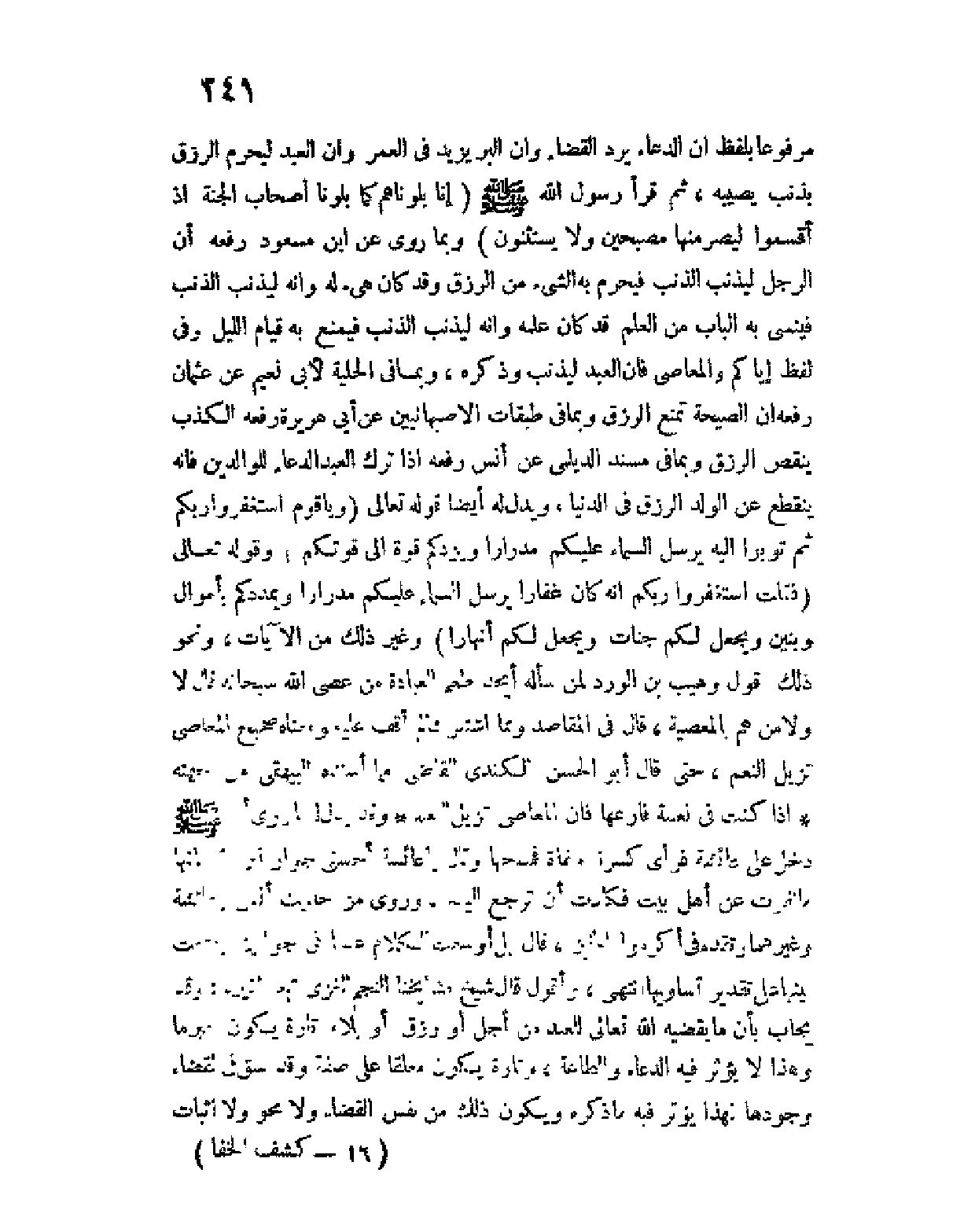 ثم قرأ رسول الله صلى الله عليه وسلم ... (إنا بلوناهم كما بلونا أصحاب الجنة إذ أقسموا ليصرمنها مصبحين ولا يستثنون) ... وبما روى عن ابن مسعود رفعه إن الرجل ليذنب الذنب فيحرم به الشئ من الرزق وقد كان هُيّئَ له، وإنه ليذنب الذنب فينسى به الباب من العلم قد كان علمه، وإنه ليذنب الذنب فيمنع به قيام الليل وفي لفظٍ إياكم والمعاصيَ، فإن العبد ليذنب وذكره، وبما في الحلية لأبي نعيم عن عثمان رفعه ان الصيحة تمنع الرزق، وبما في طبقات الأصبهانيين عن أبي هريرة رفعه الكذب ينقص الرزق وبما في مسند الديلمي عن أنس رفعه: إذا ترك العبد الدعاء للوالدين فإنه ينقطع عن الولد الرزق في الدنيا، ويدل له أيضا قوله تعالى ... (ويا قوم استغفروا ربكم ثم توبوا إليه يرسل السماء عليكم مدرارا ويزدكم قوة إلى قوتكم) ... ، وقوله تعالى ... (فقلت استغفروا ربكم إنه كان غفارا يرسل السماء عليكم مدرارا ويمددكم بأموال وبنين ويجعل لكم جنات ويجعل لكم أنهارا) ... ، وغير ذلك من الآيات، ونحو ذلك قول وُهَيْبِ بن الورد لمن سأله " أيجد طعم العبادة من عصى الله سبحانه "، قال " لا ولا من هم بالمعصية "، قال في المقاصد: ومما اشتهر مما لم أقف عليه، ومعناه صحيحٌ المعاصي تُزيل النِعم، حتى قال أبو الحسن الكندي القاضي مما أسنده البيهقي من جهته إذا كنت في نعمة فارعها ... فإن المعاصي تزيل النعم وقد يدل له ما روى أنه صلى الله عليه وسلم دخل على عائشة فرأى كسرة ملقاة فمسحها وقال: يا عائشة أحسني جوار نعم الله، فإنها ما نفرت عن أهل بيت فكادت أن ترجع إليهم، وروي من حديث أنس وعائشة وغيرهما وتقدم في " أكرموا الخبز "، قال: بل أوسعت الكلام عليها في جوابين وجمعت بينها على تقدير تساويها.