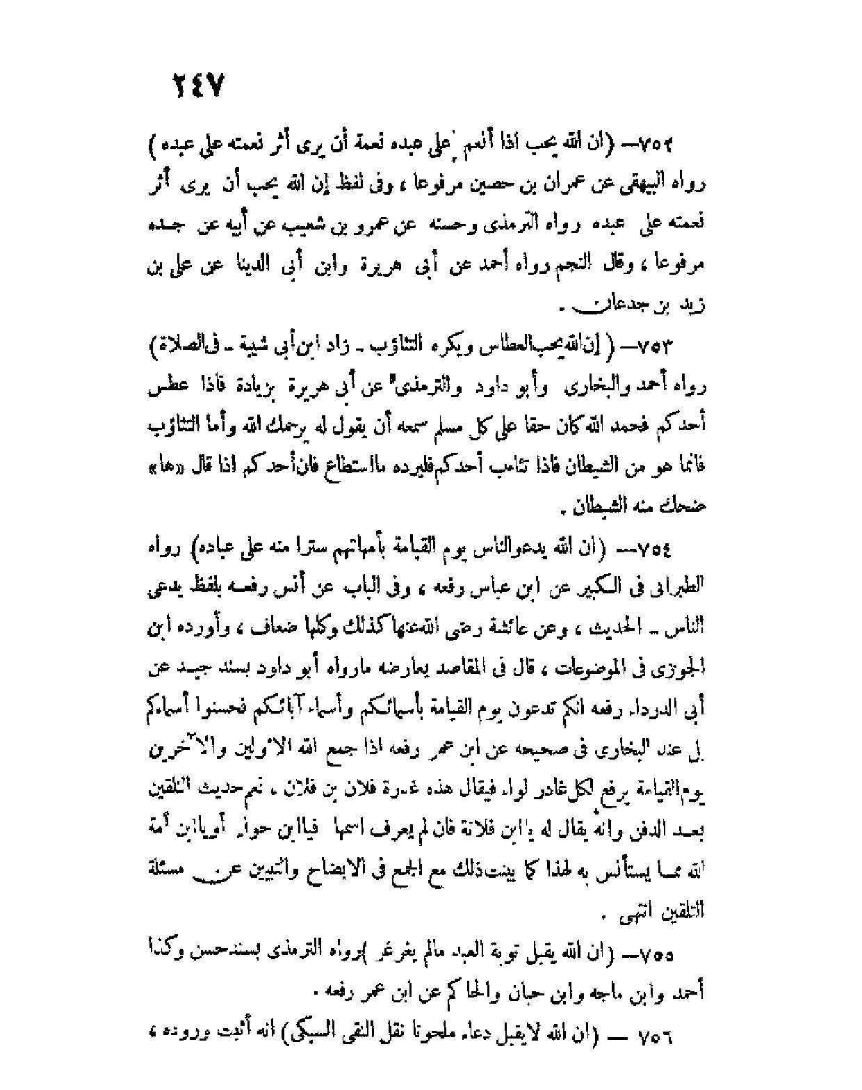 752 - (إن الله يحب إذا أنعم على عبده نعمة أن يرى أثر نعمته على عبده) رواه البيهقي عن عمران بن حصين مرفوعا، وفي لفظ إن الله يحب أن يرى أثر نعمته على عبده رواه الترمذي وحسنه عن عمرو بن شعيب عن أبيه عن جده مرفوعا، وقال النجم رواه أحمد عن أبي هريرة وابن أبي الدنيا عن علي بن زيد بن جدعان.