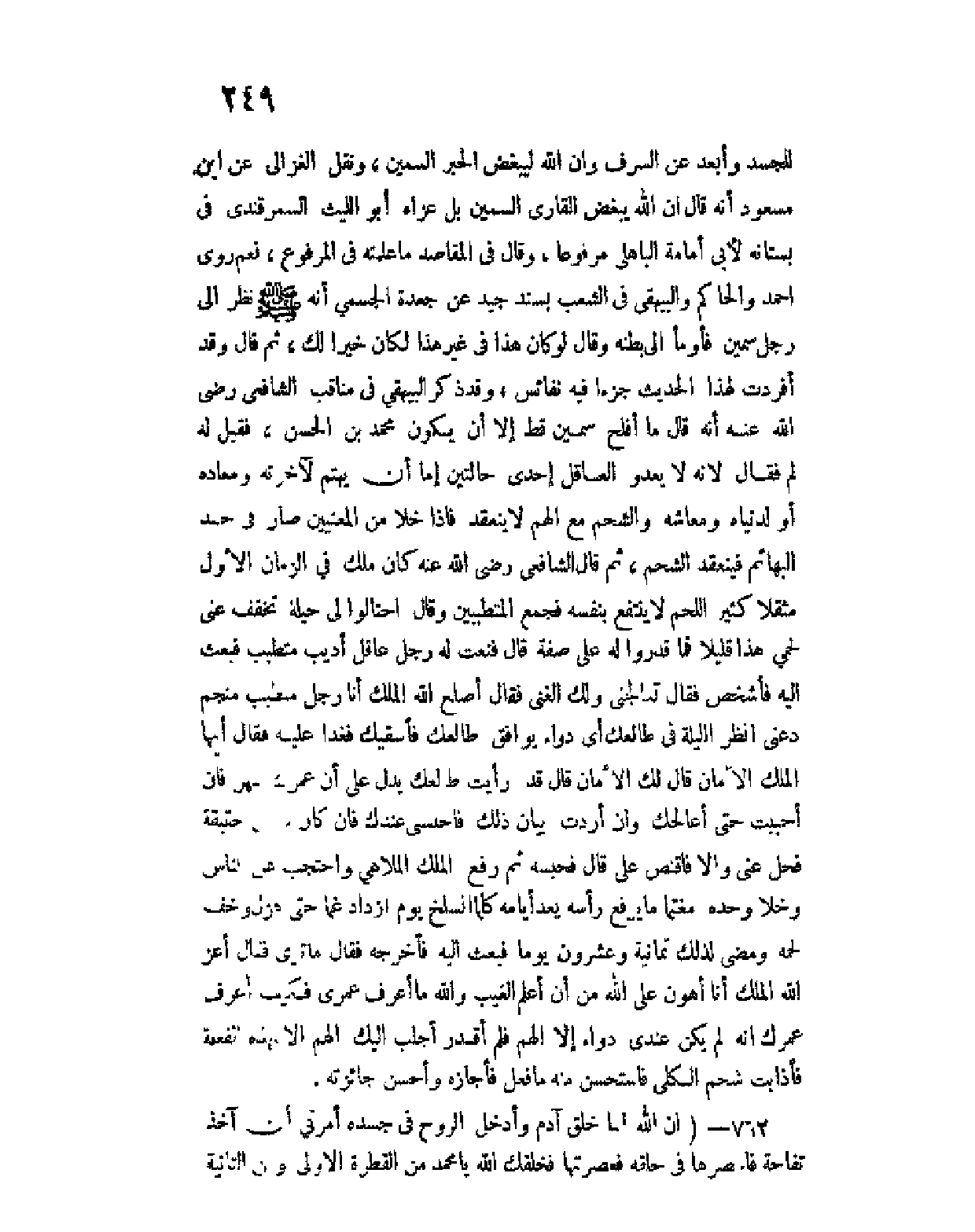 للجسد وأبعد عن السرف وإن الله ليبغض الحبر السمين، ونقل الغزالي عن ابن مسعود أنه قال إن الله يبغض القاري السمين بل عزاه أبو الليث السمرقندي في بستانه لأبي أمامة الباهلي مرفوعا، وقال في المقاصد ما علمته في المرفوع، نعم روى أحمد والحاكم والبيهقي في الشعب بسند جيد عن جعدة الجُشمي أنه صلى الله عليه وسلم نظر إلى رجل سمين فأومأ إلى بطنه وقال لو كان هذا في غير هذا لكان خير لك، ثم قال وقد أفردت لهذا الحديث جزاءً فيه نفائس، وذكر البيهقي في مناقب الشافعي رضي الله عنه أنه قال ما أفلح سمين قطُّ إلا أن يكون محمد بن الحسن، فقيل له لم فقال لأنه لا يعدو العاقل إحدى حالتين إما أن يهتم لآخرته ومعاده أو لدنياه ومعاشه والشحم مع الهم لا ينعقد فإذا خلا من المعنيين صار في حد البهائم فينعقد الشحم، ثم قال الشافعي رضي الله عنه كان مَلِك في الزمان الأول مثقلا كثير اللحم لا ينتفع بنفسه فجمع المتطببين وقال احتالوا لي حيلة تخفف عني لحمي هذا قليلا فما قدروا له على صفة قال فنُعت له رجل عاقل أديب متطبب فبعث إليه فأشخص فقال تعالجني ولك الغنى فقال أصلح الله الملك أنا رجل متطبب منجم دعني أنظر الليلة في طالعك أي دواء يوافق طالعك فأسقيك فغدا عليه فقال أيها الملك الأمان قال لك الأمان قال قد رأيت طالعك يدل على أن عمرك شهر فإن أحببت حتى أعالجك وإن أردت بيان ذلك فاحبسني عندك فإن كان لقولي حقيقة فحل عني وإلا فاقتص علي قال فحبسه ثم رفع الملك الملاهي واحتجب عن الناس وخلا وحده مغتما ما يرفع رأسه يعد أيامه كلما انسلخ يوم ازداد غما حتى هزل وخف لحمه ومضى لذلك ثمانية وعشرون يوما فبعث إليه فأخرجه فقال ما ترى فقال أعز الله الملك أنا أهون على الله من أن أعلم الغيب والله ما أعرف عمري فكيف أعرف عمرك أنه لم يكن عندي دواء إلا الهم فلم أقدر أجلب إليك الهم إلا بهذه الفعلة فأذابت شحم الكلى فاستحسن منه ما فعل فأجازه وأحسن جائزته.