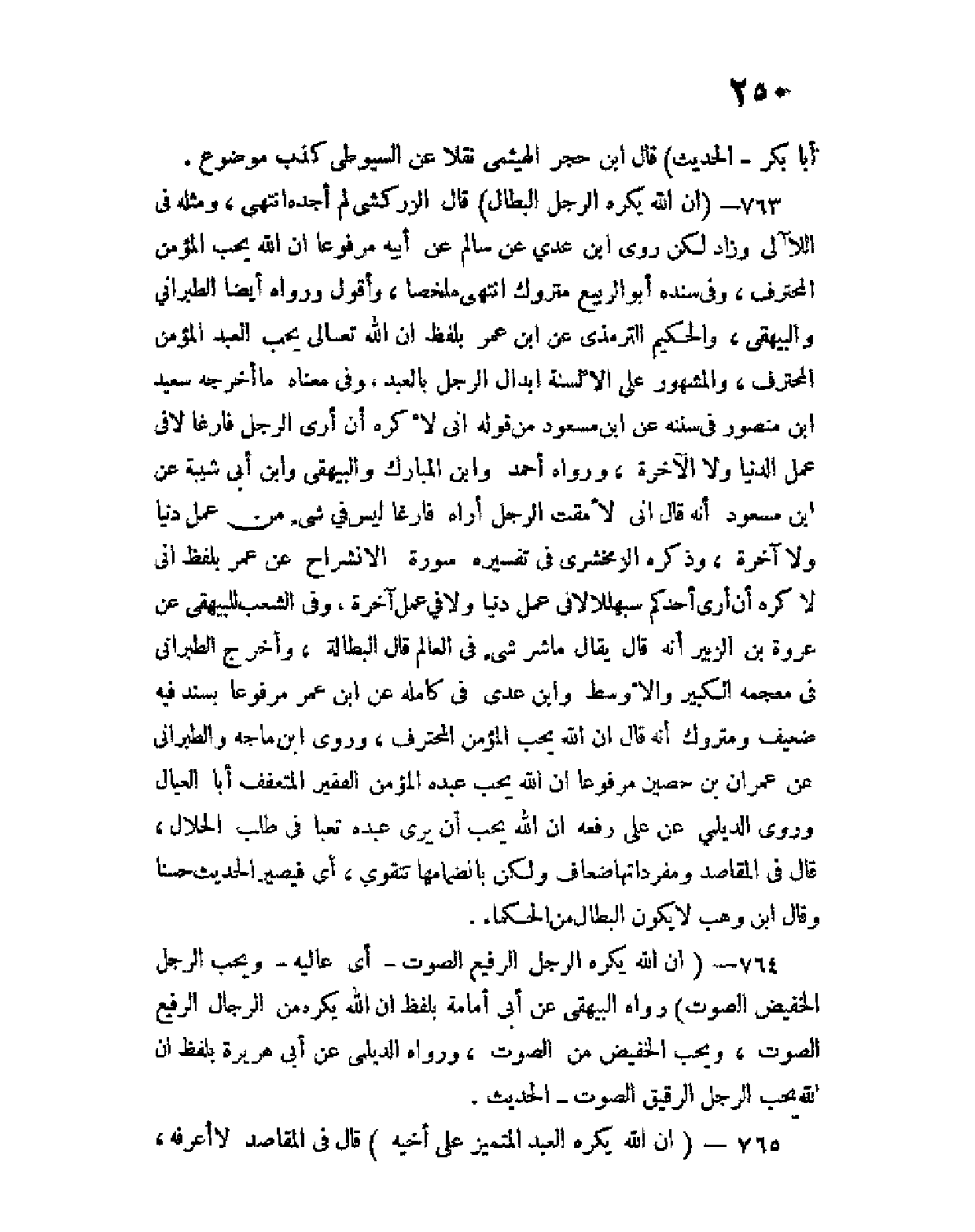763 - (إن الله يكره الرجل البَطَّال) قال الزركشي لم أجده انتهى، ومثله في اللآلئ وزاد لكن روى ابن عدي عن سالم عن أبيه مرفوعا: أن الله يحب المؤمن المحترف، وفي سنده أبو الربيع متروك انتهى ملخصا، وأقول ورواه أيضا الطبراني والبيهقي، والحكيم الترمذي عن ابن عمر بلفظ: أن الله تعالى يحب العبد المؤمن المحترف، والمشهور على الألسنة إبدال " الرجل " ب " العبد "، وفي معناه ما أخرجه سعيد ابن منصور في سننه عن ابن مسعود من قوله إني لأكره الرجل فارغا لا في عمل الدنيا ولا الآخرة، ورواه أحمد وابن المبارك والبيهقي وابن أبي شيبة عن ابن مسعود أنه قال إني لأمقت الرجل أراه فارغا ليس في شئ من عمل الدنيا ولا آخرة، وذكره الزمخشري في تفسيره سورة الانشراح عن عمر بلفظ إني لأكره أن أرى أحدكم سَبَهْللا لا في عمل دنيا ولا في عمل آخرة، وفي الشعب للبيهقي عن عروة بن الزبير أنه قال يقال ما شر شئ في العالم قال البطالة، وأخرج الطبراني في معجمه الكبير والأوسط وابن عدي في كامله عن ابن عمر مرفوعا بسند فيه ضعيف ومتروك أنه قال إن الله يحب المؤمن المحترف، وروى ابن ماجه والطبراني عن عمران بن حصين مرفوعا: أن الله يحب عبده المؤمن الفقير المتعفف أبا العيال وروى الديلمي عن علي رفعه: إن الله يحب أن يرى عبده تعبا في طلب الحلال، قال في المقاصد ومفرداتها ضعاف ولكن بانضمامها تتقوَّى، أي فيصير الحديث حسنا وقال ابن وهب لا يكون البطال من الحكماء.