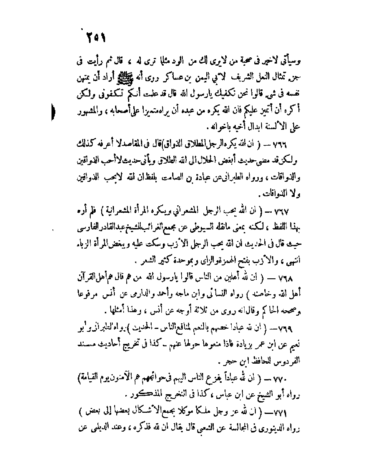 767 - (إن الله يحب الرجل المَشْعَراني ويكره المرأة المشعرانية) فلم أره بهذا اللفظ، لكنه بمعنى ما نقله السيوطي عن مجمع الغرائب للشيخ عبد القادر الفارسي حيث قال: إن الله يحب الرجل الأزَبّ وسكت عليه ويبغض المرأة الزَبّاء انتهى، والأزب بفتح الهمزة والزاي وبموحدة كثير الشعر.