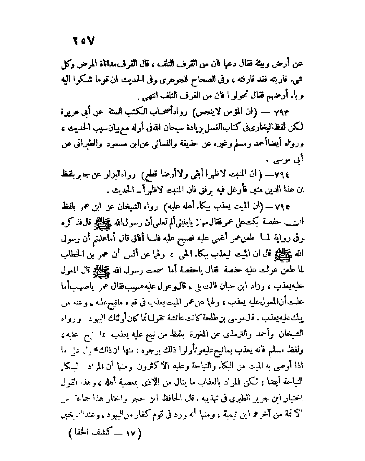 795 - (إن الميت يُعَذَبُ ببكاء أهله عليه) رواه الشيخان عن ابن عمر بلفظ إن حفصة بكت على عمر فقال مهلا يا بنيتي ألم تعلمي أن رسول الله صلى الله عليه وسلم قال فذكره وفي رواية لما طعن عمر أغمى عليه فصيح عليه فلما أفاق قال أما علمتم أن رسول الله صلى الله عليه وسلم قال إن الميت ليعذب ببكاء الحي، ولهما عن أنس إن عمر بن الخطاب لما طعن عوّلَتْ عليه حفصة فقال يا حفصة أما سمعت رسول الله صلى الله عليه وسلم قال المعول عليه يعذب، وزاد ابن حبان قالت بلى، قال وعول عليه صهيب فقال عمر يا صهيب أما علمت أن المعول عليه يُعذّبَ، ولهما عن عمر الميت يعذب في قبره ما نيح عليه، وعنه من يُبْكَ عليه يعذب، قال موسى بن طلحة كانت عائشة تقول إنما كان أولئك اليهود، ورواه الشيخان وأحمد والترمذي عن المغيرة بلفظ من نيح عليه يعذب بما نيح عليه، ولفظ مسلم فإنه يعذب بما نيح عليه وتأولوا ذلك بوجوه: منها أن ذلك محمول على ما إذا أوصى به الميت من البكاء والنياحة وعليه الأكثرون ومنها أن المراد بالبكاء النياحة أيضا، لكن المراد بالعذاب ما ينال من الأذى بمعصية أهله، وهذا القول اختيار ابن جرير الطبري في تهذيبه، قال الحافظ ابن حجر واختار هذا جماعة من الأئمة من آخرهم ابن تيمية، ومنها أنه ورد في قوم كفار من اليهود، وعند الشيخين