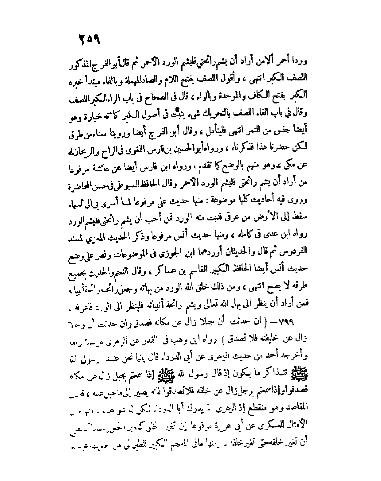 وردا أحمر ألا من أراد أن يشم رائحتي فليشم الورد الأحمر ثم قال أبو الفرج المذكور اللصف الكبر انتهى، وأقول اللصف بفتح اللام والصاد المهملة وبالفاء مبتدأ خبره الكبر بفتح الكاف الموحدة وبالراء، قال في الصحاح في باب الراء الكبر اللصف وقال في باب الفاء اللصف بالتحريك شئ ينبت في أصول الكبر كأنه خيارة وهو أيضا جنس من التمر انتهى فليتأمل، وقال أبو الفرج أيضا وروينا معناه من طرق لكن حضرنا هذا فذكرناه، ورواه أبو الحسين بن فارس اللغوي في الراح والريحان له عن مكي، وهو متهم بالوضع كما تقدم، ورواه ابن فارس أيضا عن عائشة مرفوعا من أراد أن يشم رائحتي فليشم الورد الأحمر وقال الحافظ السيوطي في حسن المحاضرة، وروى فيه أحاديث كلها موضوعة: منها حديث علي مرفوعا لما أسري بي إلى السماء سقط إلى الأرض من عرقي فنبت منه الورد فمن أحب أن يشم رائحتي فليشم الورد رواه ابن عدي في كامله، ومنها حديث أنس مرفوعا وذكر الحديث المُعزّى لمسند الفردوس ثم قال والحديثان أوردهما ابن الجوزي في الموضوعات ونص على وضع حديث أنس أيضا الحافظ الكبير القاسم بن عساكر، وقال النجم والحديث بجميع طرقه لا يصح انتهى، ومن ذلك خلق الله الورد من بهائه وجعل رائحته رائحة أنبيائه فمن أراد أن ينظر إلى بهاء الله تعالى ويشم رائحة أنبيائه فلينظر إلى الورد فاعرفه.