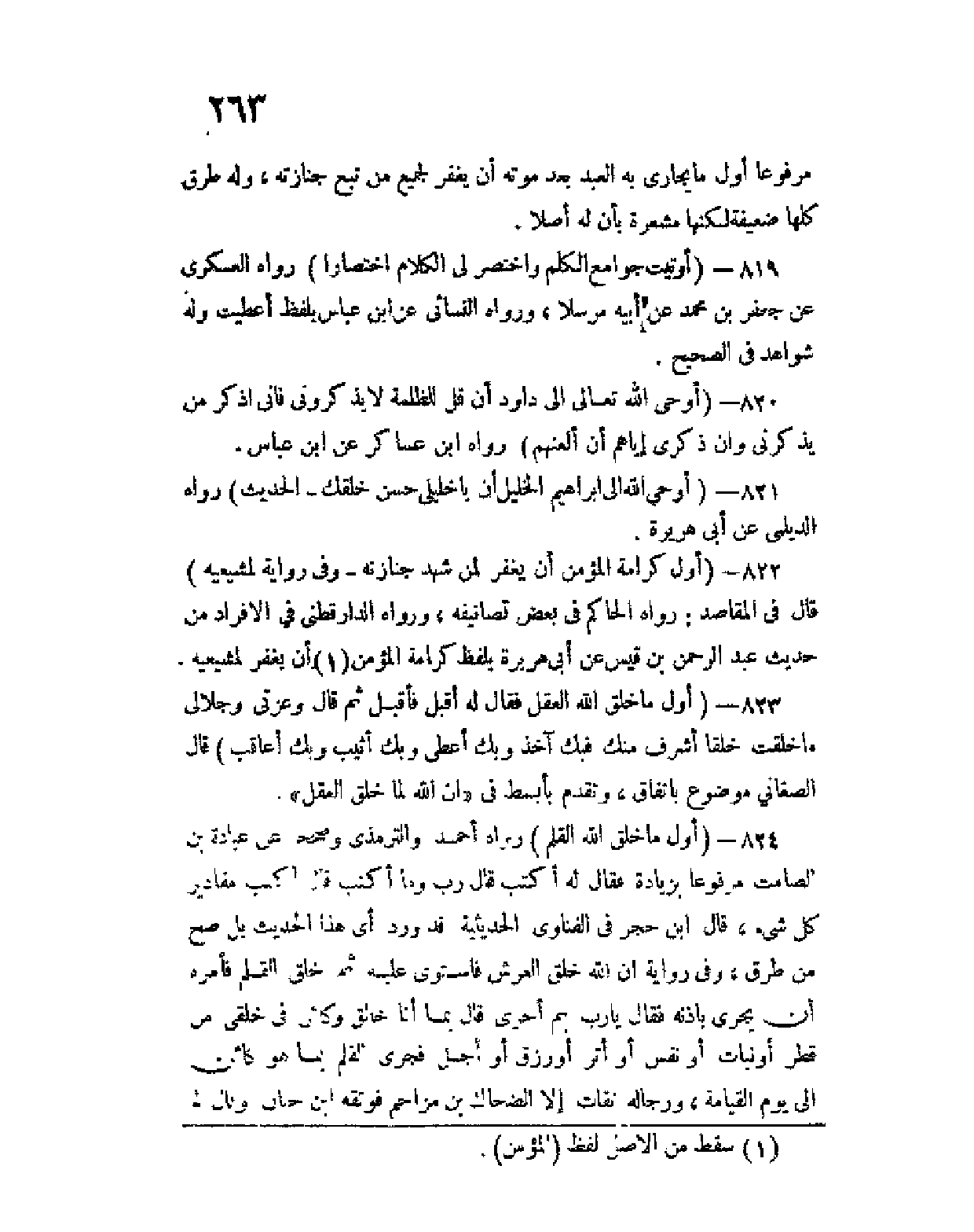 819 - (أوتيت جوامع الكلم واختصر لي الكلام اختصارا) رواه العسكري عن جعفر بن محمد عن أبيه مرسلا، ورواه النسائي عن ابن عباس بلفظ أعطيت وله شواهد في الصحيح.