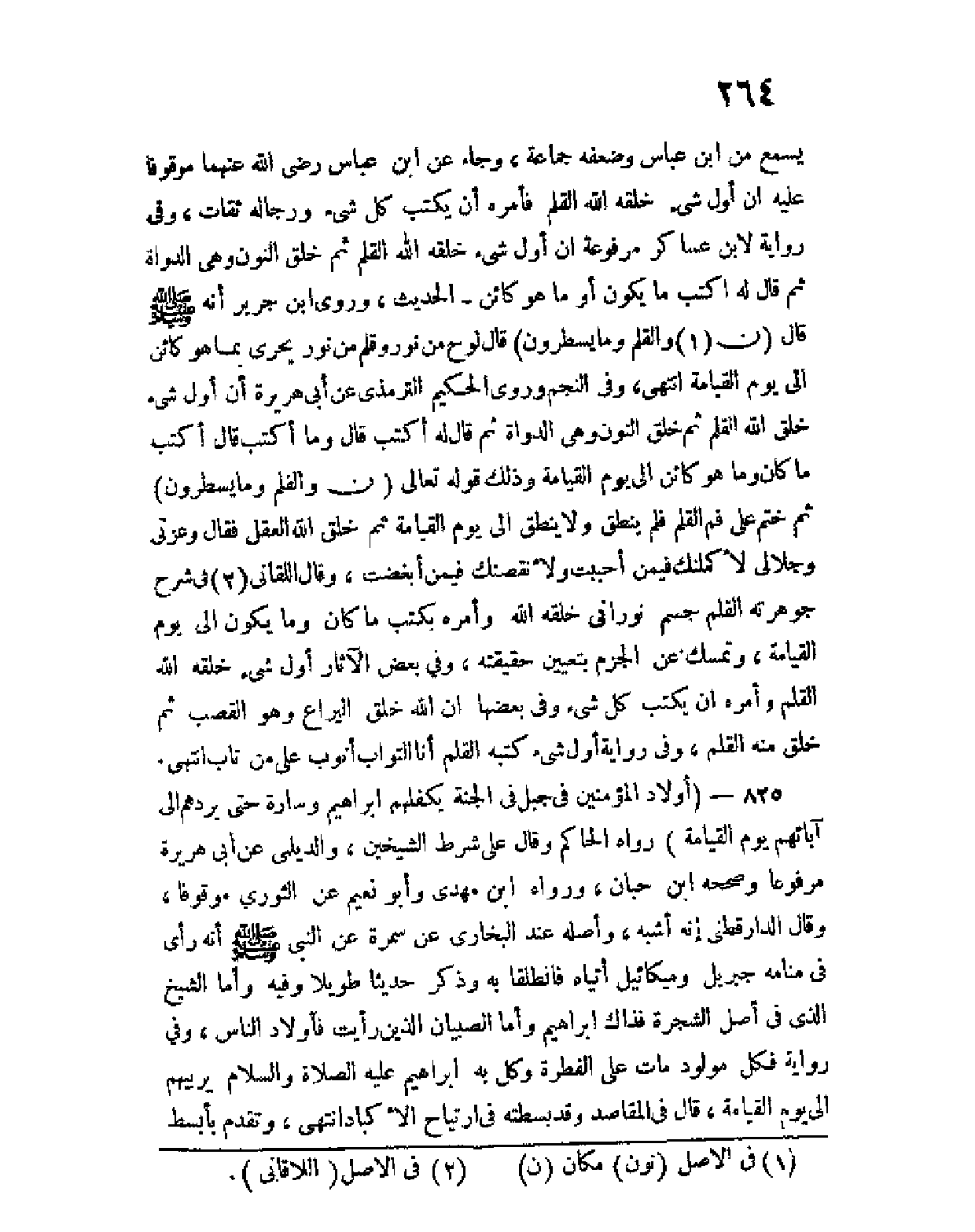 يسمع من ابن عباس وضعفه جماعة، وجاء عن ابن عباس رضي الله عنهما موقوفا عليه: إن أول شئ خلقه الله القلم فأمره أن يكتب كل شئ ورجاله ثقات، وفي رواية لابن عساكر مرفوعة إن أول شئ خلقه الله القلم ثم خلق النون وهي الدواة ثم قال له اكتب ما يكون أو ما هو كائن - الحديث، وروى ابن جرير أنه صلى الله عليه وسلم قال ... (ن (¬1) والقلم وما يسطرون) ... قال لوح من نور وقلم من نور يجري بما هو كائن إلى يوم القيامة انتهى، وفي النجم روى الحكيم الترمذي عن أبي هريرة أن أول شئ خلق الله القلم ثم خلق النون وهي الدواة ثم قال له اكتب قال وما أكتب قال أكتب ما كان وما هو كائن إلى يوم القيامة وذلك قوله تعالى ... (ن والقلم وما يسطرون) ... ثم ختم على فم القلم فلم ينطق ولا ينطق إلى يوم القيامة ثم خلق الله العقل فقال وعزتي وجلالي لأكْمِلَنَّكَ فيمَن أحببتُ ولأنقصنك فيمن أبغضت، وقال اللقاني (¬2) في شرح جوهرته القلم جسم نوراني خلقه الله وأمره بكتب ما كان وما يكون إلى يوم القيامة، وتمسك عن الجزم بتعيين حقيقته، وفي بعض الآثار أول شئ خلقه الله القلم وأمره أن يكتب كل شئ وفي بعضها أن الله خلق اليراع وهو القصب ثم خلق منه القلم، وفي رواية أول شئ كتبه القلم أنا التواب أتوب على من تاب انتهى.