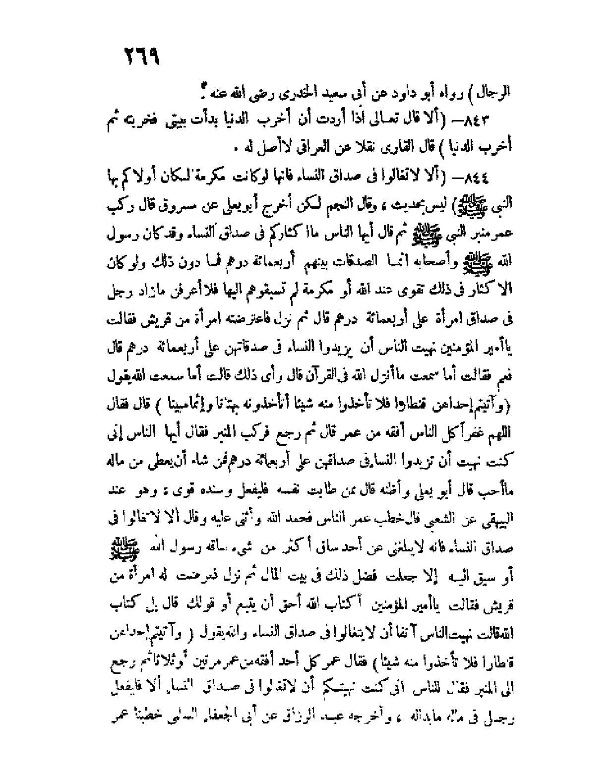 844 - (ألا لا تغالوا في صداق النساء فإنها لو كانت مكرمة لكان أولاكم بها النبي صلى الله عليه وسلم) ليس بحديث، وقال النجم لكن أخرج أبو يعلى عن مسروق قال ركب عمر منبر النبي صلى الله عليه وسلم ثم قال أيها الناس ما إكثاركم في صداق النساء؟ وقد كان رسول